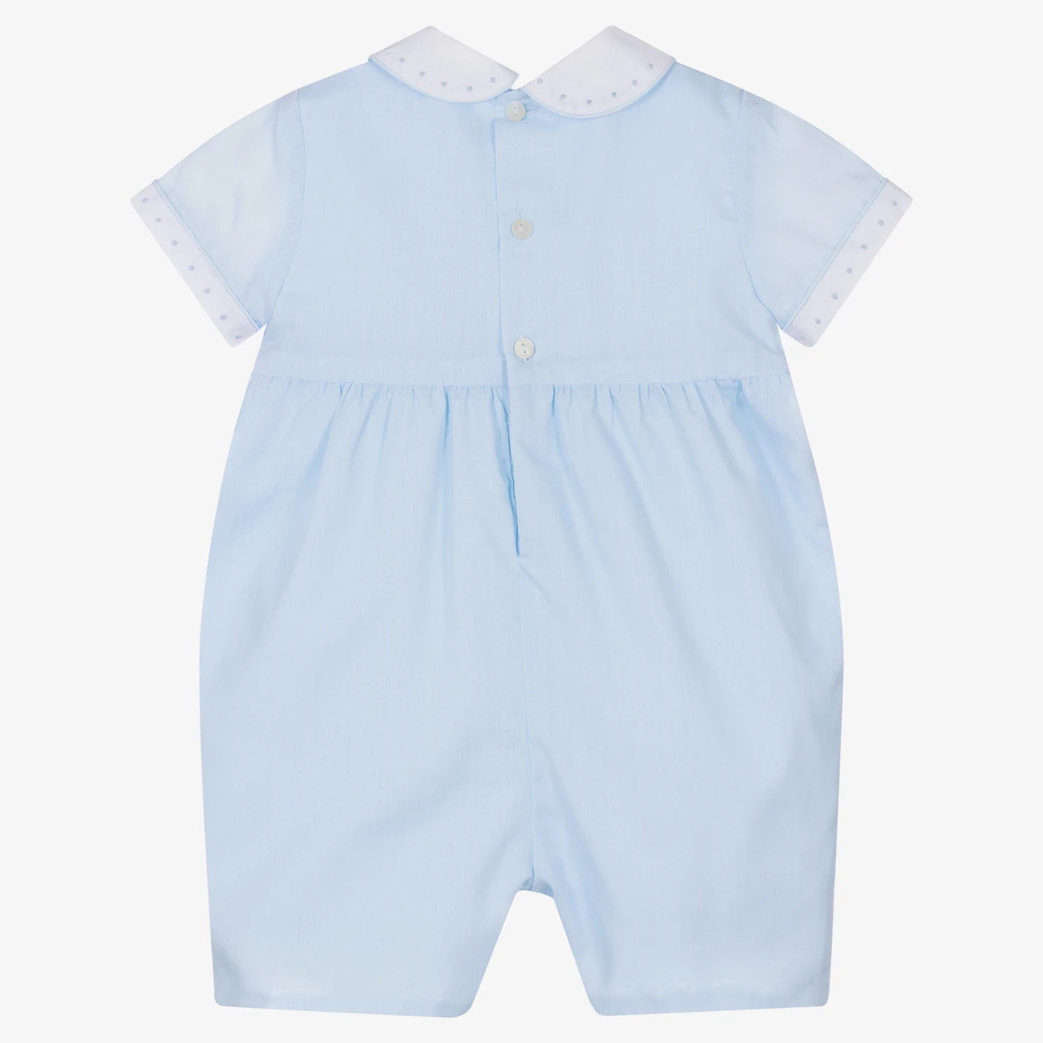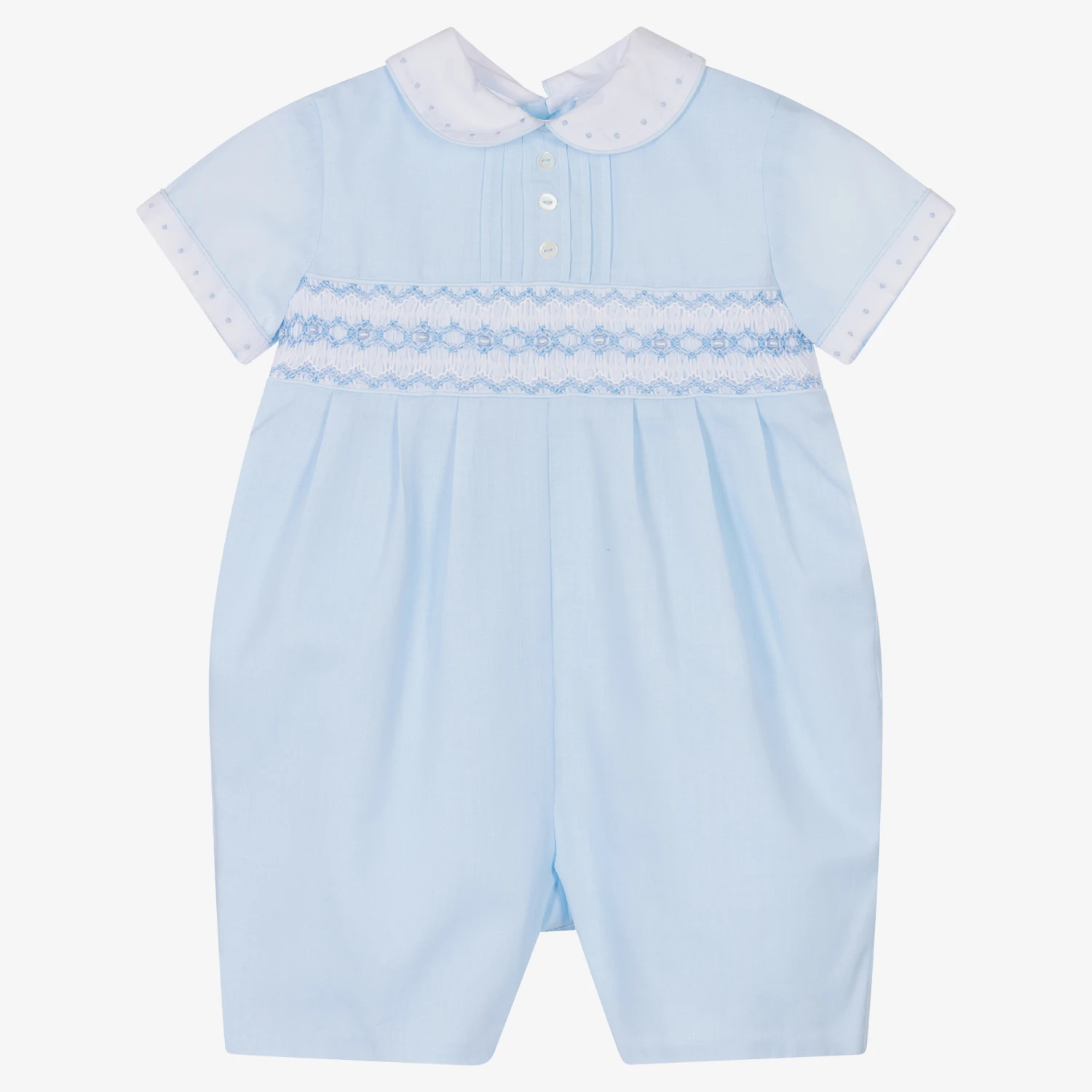 A lovely blue shortie for baby boys by Sarah Louise, with smart pintucks and decorative buttons on the bodice. It has a white chest panel with traditional hand smocking and hand embroidery in blue, with delicately embroidered dots along the collar and cuffs. Made in a double layer of smooth lightweight cotton, the babysuit fastens with buttons down the back and between the legs.