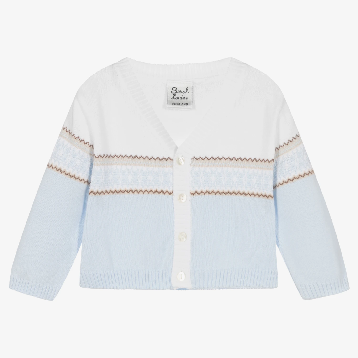 A timeless blue and white cardigan by Sarah Louise, for little boys, knitted in soft cotton. This piece has a subtle textured garter stich across the body, trimmed with a brown zigzag pattern for a vintage-inspired look. Ideal for layering, this piece fastens with pearlescent buttons on the front.