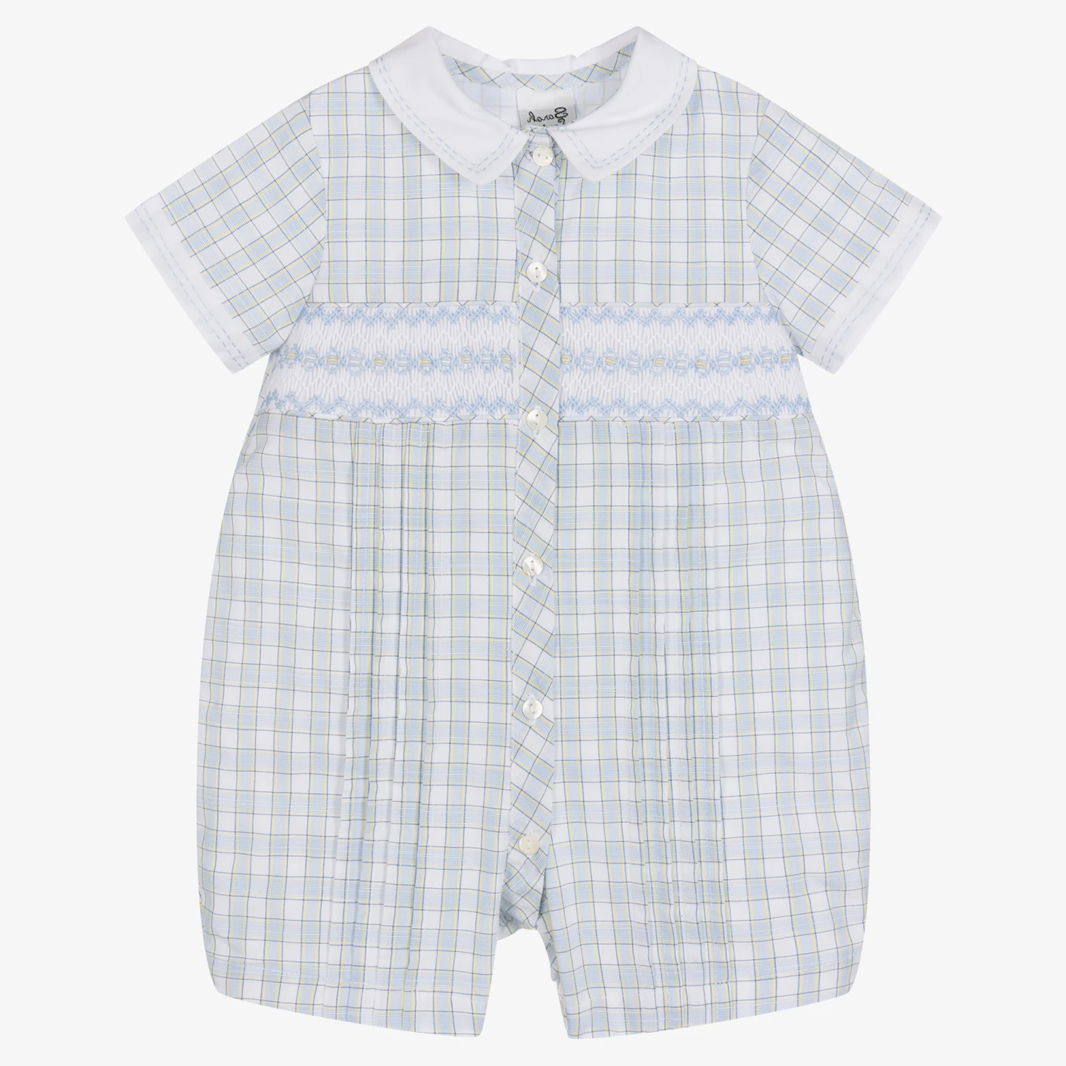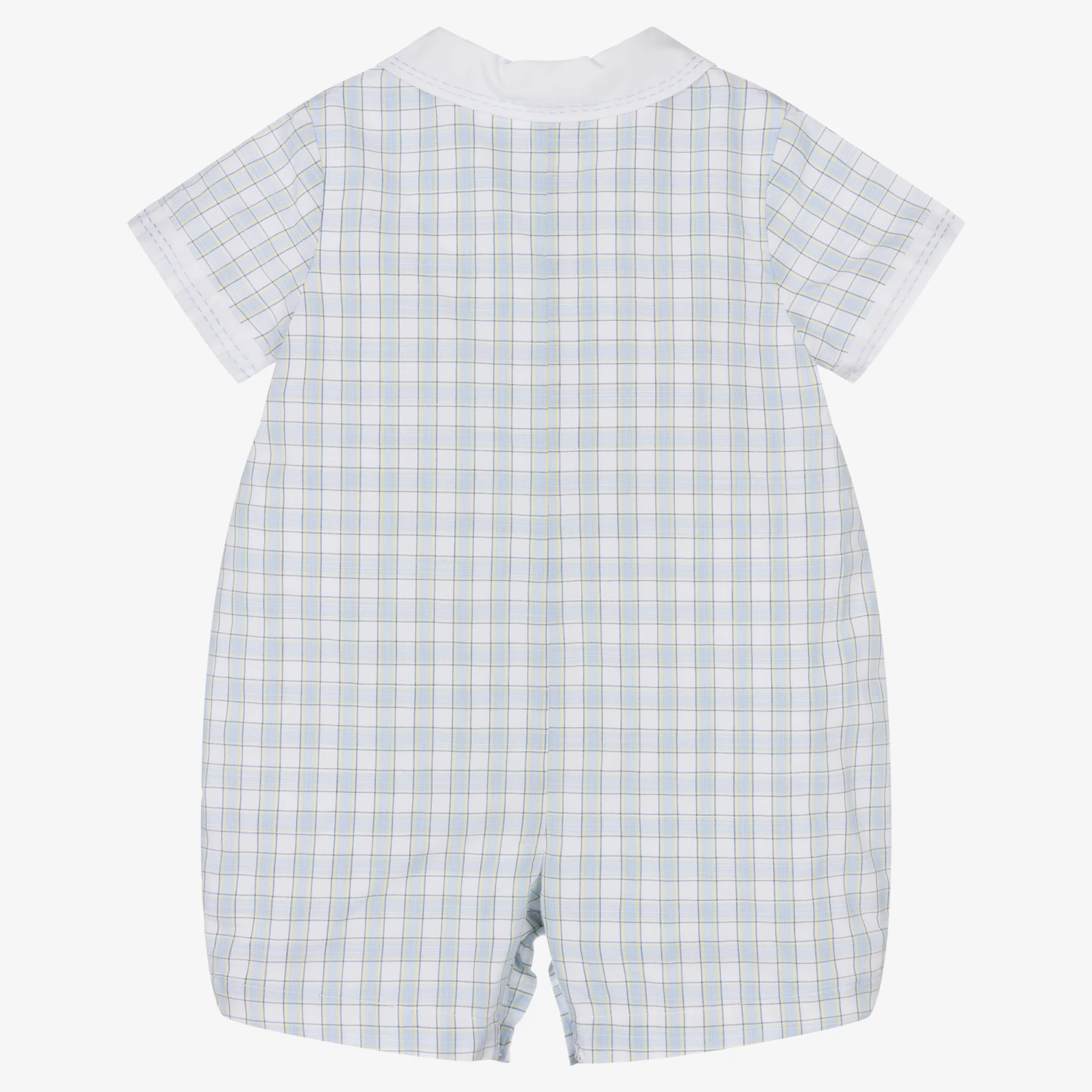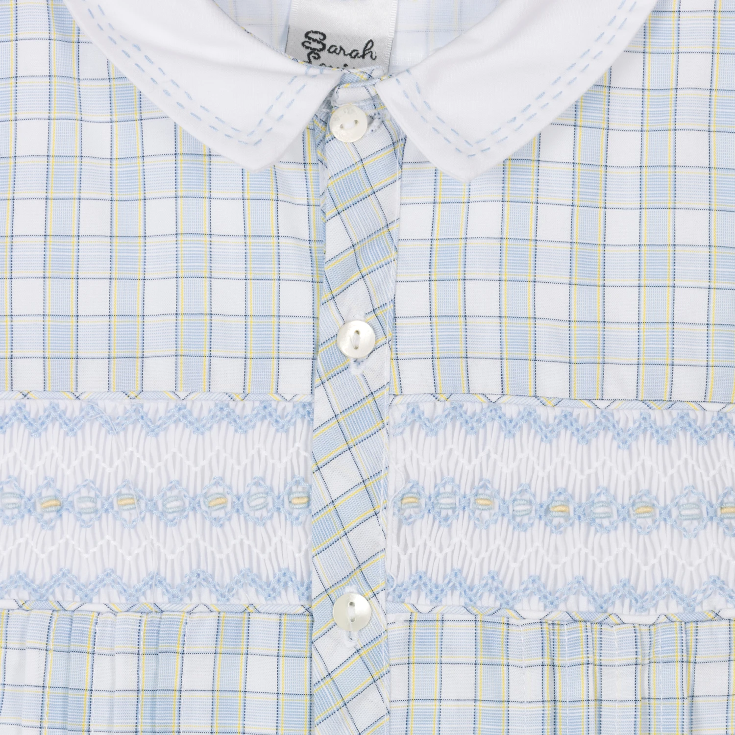 In a blue, yellow and white check, this lovely shortie for baby boys is by Sarah Louise. It has traditional hand smocking and hand embroidery across the chest, with blue stitching detail along the collar and cuffs. Woven in smooth cotton and fully lined, this comfortable babysuit fastens with buttons down the front and between the legs.