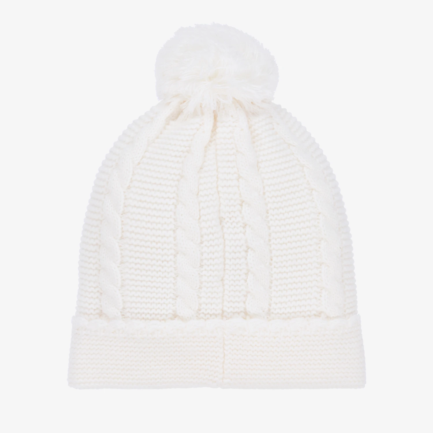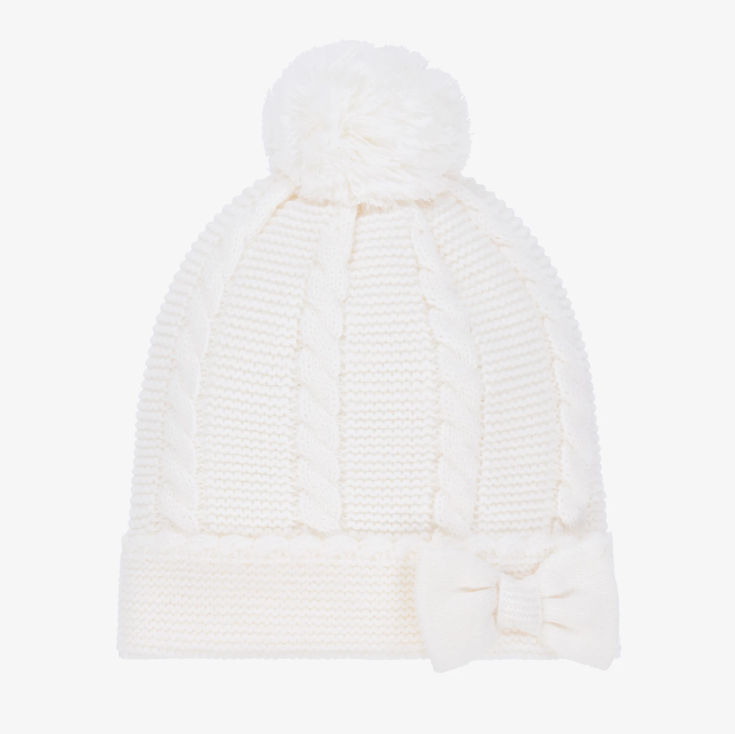 Ivory knitted hat for baby girls by Sarah Louise. Warm and cosy, there is a cable knit pattern fluffy pom-pom on the top. It has a bow and sweet scalloped edge on the turn-up brim.