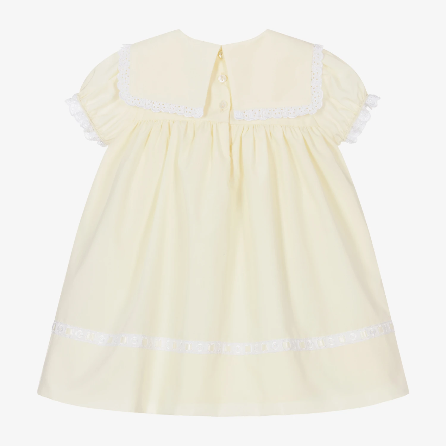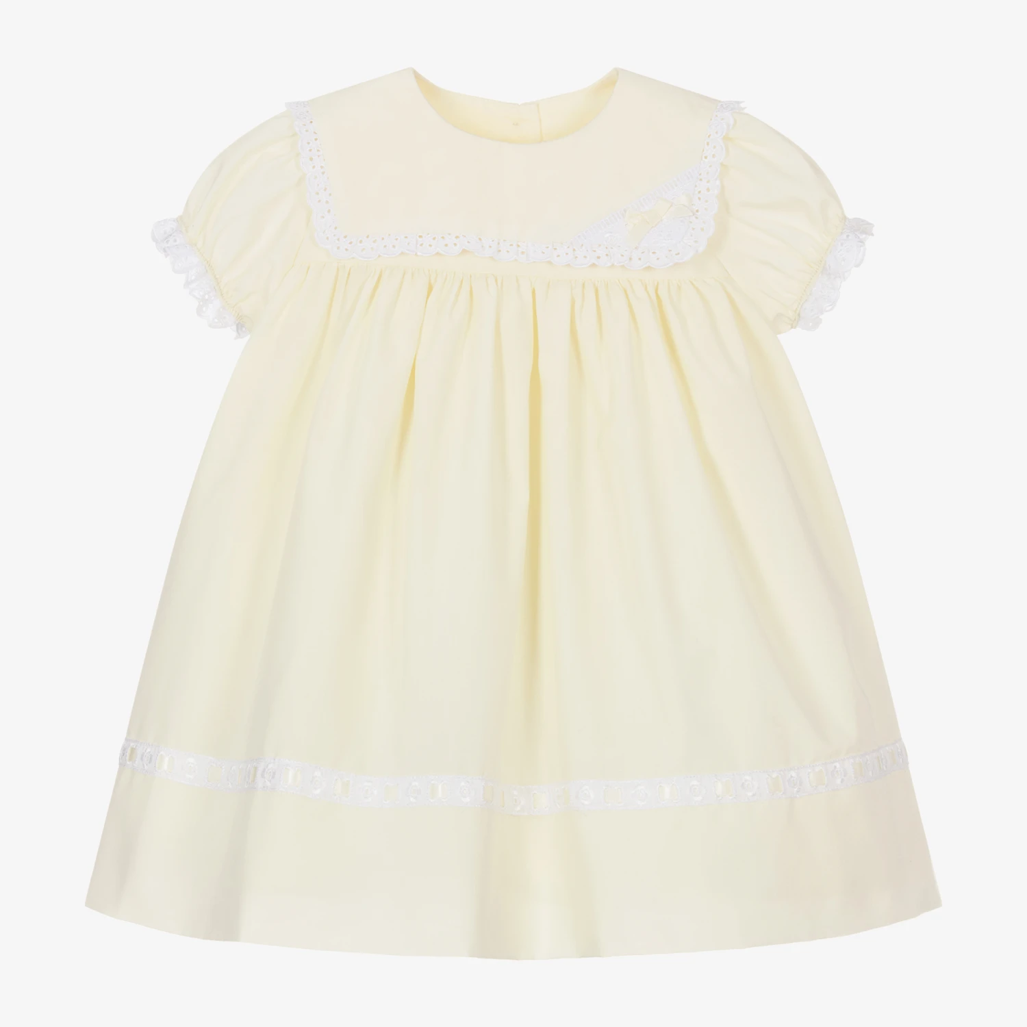 Lovely pale yellow dress for baby girls by Sarah Louise, woven in a soft and lightweight cotton blend fabric. Fastening with buttons on the back, this classic dress has a puffed sleeves and a bib front, both trimmed with white broderie anglaise ruffles. It is fully lined for added comfort and modesty.