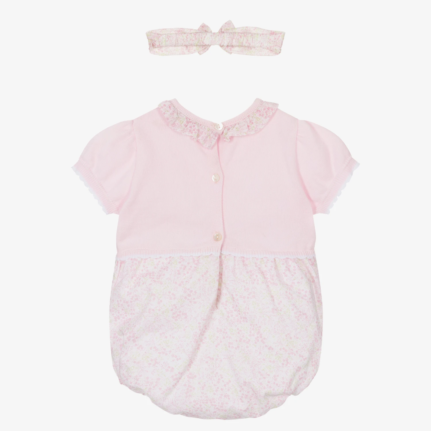 A pretty pink shortie and headband set for baby girls by Sarah Louise. The upper part of the shortie is knitted in soft cotton, with ribbon and embroidery detailing, and a feminine ruffle collar. The lined lower part is woven in a soft cotton blend and patterned in a delicate pink and green floral print. This lovely babysuit fastens with buttons on the back and between the elasticated legs The matching headband has a sweet bow on the front and is elasticated for a good fit.