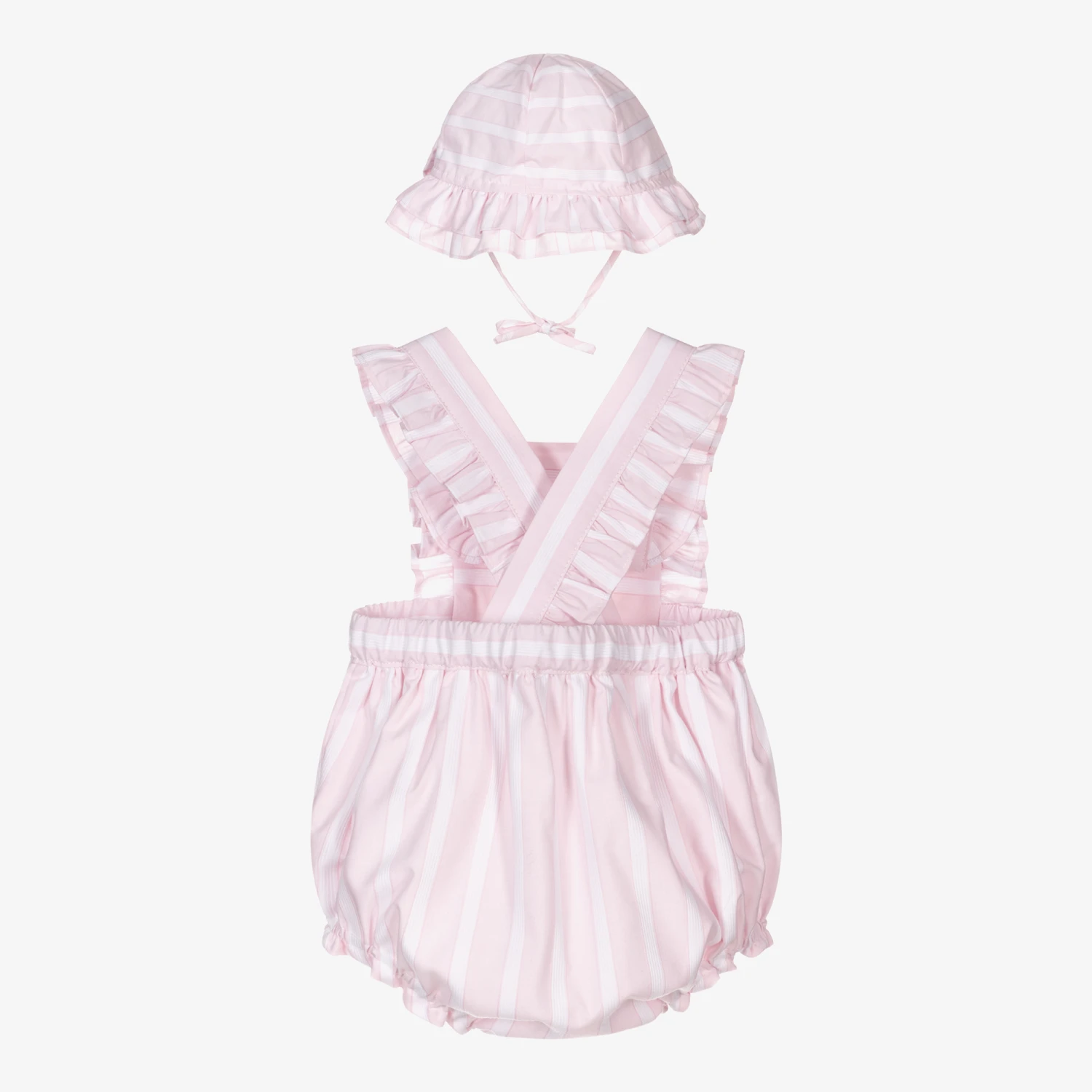 Sweet pink shortie and hat set for baby girls by Sarah Louise. Made in soft polycotton and fully lined, both pieces have a white textured stripe and pretty ruffled trim. The shortie has button-fastening shoulder straps and the hat has a detachable tie that fastens under the chin.