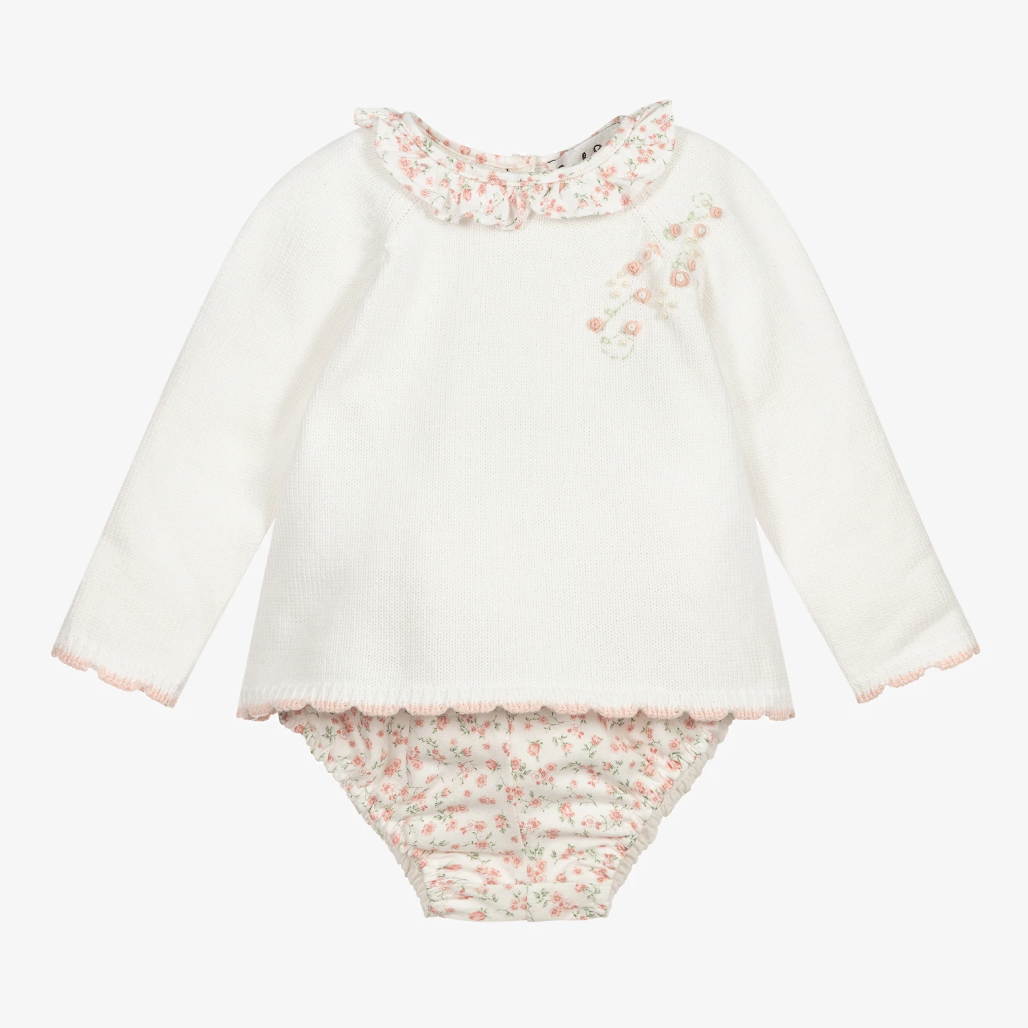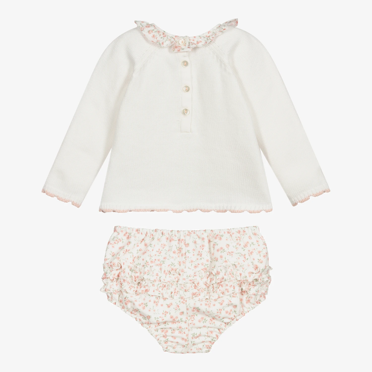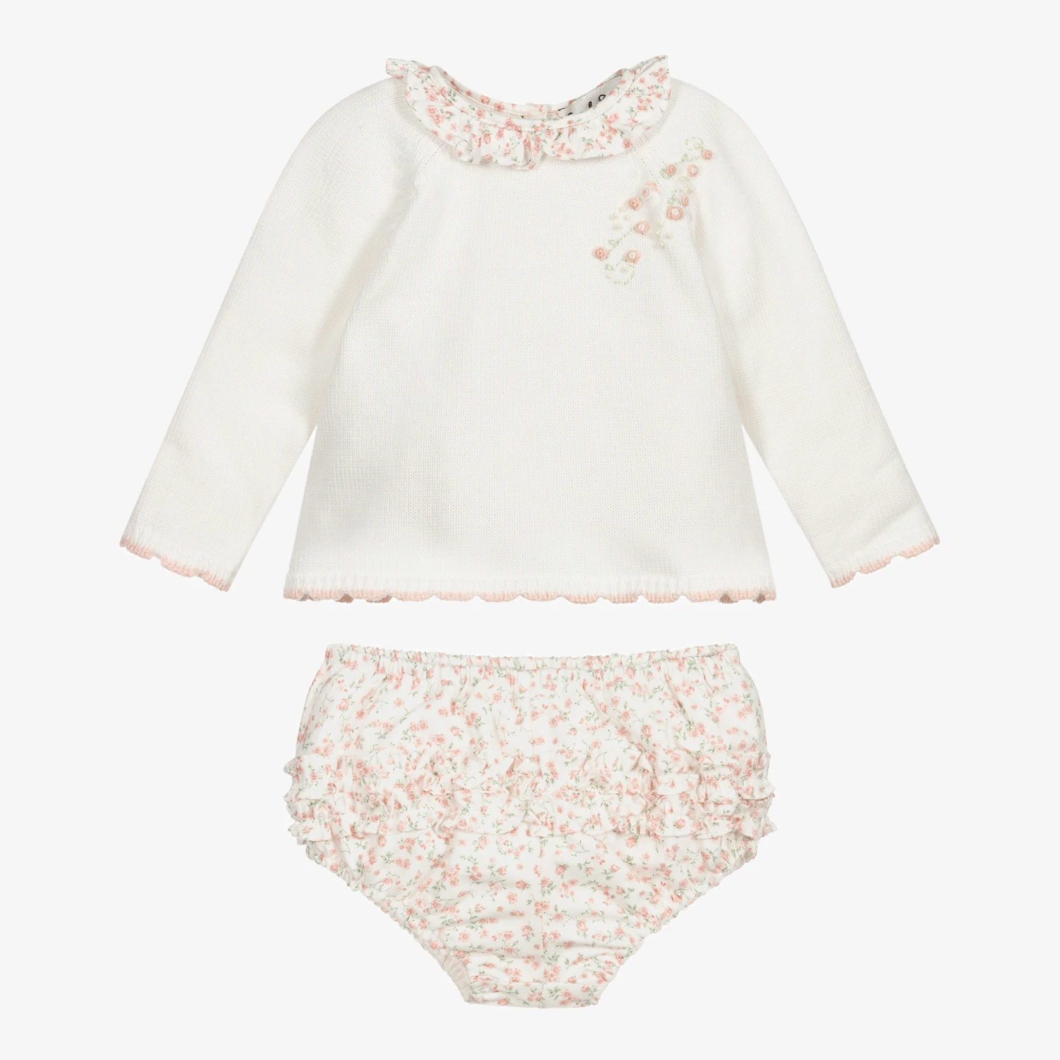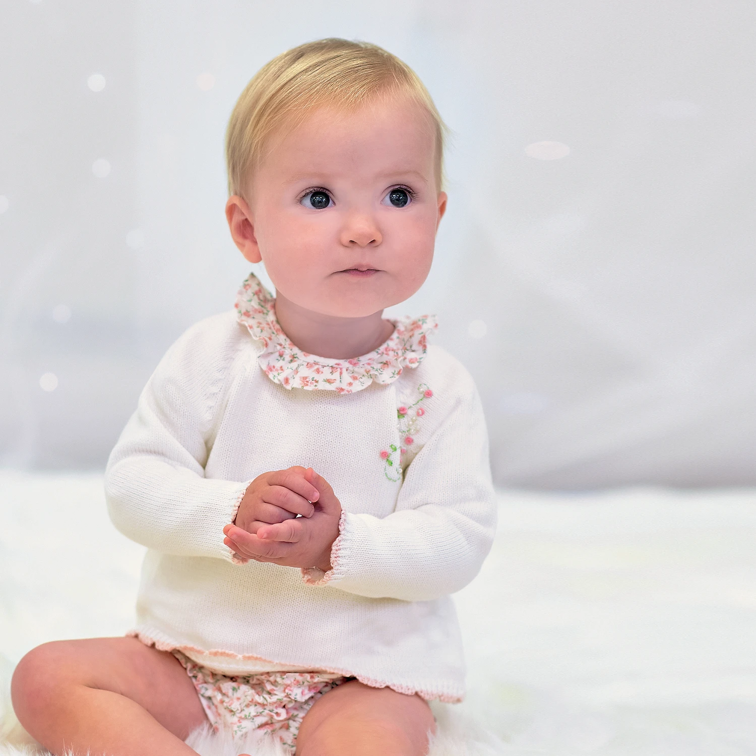Pale ivory and pink shorts set for baby girls, by Sarah Louise. Made from soft knitted cotton, the top has a pretty floral ruffle collar, a delicately embroidered floral design on the shoulder, and pale pink picot trims. It comes with a matching pair of pink floral knickers with a lovely ruffle trim to complete the look.