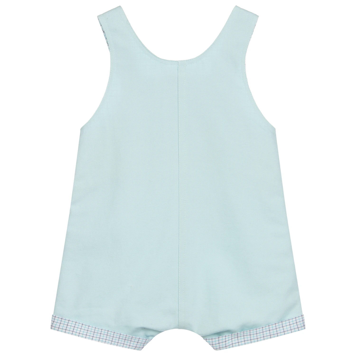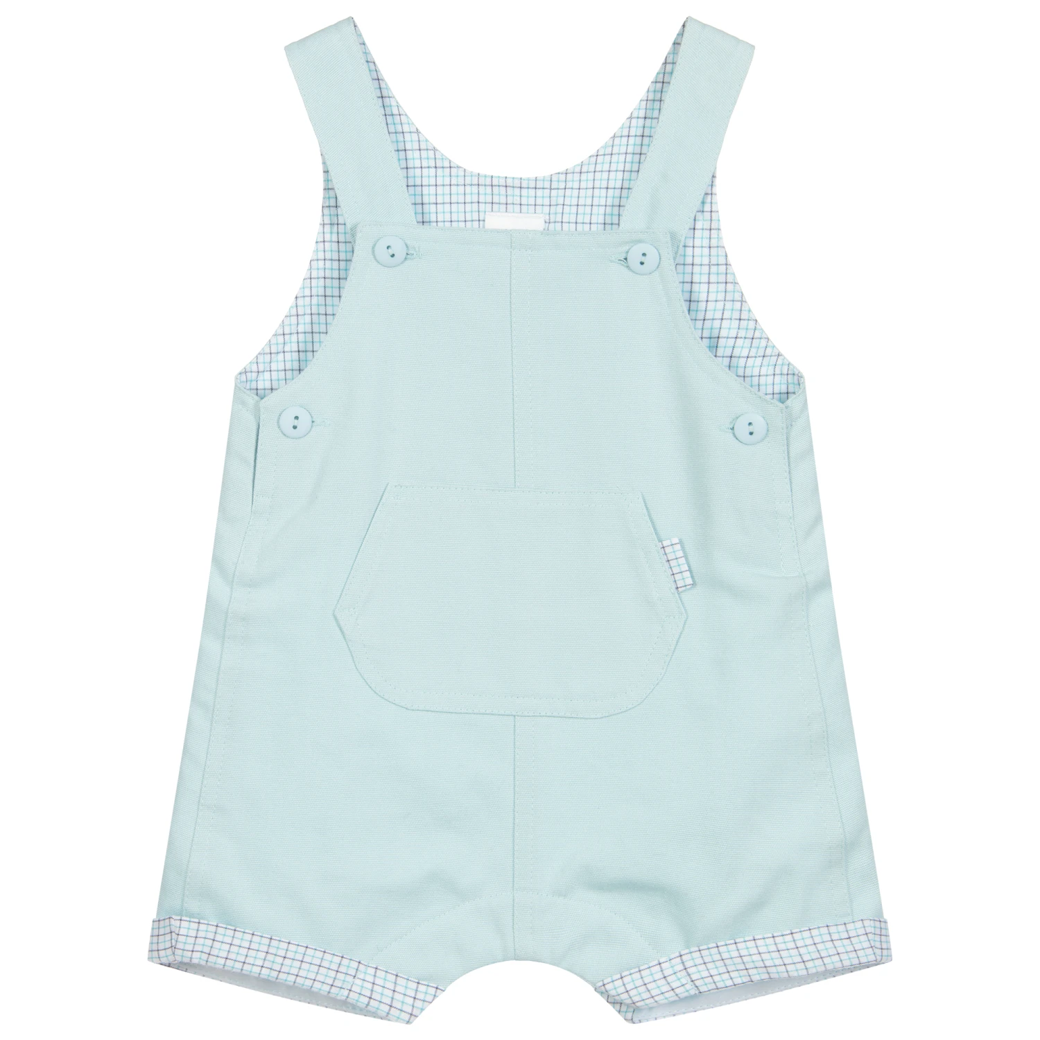 Bale blue baby dungarees by British brand Sarah Louise, with green, blue and white check trims. Made from soft cotton, they have a large pocket on the front. There is a lightweight lining for comfort and button fastenings on the straps and sides.