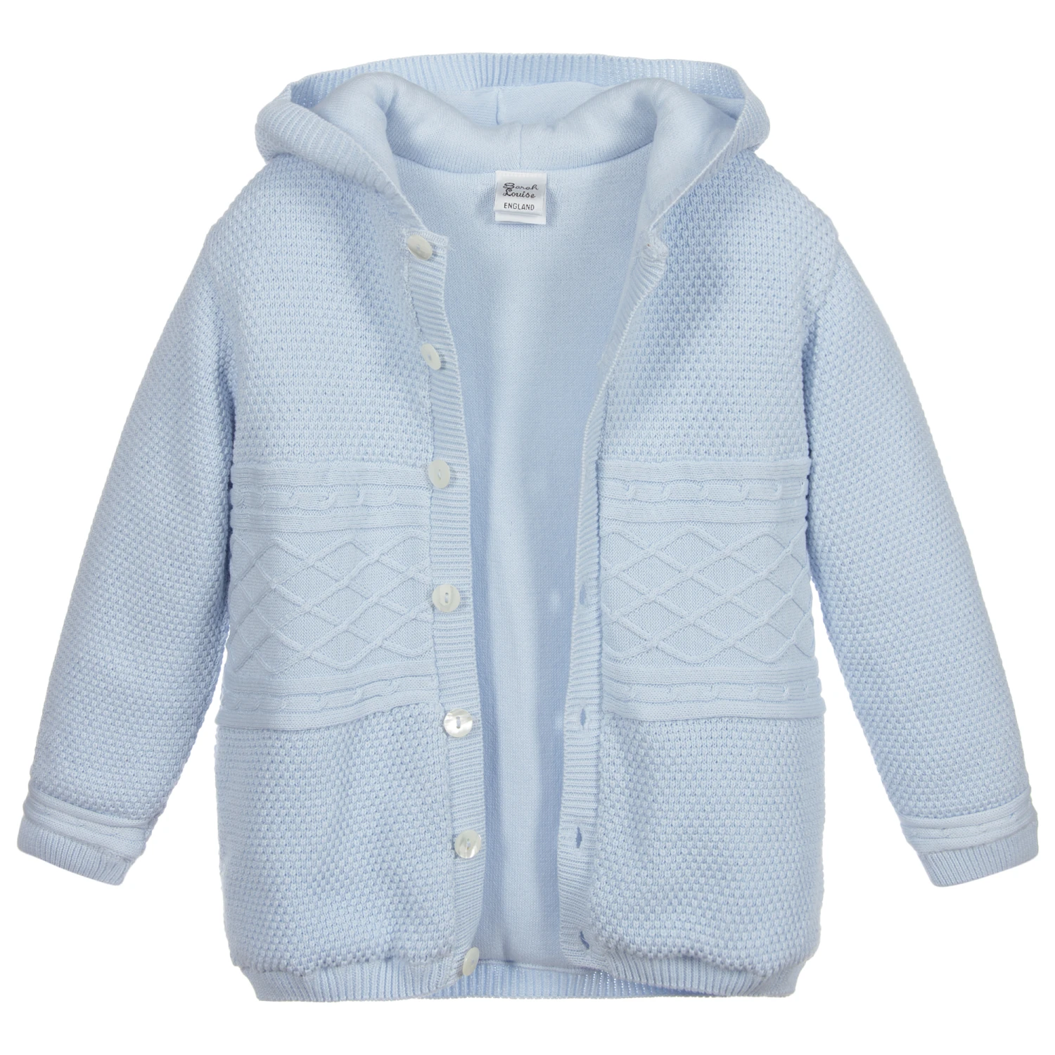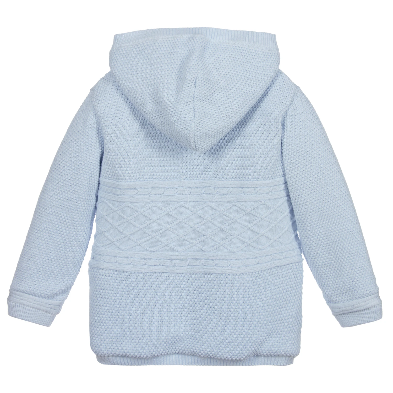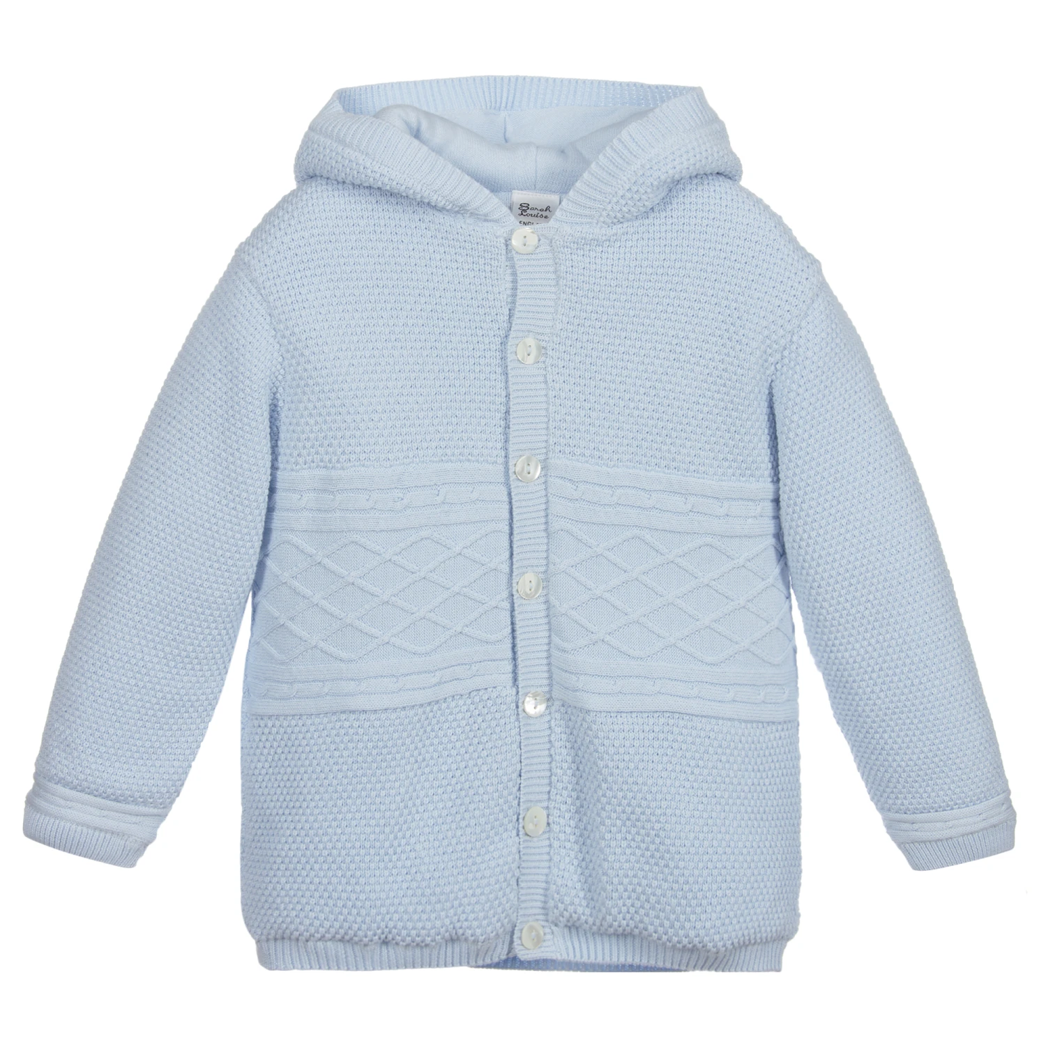Younger boys soft cotton knitted jacket by Sarah Louise in a lovely shade of pale blue. Mid-weight and lightly padded, it has gently ribbed edges and cable knit details. There is a soft knitted hood and button fastenings on the front.