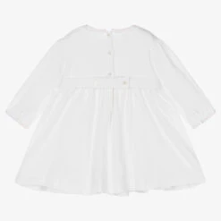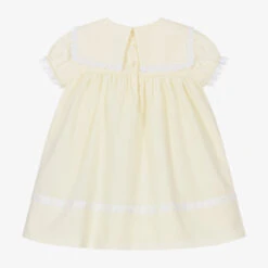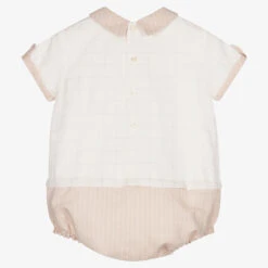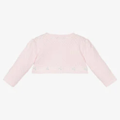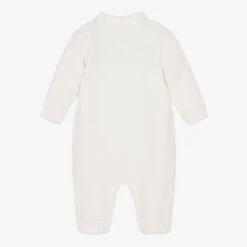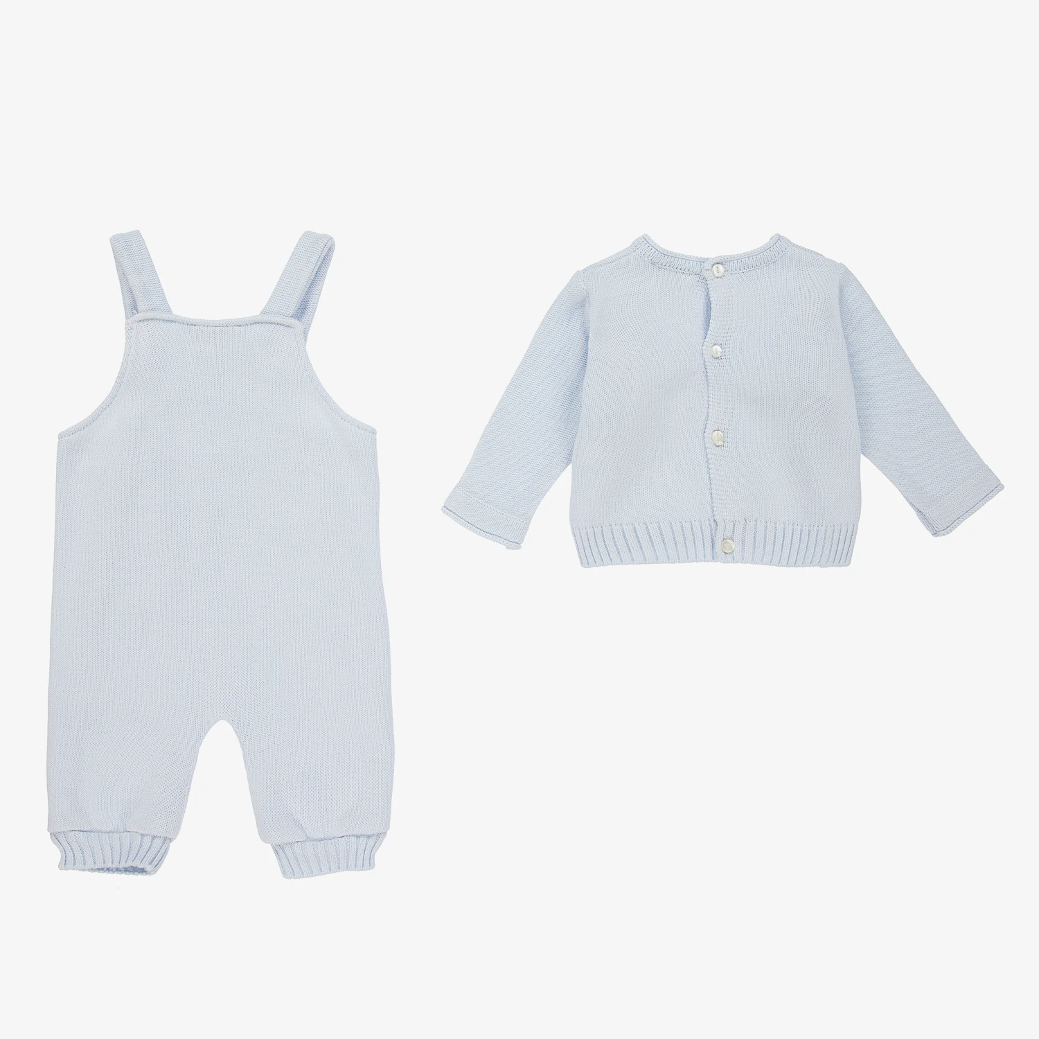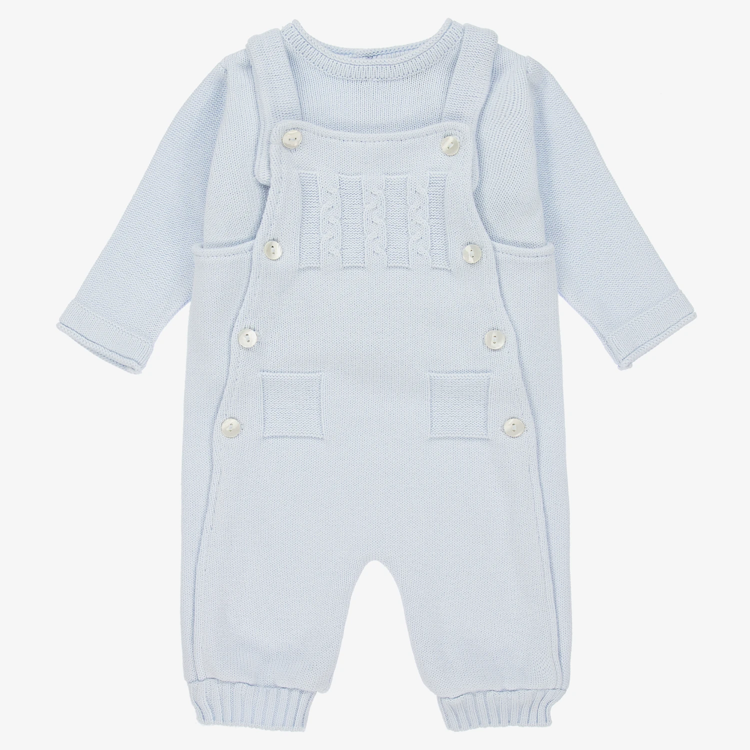 Cute pale blue knitted jumper and dungaree set for baby boys from Sarah Louise. Made from soft and breathable cotton, the dungarees have cable detail on the bib, button fastenings, and adjustable shoulder straps. The jumper has a lovely rolled neckline and cuffs, with button fastenings on the back.