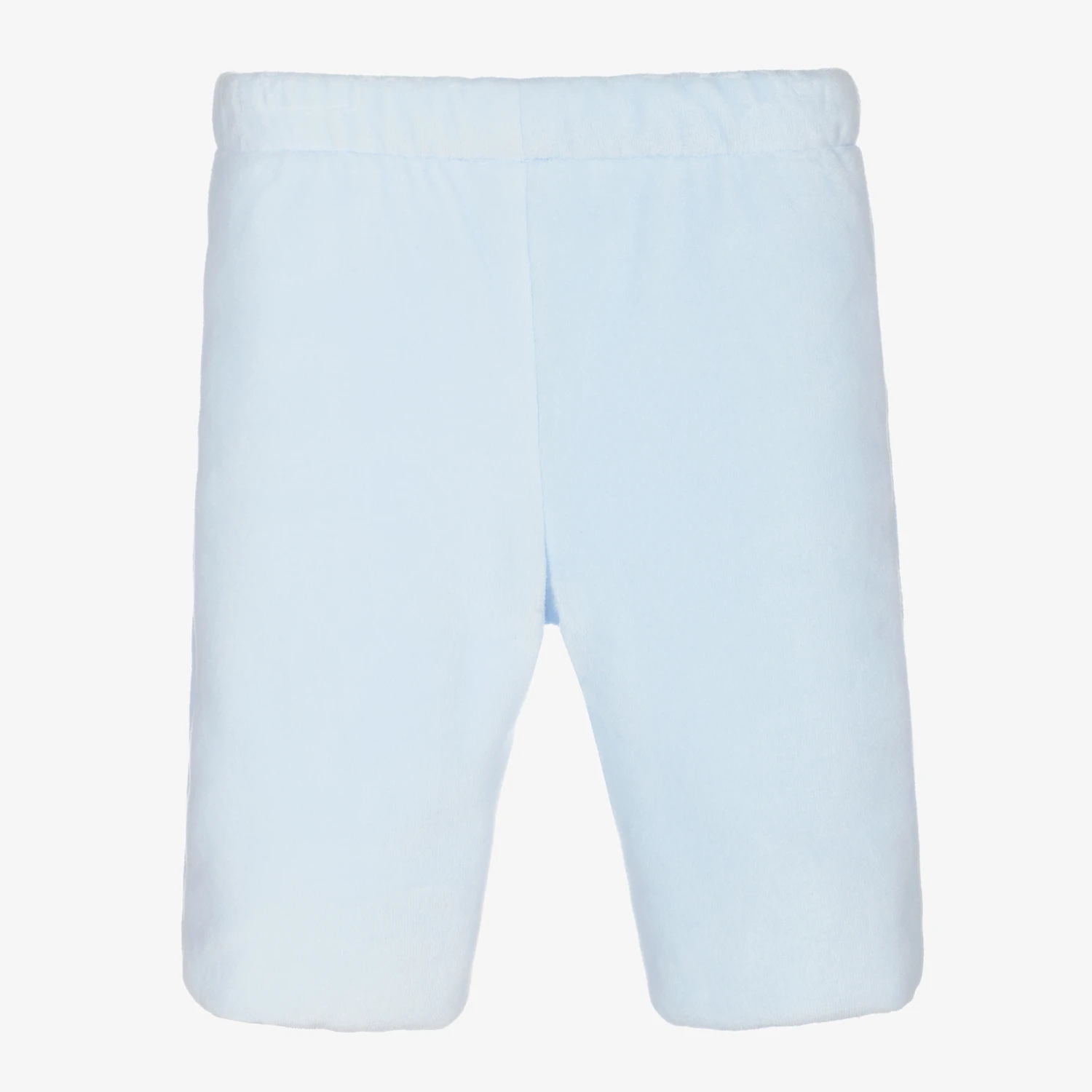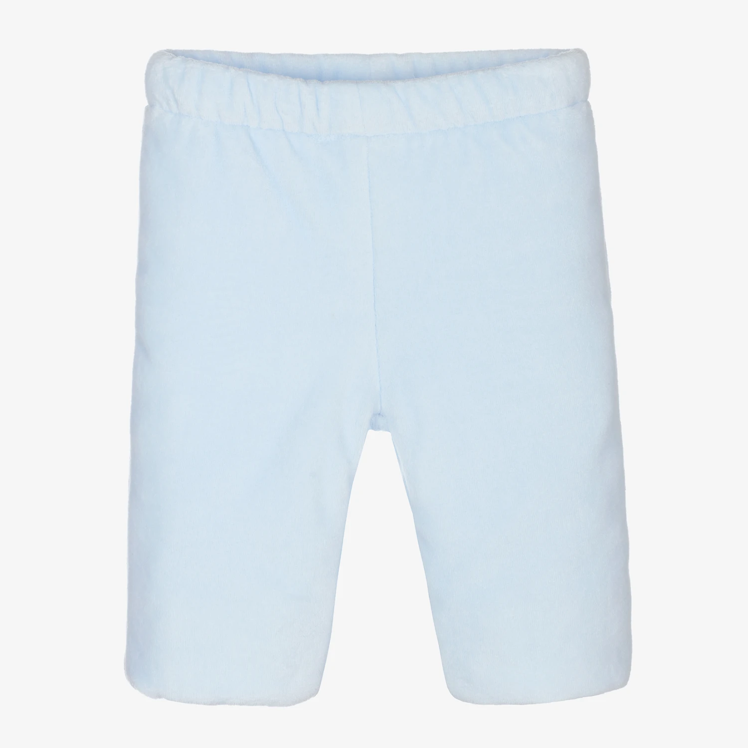 Pale blue padded trousers for little boys and girls by Sarah Louise. Made in soft velour, they are lined in cotton and have an elasticated waistband.