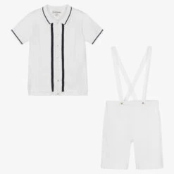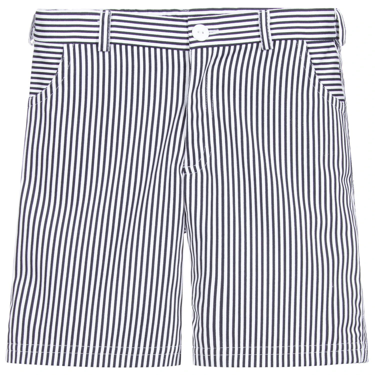 Little boys smart, navy blue and white stripe Bermuda length shorts by Sarah Louise, made in a soft, lightweight cotton blend with a comfortable lining. They have pockets on the front and back, with an adjustable waist and a zip and button fastening.