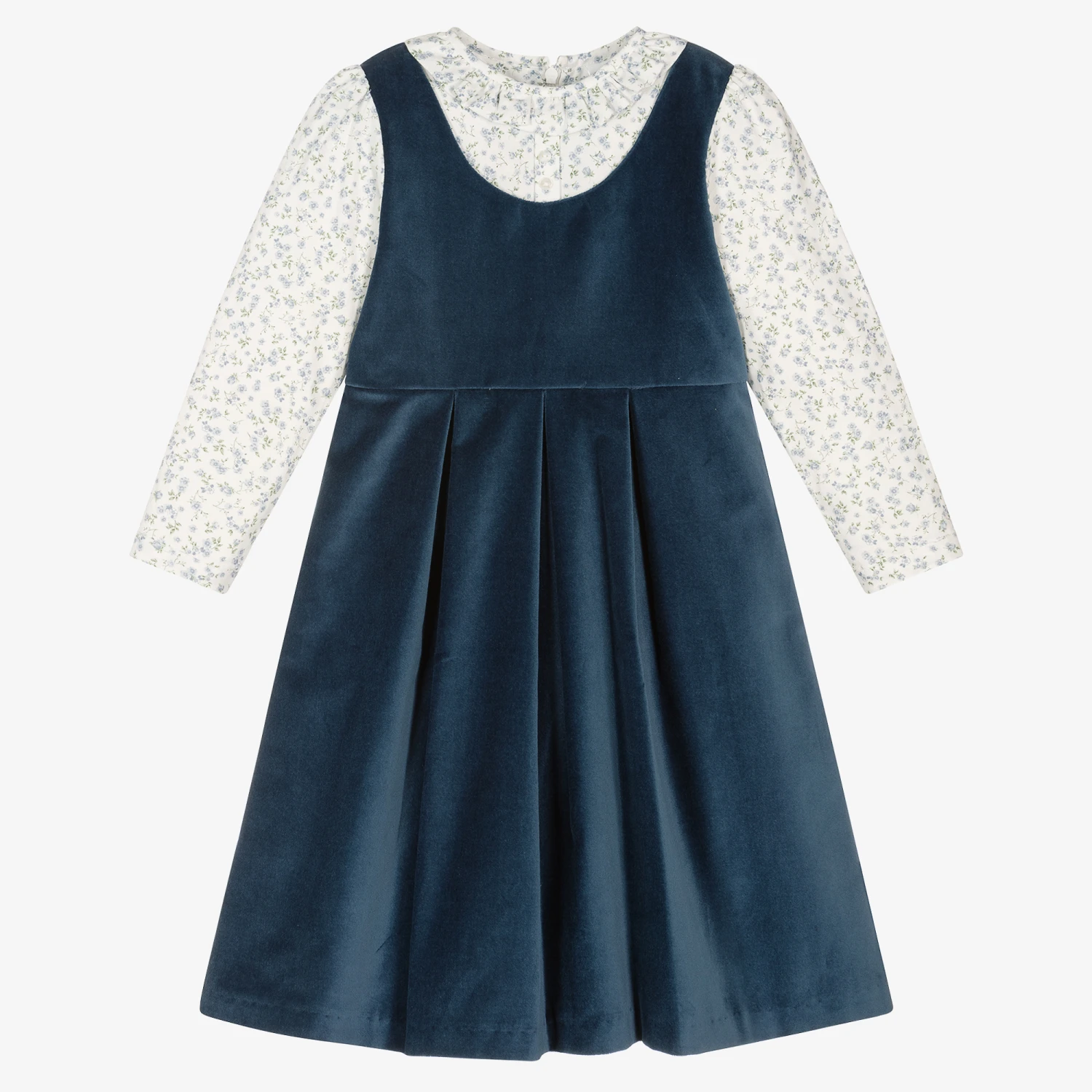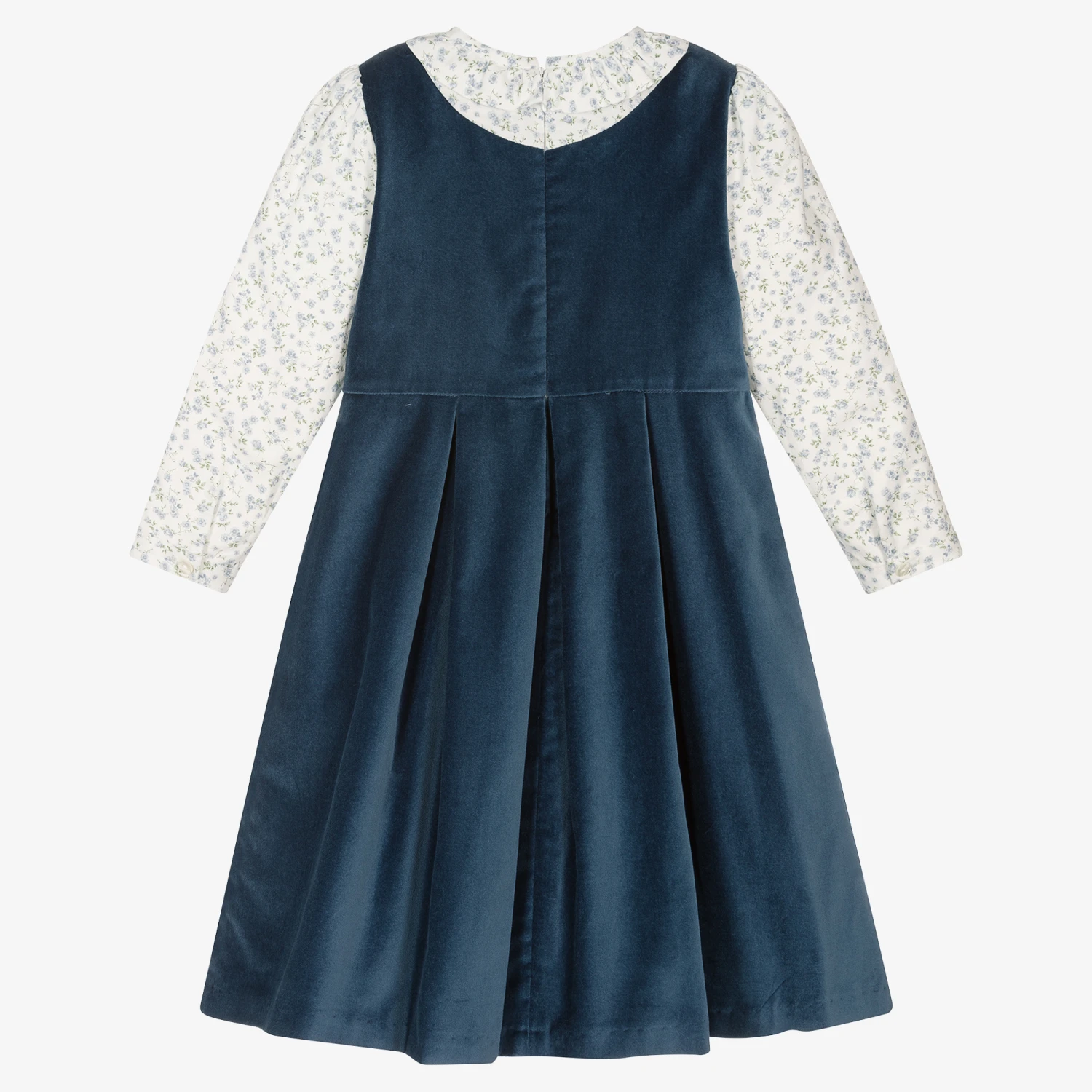 Lovely blue velvet dress for girls from Sarah Louise. This layered style one-piece has the appearance of a pinafore dress with an ivory and blue floral blouse beneath. There is a pretty ruffle collar with decorative button fastenings on the front and the sleeves are gathered at the shoulder. The dress has a lightweight lining for comfortable wear and fastens with a concealed zip on the back.