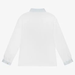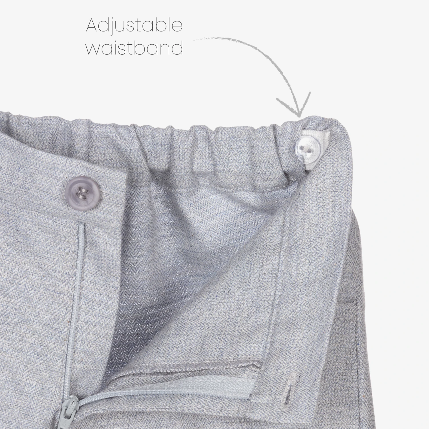 Smart pale blue trousers for boys by Sarah Louise, made from soft cotton with a lovely herringbone weave. Fastening with a zip and button, they have an adjustable waistband for comfort. There are useful front pockets and a single welt pocket on the back.