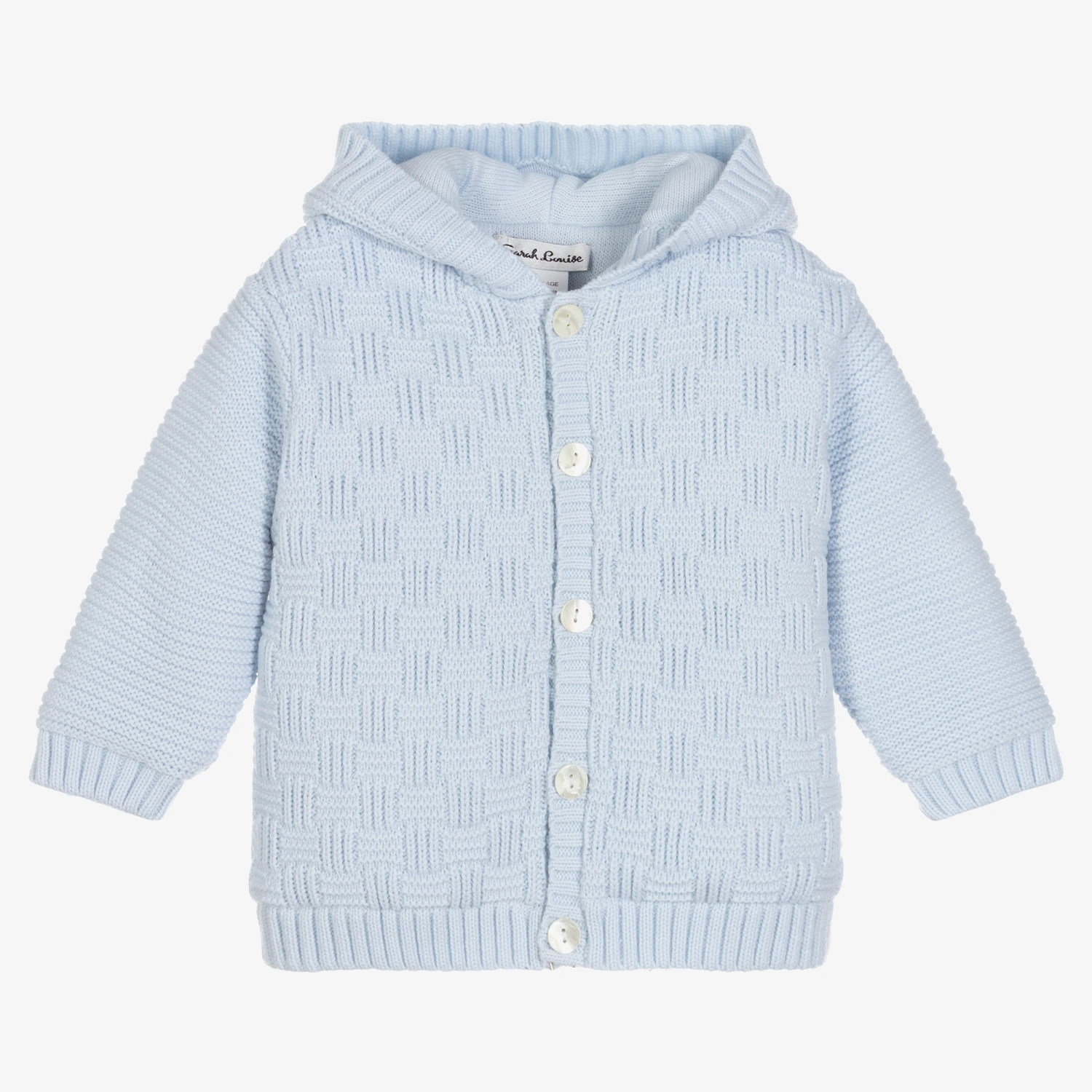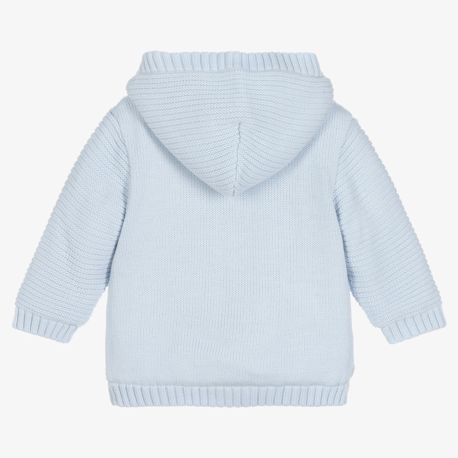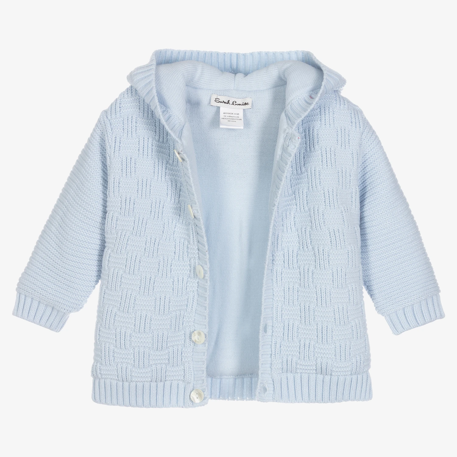 Pale blue hooded jacket for younger boys from Sarah Louise. Knitted in a soft acrylic basket weave pattern with ribbed sleeves, it fastens with pearly buttons on the front. The jacket has lightweight padding and a knitted lining for added warmth.