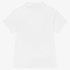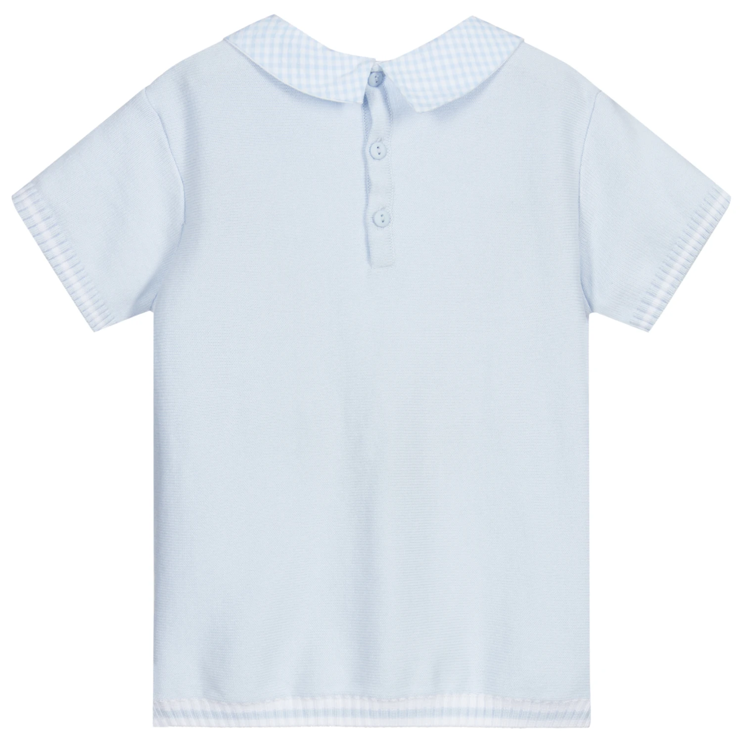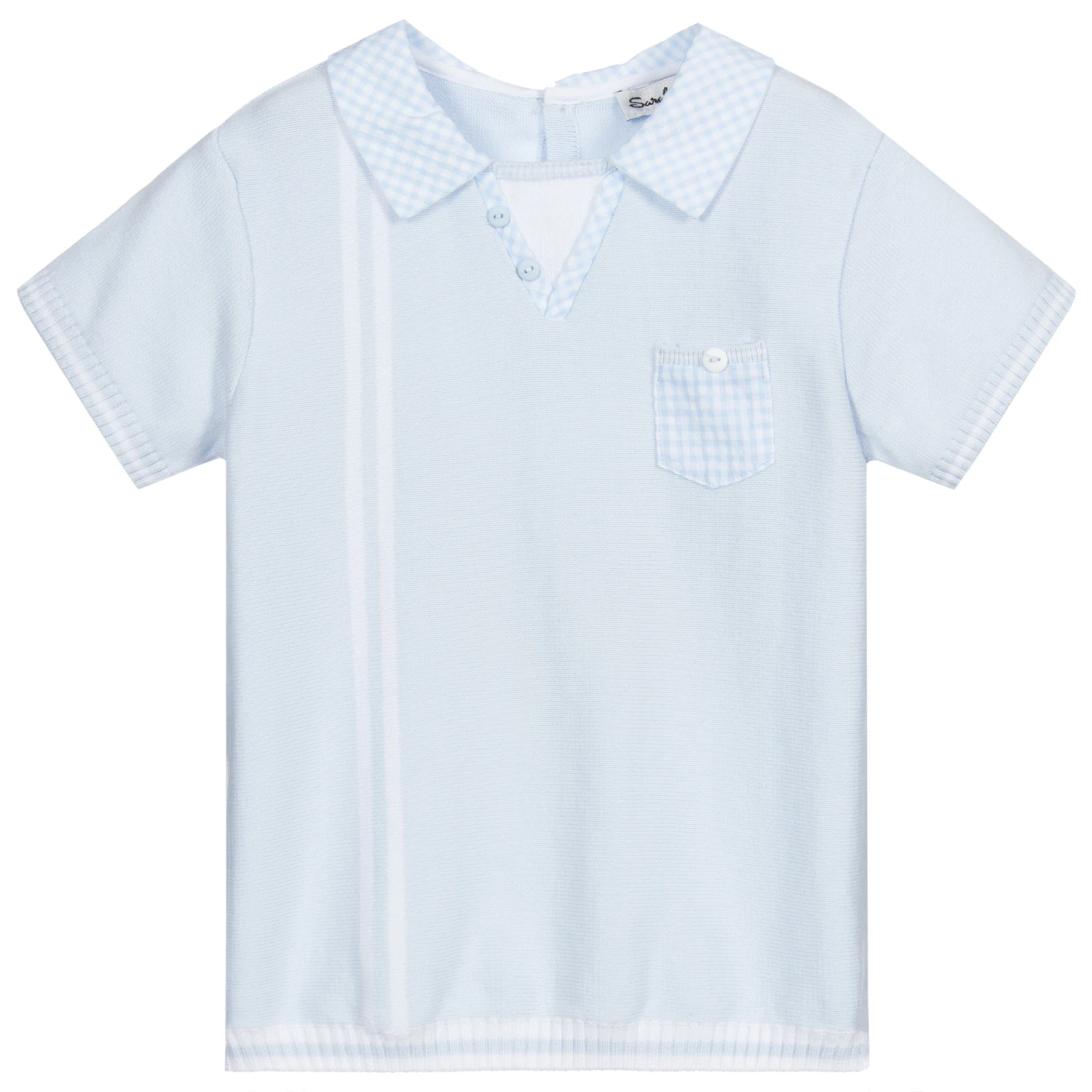 Lovely for younger boys, a soft cotton knitted sweater by British designer Sarah Louise. Mid-weight this short sleeved top has a blue and white checked collar, chest pocket and white striped trims.