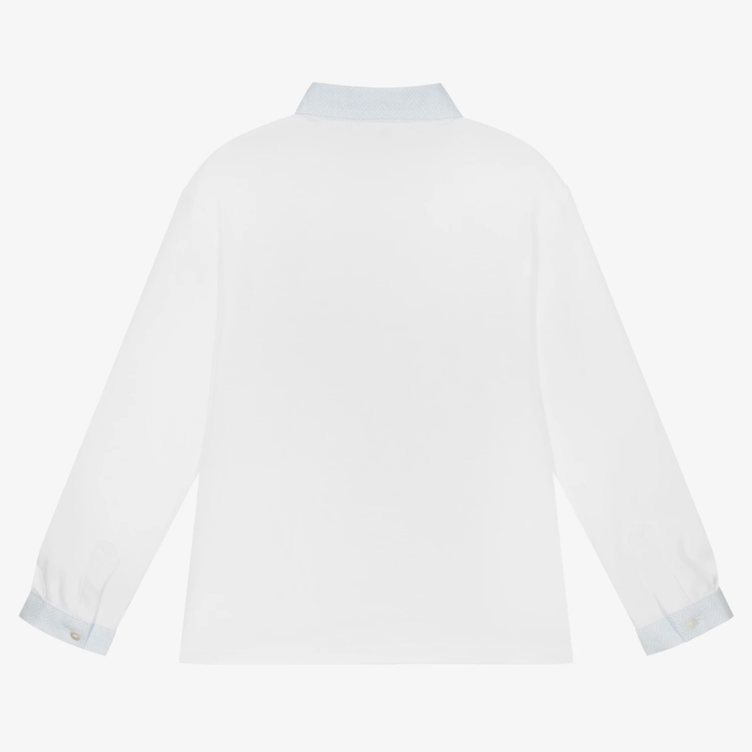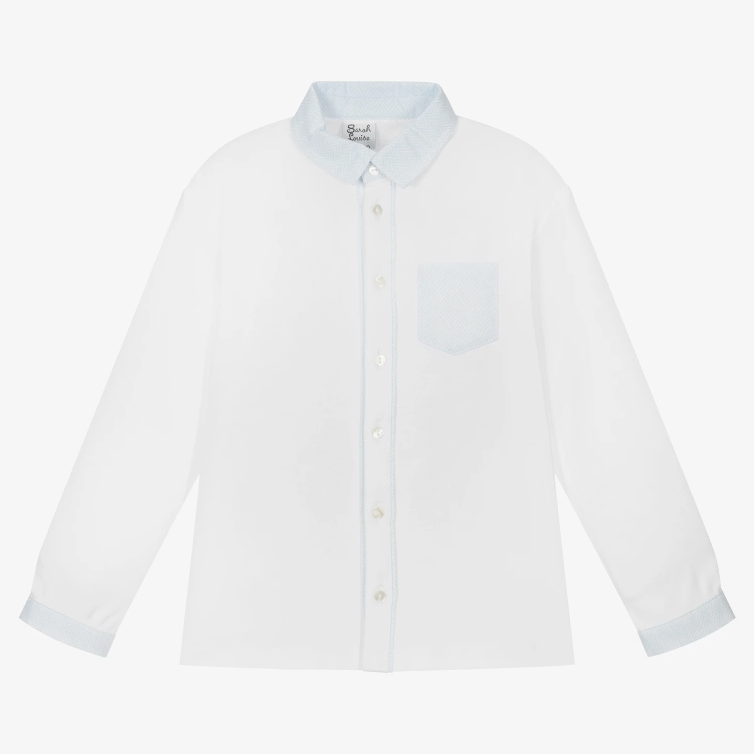 Comfortable smart shirt for boys from Sarah Louise, made in soft cotton jersey. It has blue and white trim with a lovely zigzag pattern and a matching chest pocket.