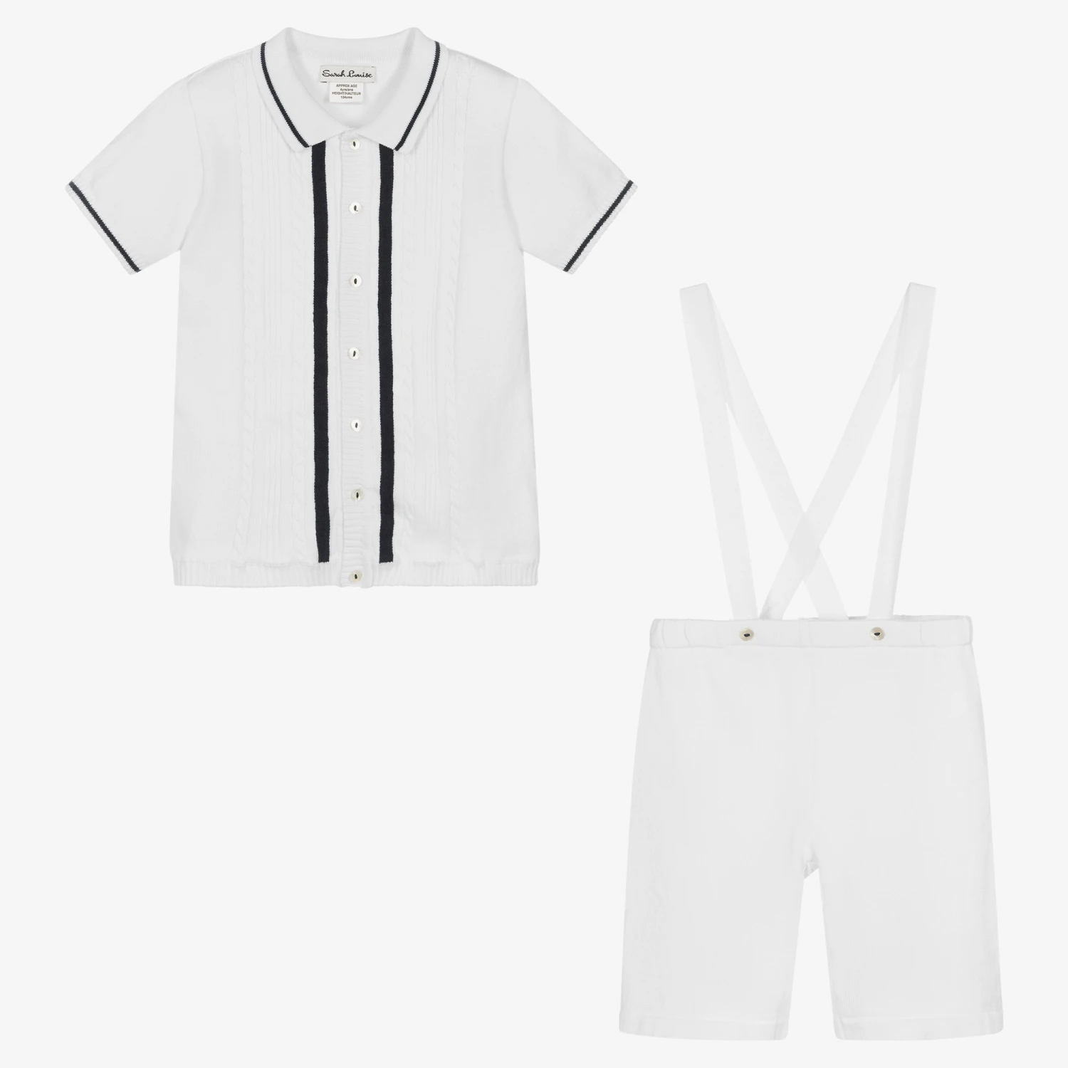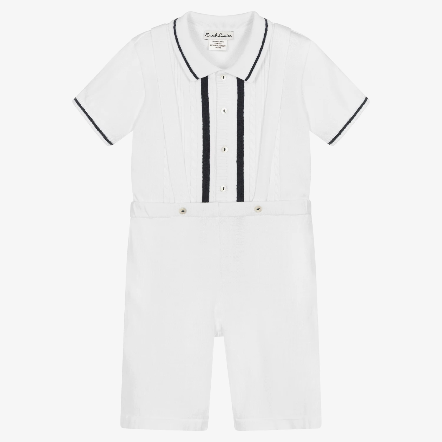 Smart-casual white shorts set for little boys from Sarah Louise, knitted in soft cotton. The stylish top has lovely cable detail on the front, with navy blue striped trim and button fastenings. It pairs with matching shorts that have a gently elasticated waistband and attached, button-fastening shoulder straps.