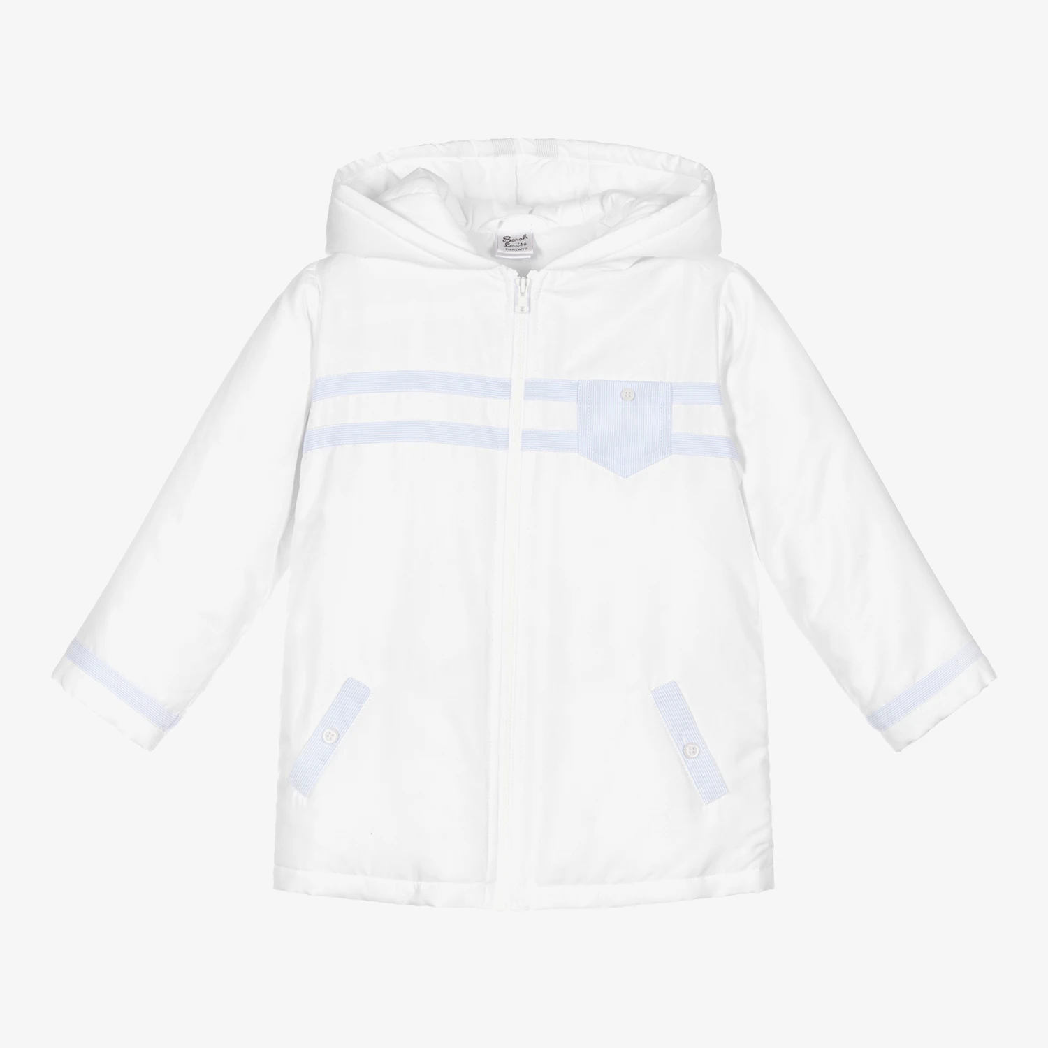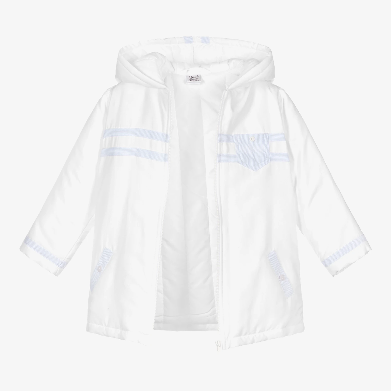 Boys white hooded coat by Sarah Louise, made and lined in soft polyester. Lightly padded, it has blue and white striped trim, button-fastening pockets, and a zip fastening.