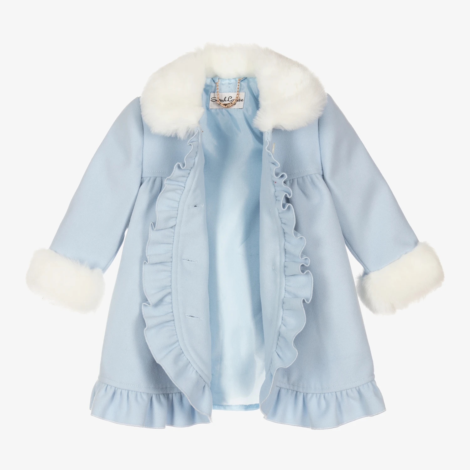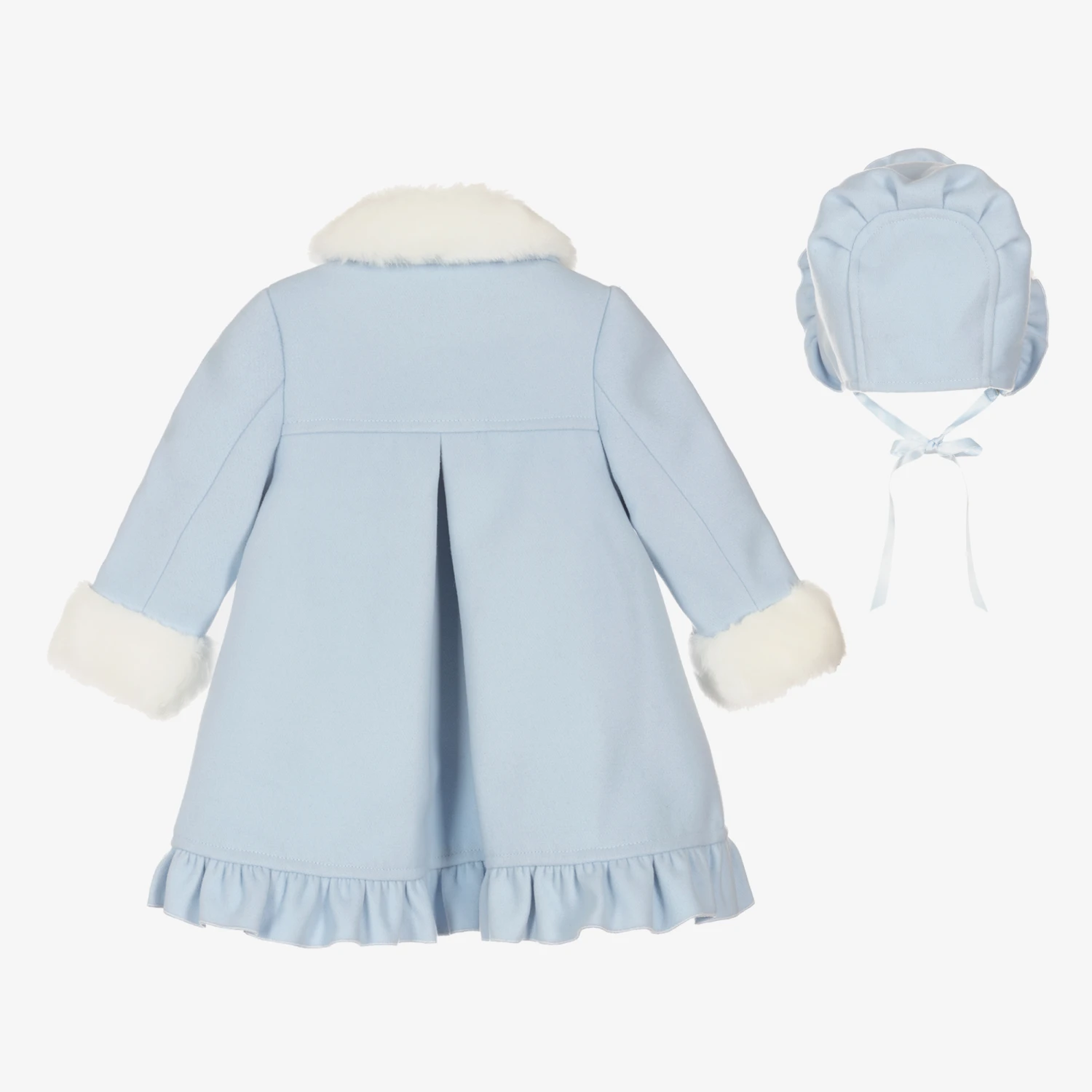 Pale blue coat and bonnet set for little girls, by Sarah Louise, made in a soft felted fabric. Both pieces are lined in silky, smooth polyester and trimmed with white faux fur. The bonnet fastens with ribbon ties under the neck, which can be detached if needed. The coat has beautiful mother-of-pearl button fastenings and ruffle trims.