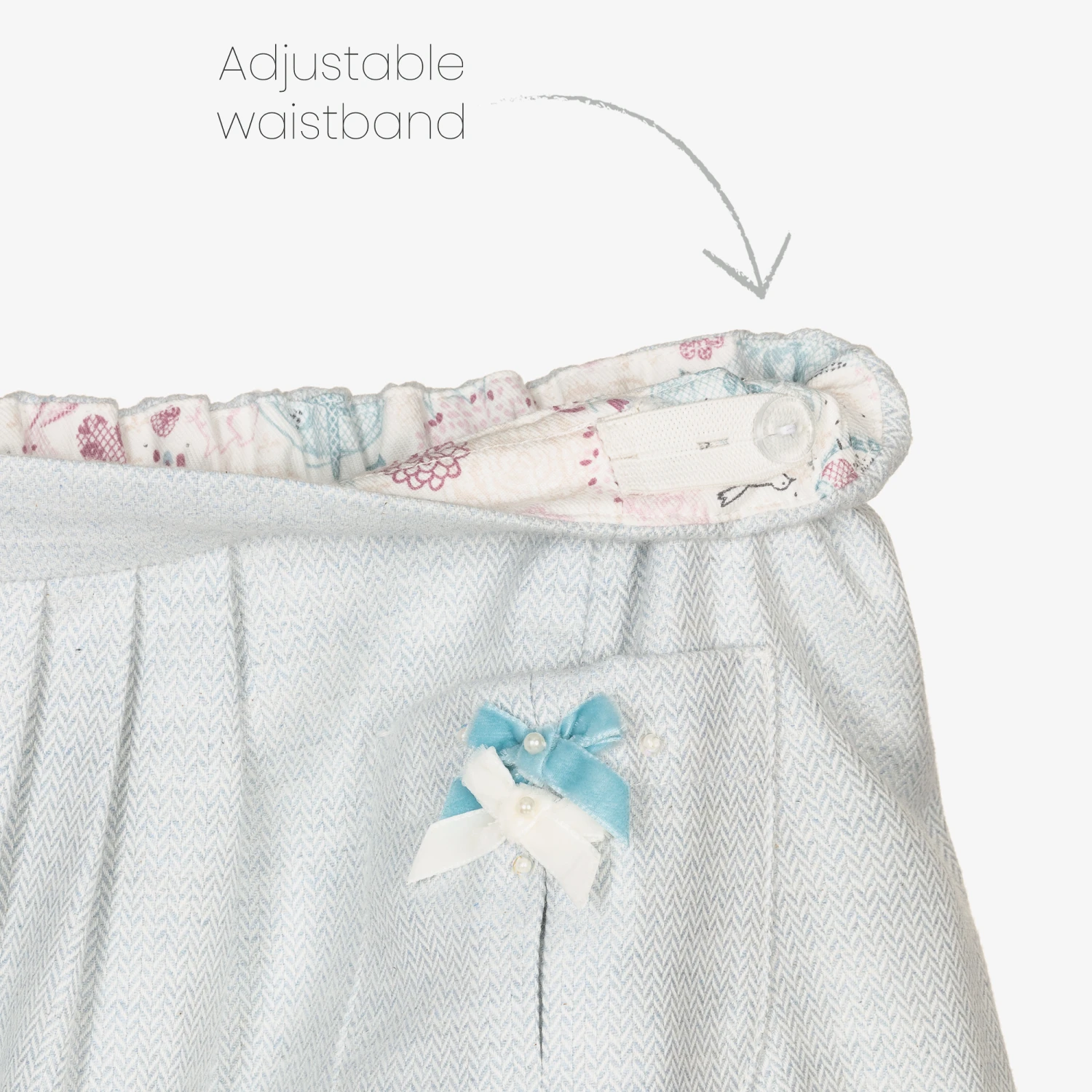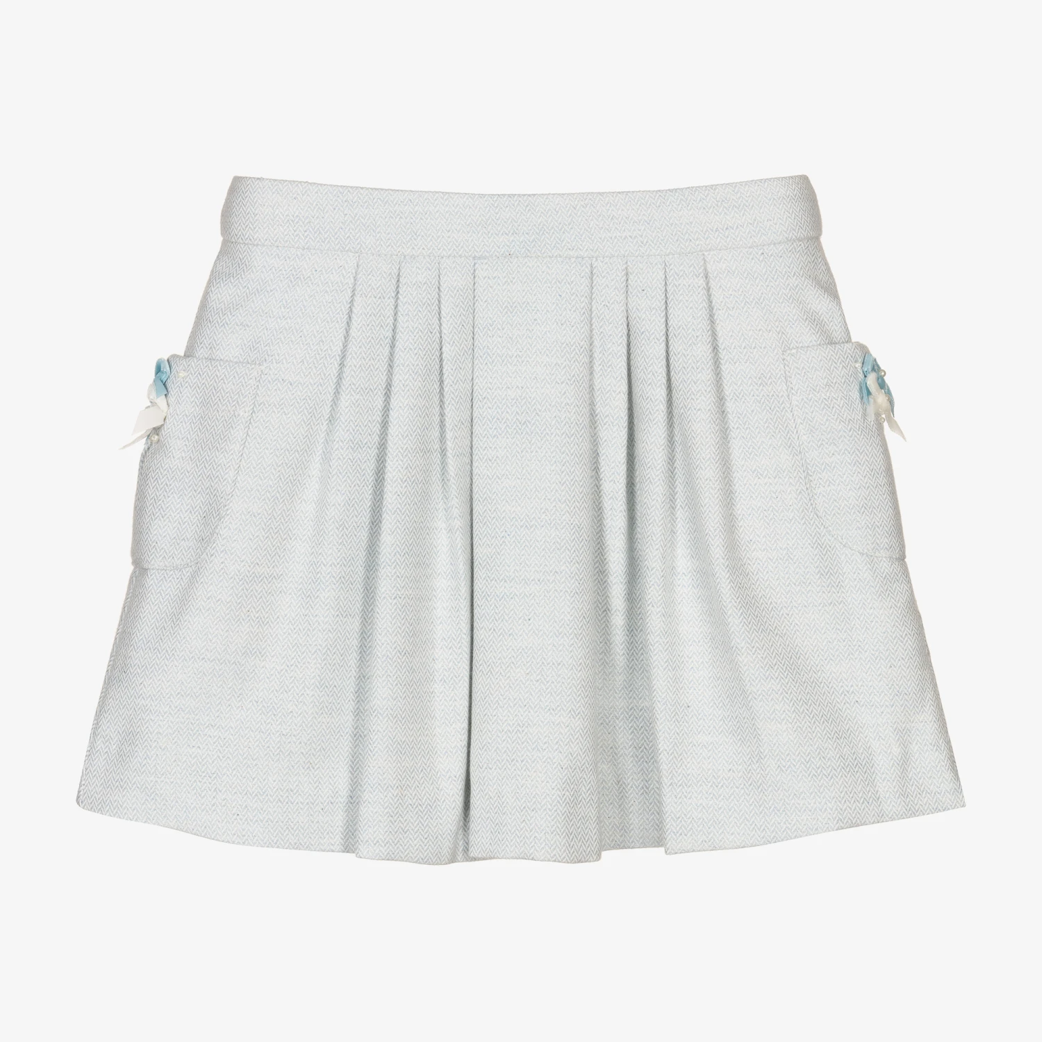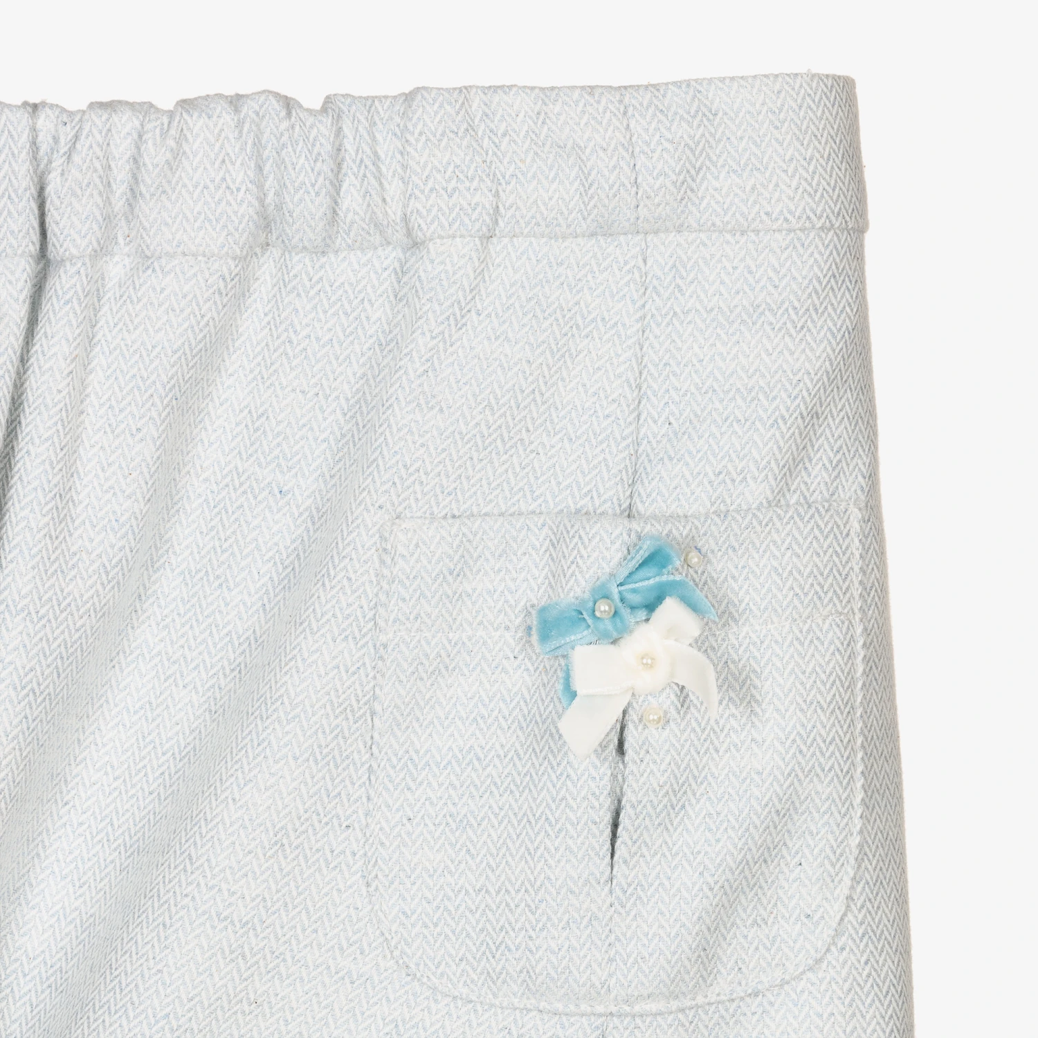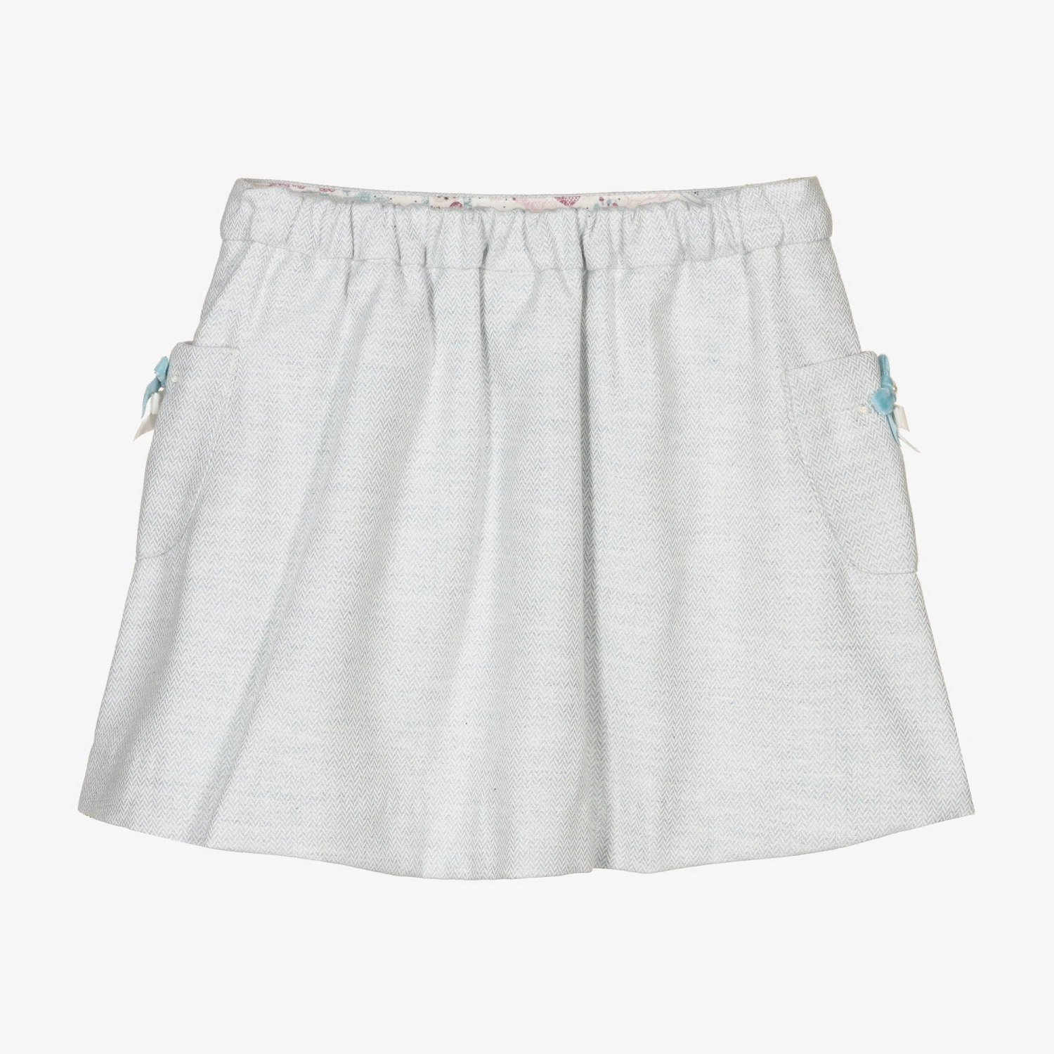 Pale blue skirt for girls by Sarah Louise, in a lovely cotton-blend herringbone weave. Soft and midweight, it has a lightweight lining and an adjustable waistband. Pleated on the front for a flared shape, it has patch pockets with blue and ivory velvet bows and tiny pearl beads.