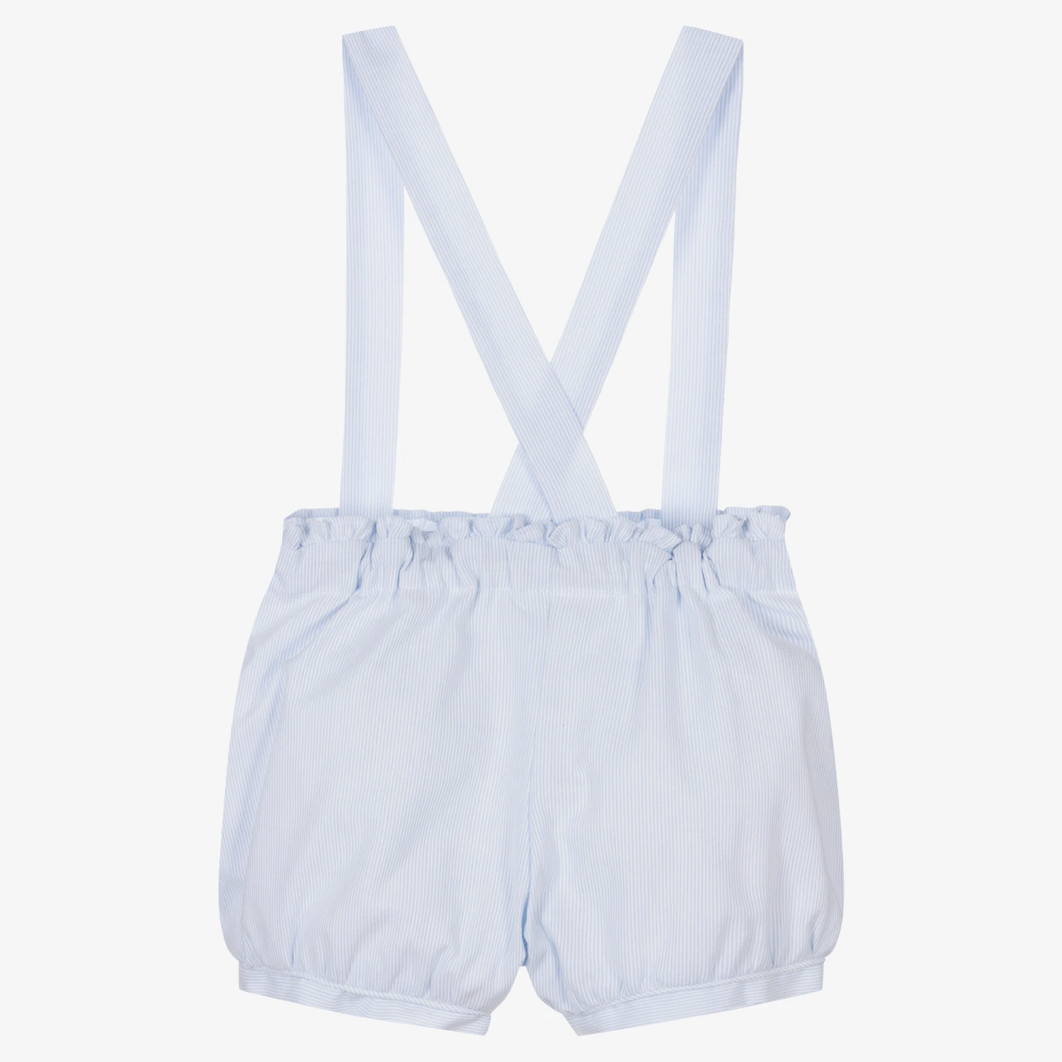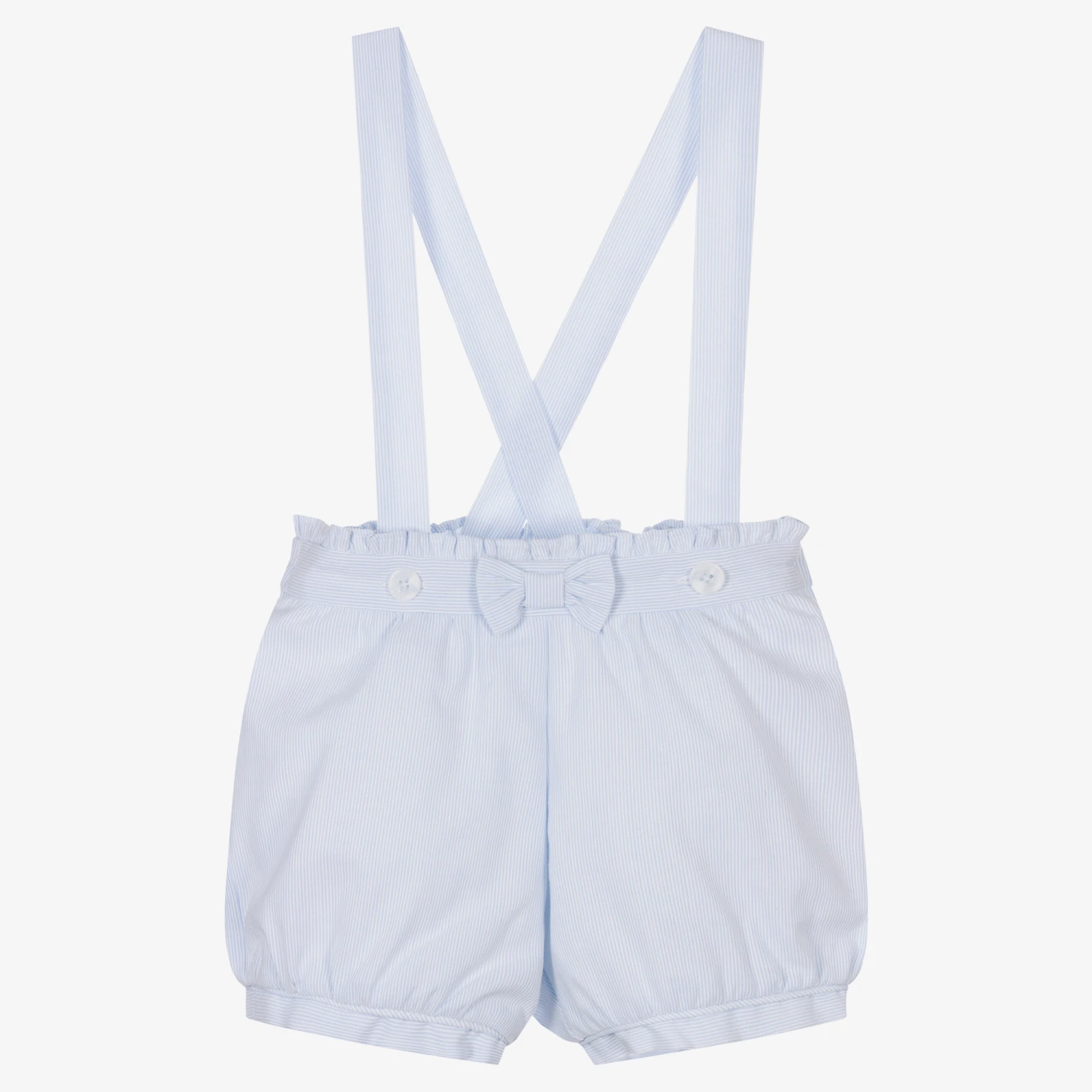 Pale blue pinstriped shorts for little girls by Sarah Louise. This classic style has pretty ruffle trims and a sweet bow on the front. Made in a finely ribbed cotton blend and fully lined for comfort, they have attached braces which fasten on the front with buttons.
