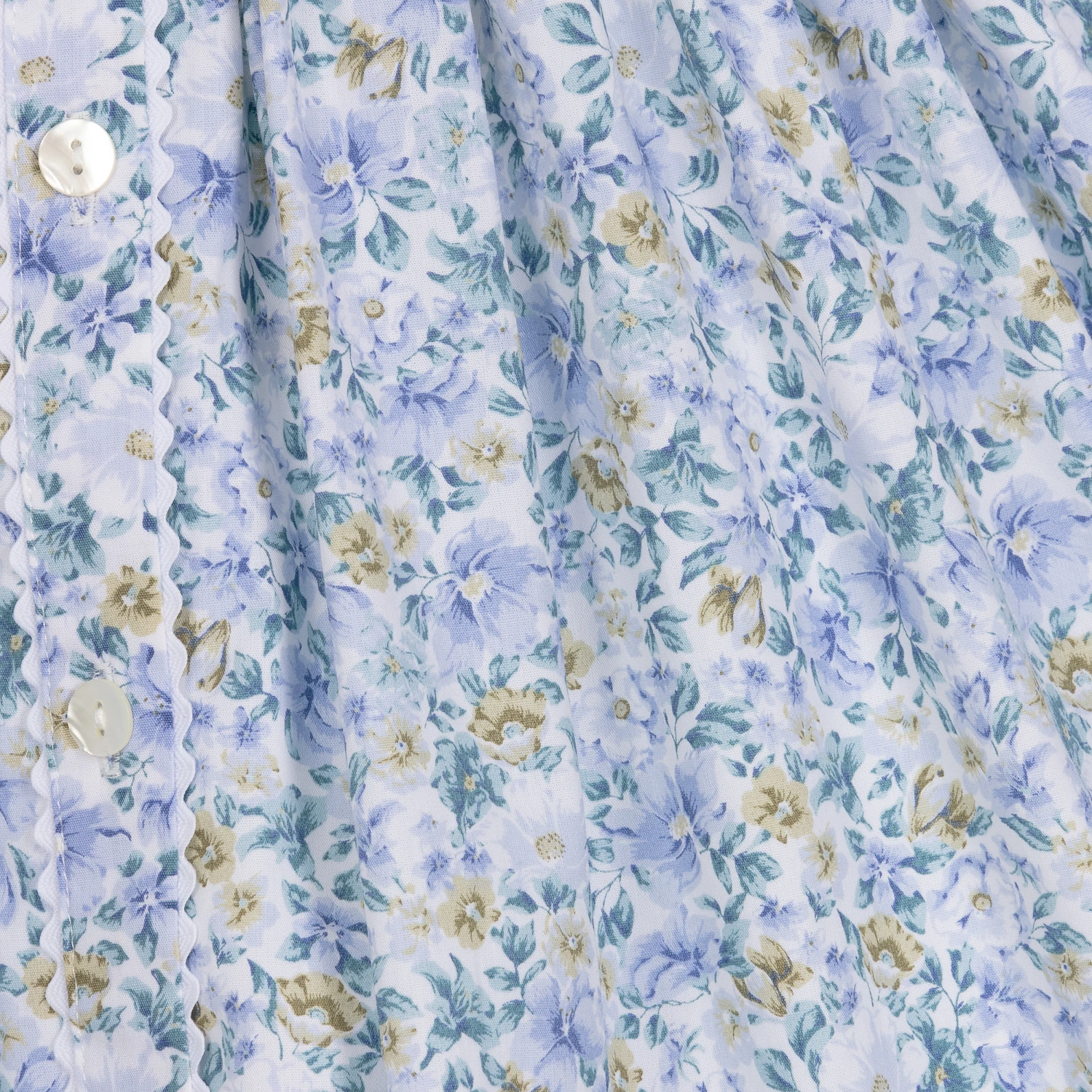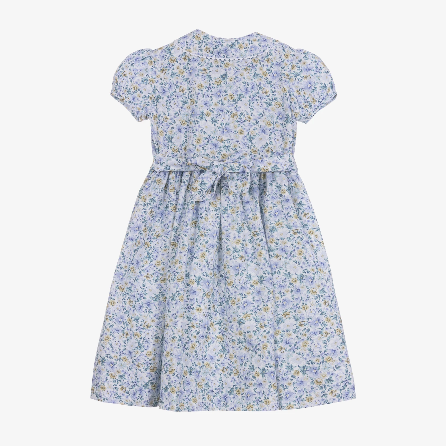 Exclusive to Childrensalon, this pretty blue floral print cotton blend dress for girls is by British brand Sarah Louise. Classically designed, it has a pretty rounded collar and puffed sleeves, with pin-tuck detailing on the bodice. Fully lined for comfort in a lightweight voile, it fastens at the front with decorative buttons and has an attached sash tie on the back.