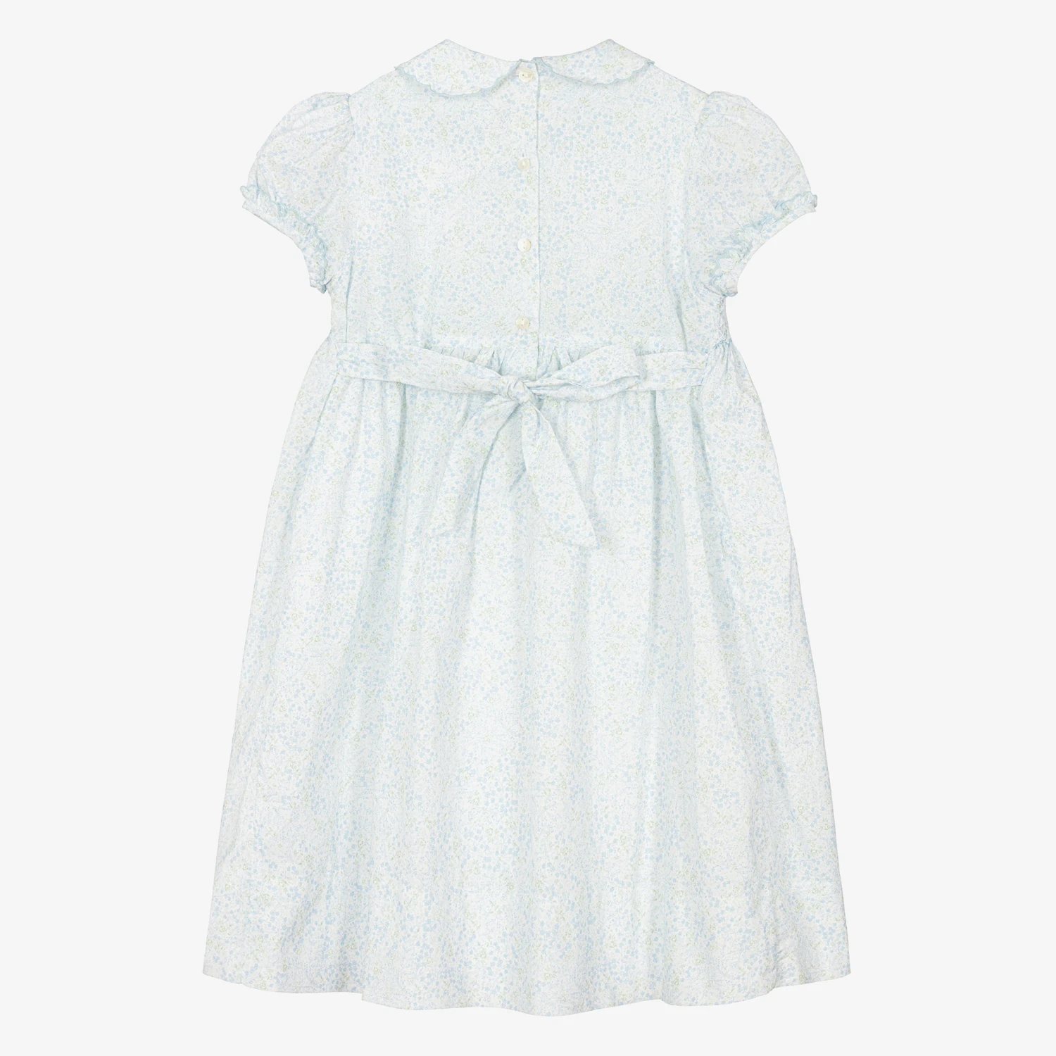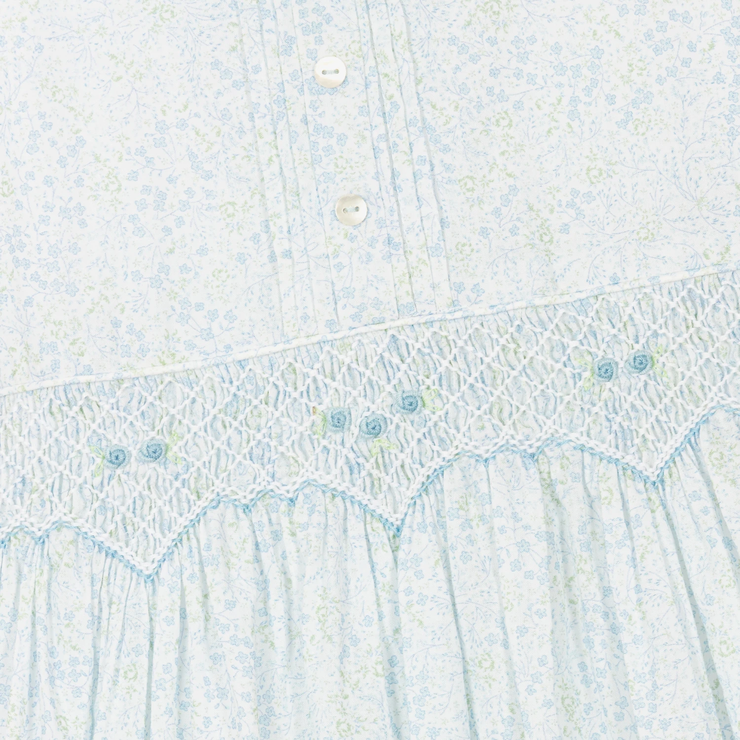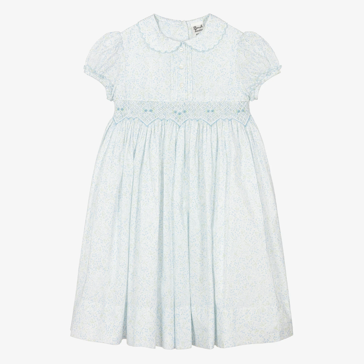 Lovely dress for girls by classic British brand Sarah Louise, with a delightful, pale blue ditsy floral print on a white background. Made in a lightweight cotton blend, it has traditional hand smocking and floral embroidery across the bodice, with decorative buttons and pin tuck detailing. With a scalloped collar and pretty puffed, frilly sleeves, it is fully lined in voile for comfort. It fastens with buttons around the back and a sash that ties in a bow.