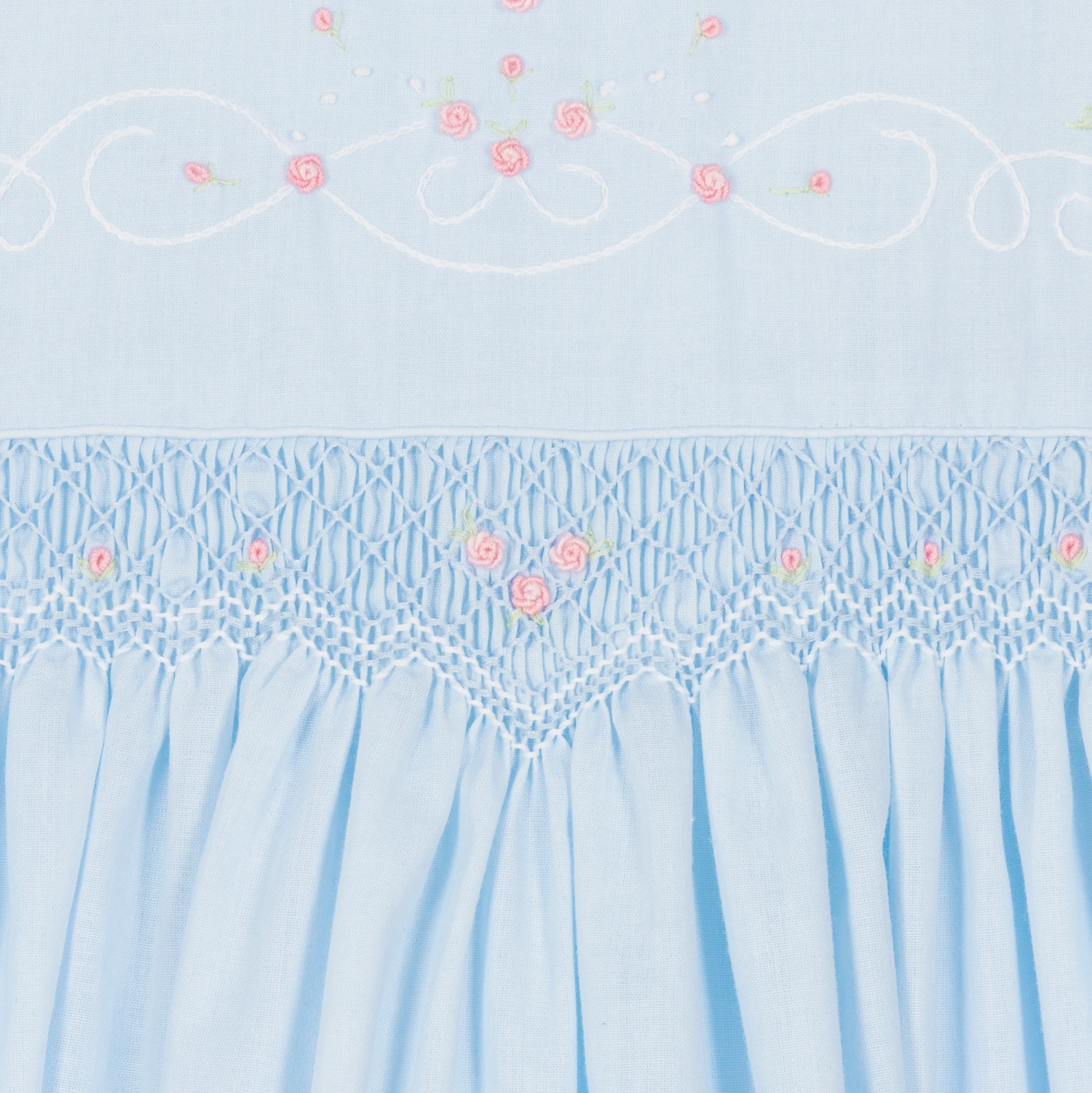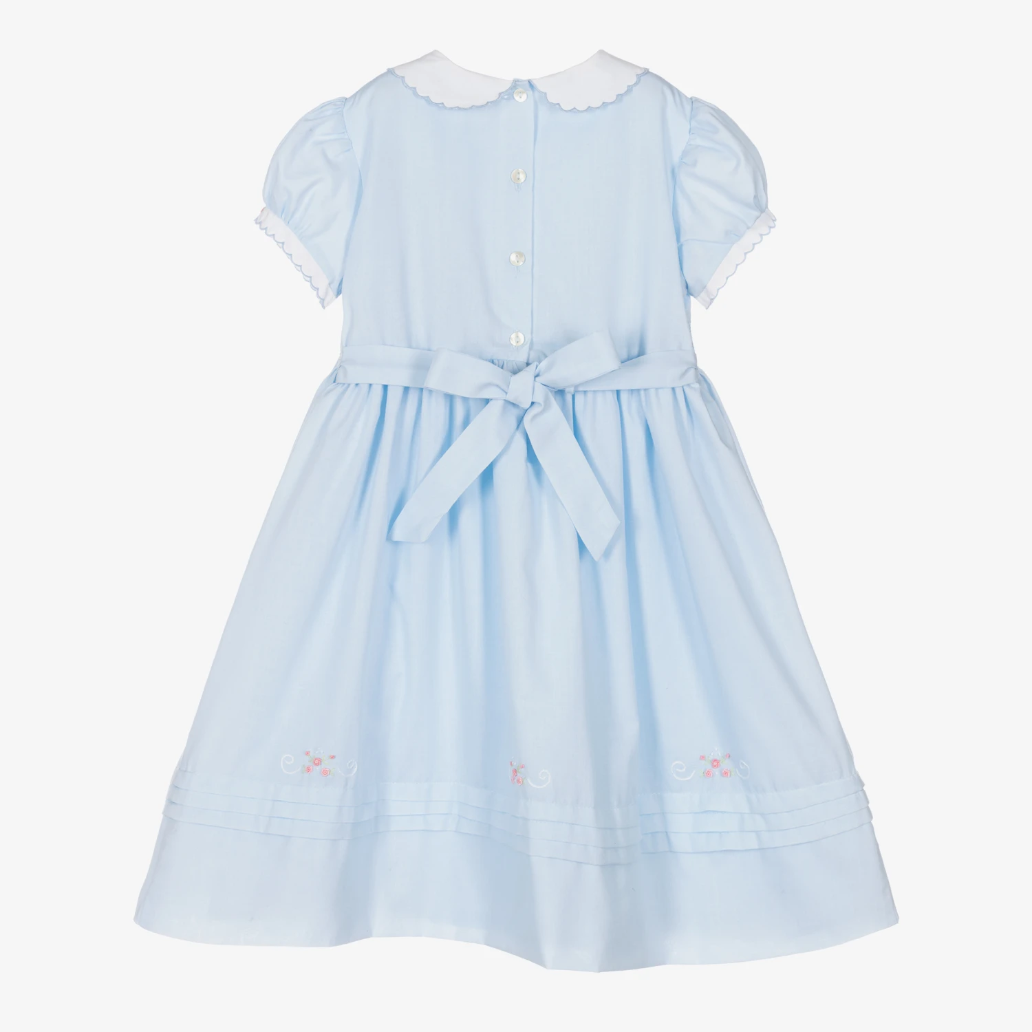 Lovely pale blue dress for little girls by classic British brand Sarah Louise, made in a lightweight cotton blend. Traditionally styled, it has hand smocking and lovely rosebud embroidery across the bodice. There are scalloped trims and embroidered rosebuds on both the white collar and the pretty puffed sleeves, with matching embroidery and pintucks around the hemline. It is fully lined in voile for comfort and has pearlescent button fastenings around the back, with a sash that ties in a bow on larger sizes.