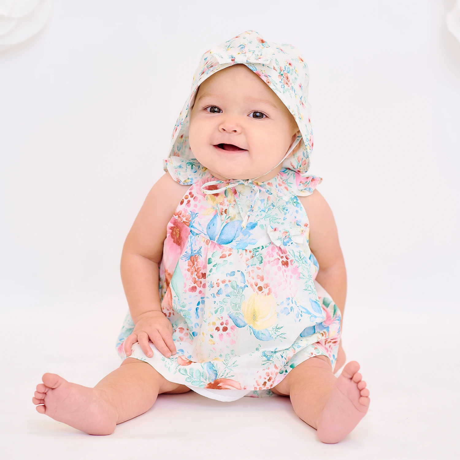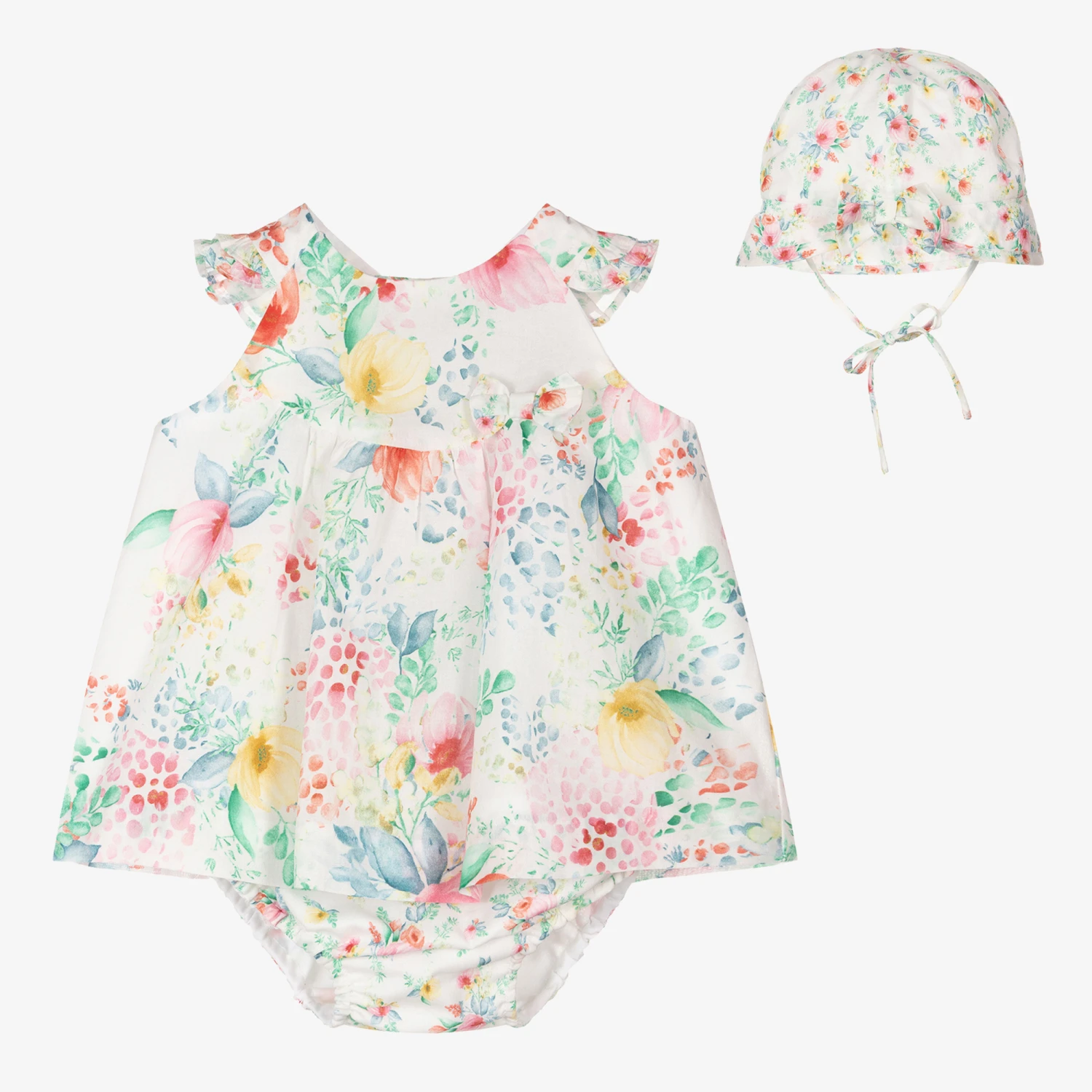 A pretty white dress set for little girls by British brand Sarah Louise, made in a soft and lightweight cotton blend. The dress has an all-over colourful floral pattern and back button fastenings. Fully lined, there are ruffles on the shoulders and a bow trim on the waist. The set comes with a matching sun hat and bloomer knickers.