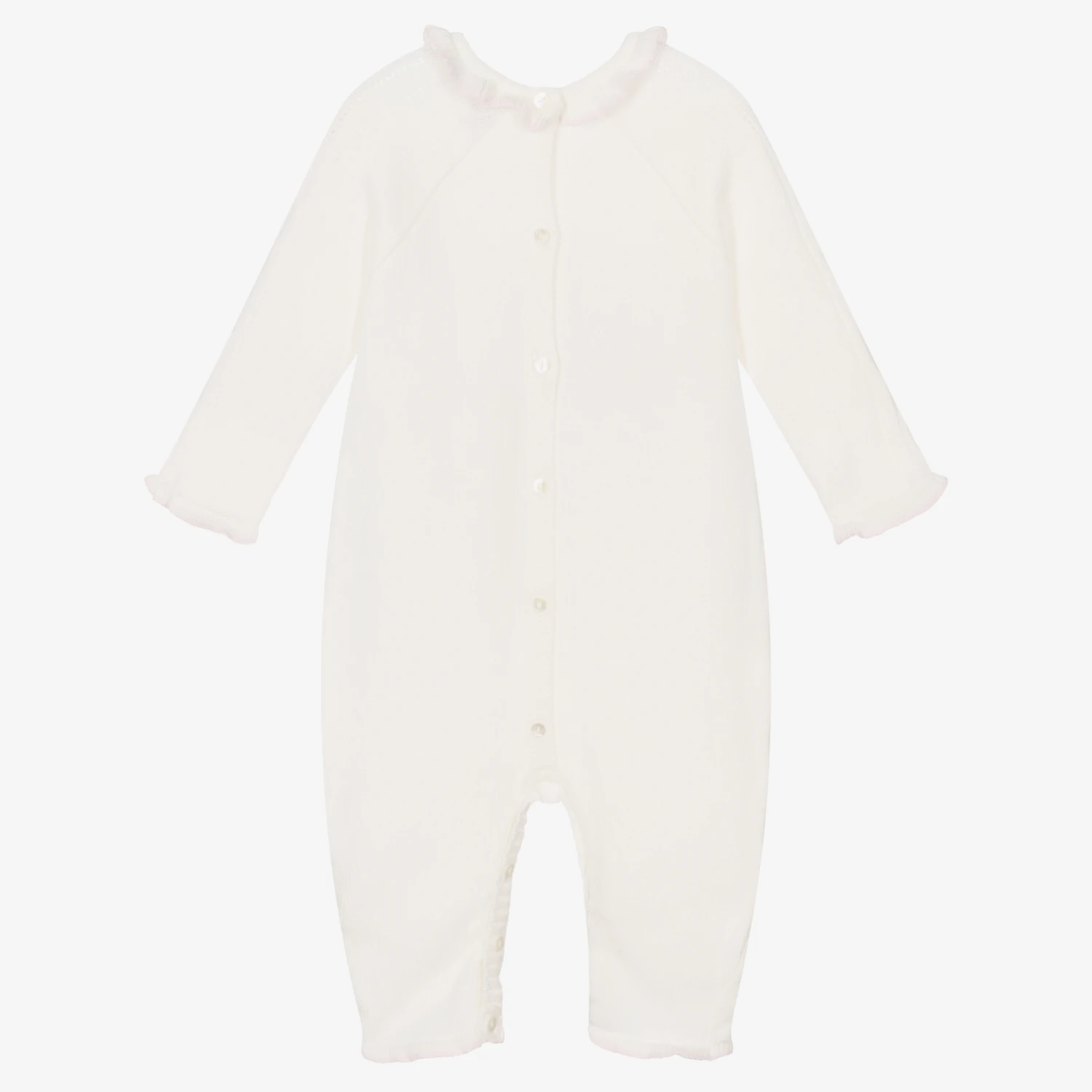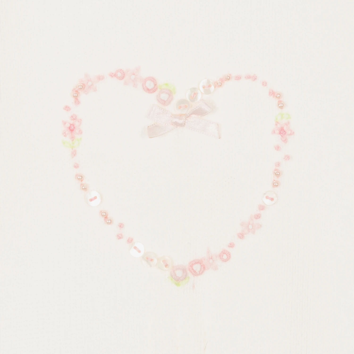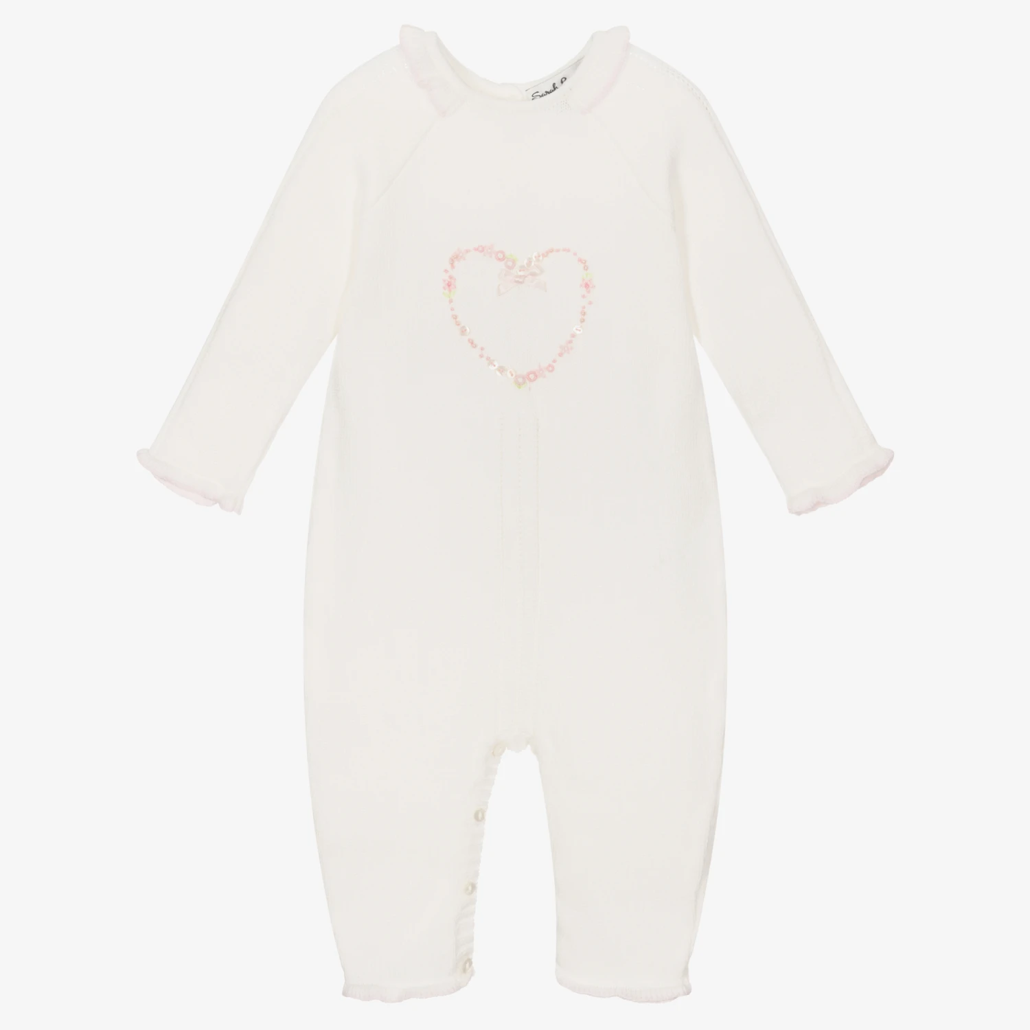 Pretty and feminine for baby girls, this ivory romper is by Sarah Louise. There is a pink heart design embroidered on the front, trimmed with a pink satin bow. Knitted in soft and comfortable cotton, it has button fastenings on the back and between the legs.