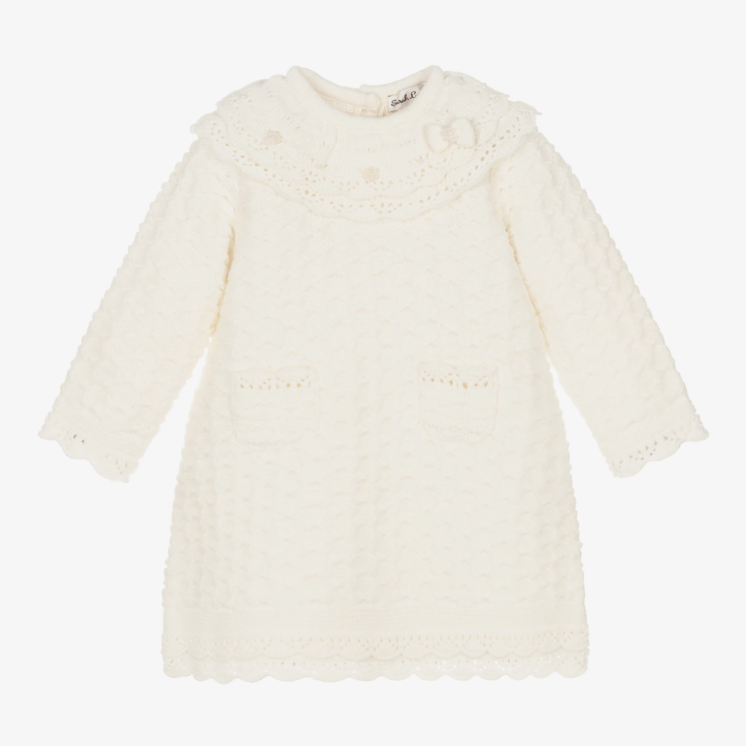Younger girls pretty ivory dress by Sarah Louise, knitted in soft acrylic with a lovely all-over pattern. It has a knitted ruffle collar with little pearl decorations and a sweet bow detail. The collar, cuffs, hem and pockets have scalloped lace knit trim and there are button fastenings on the back.