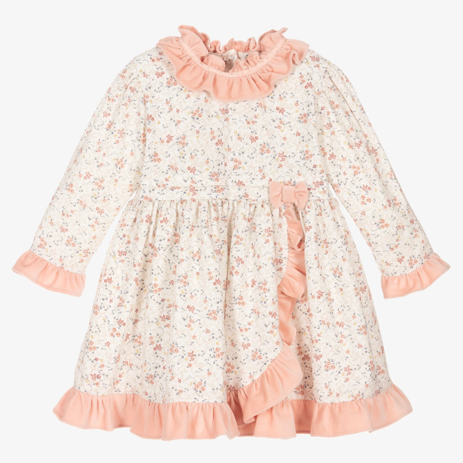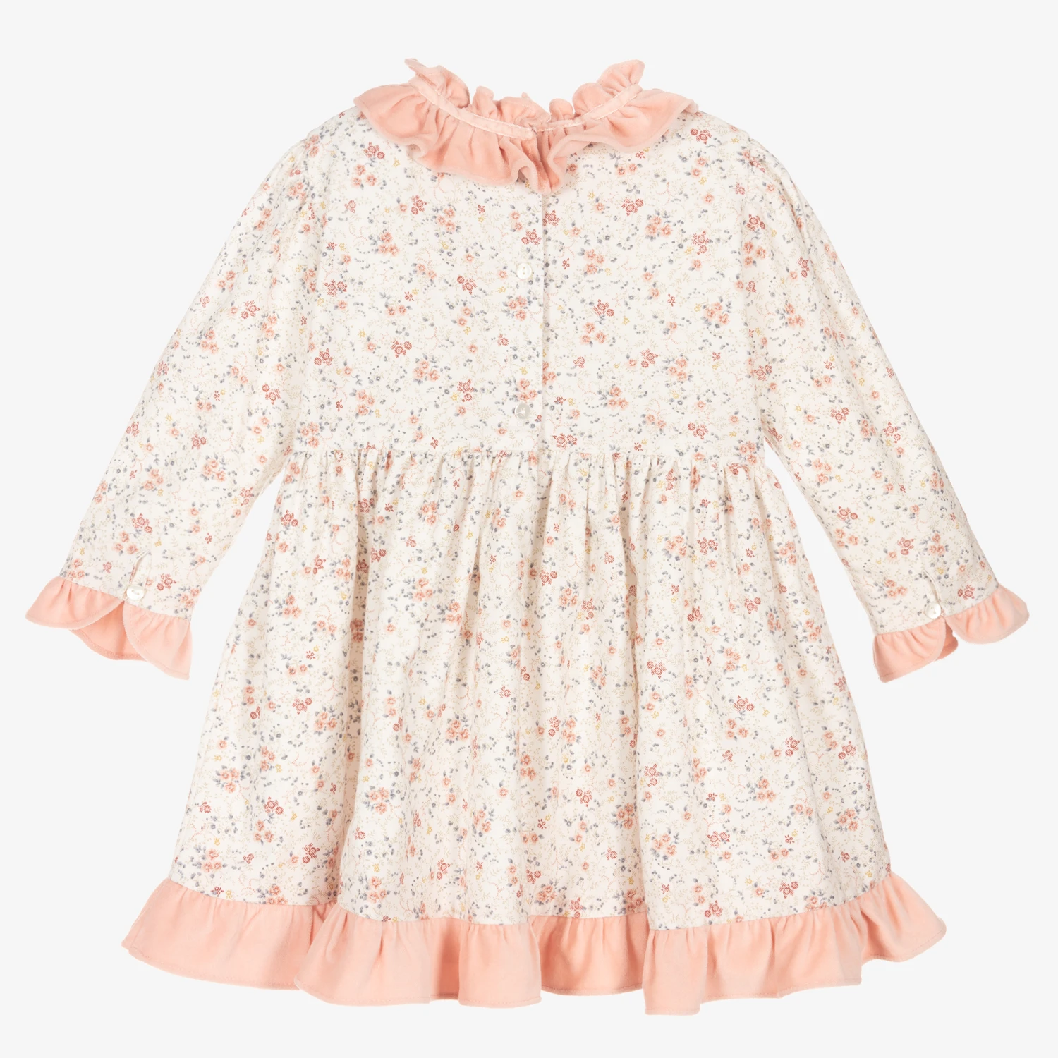 Pretty ivory and pink dress for girls by Sarah Louise, made in soft and lightweight cotton. It is patterned in a lovely pink and blue floral print, and has coral pink velvet ruffle trims on the collar, cuffs, and skirt. It is lined with soft voile and fastens with buttons.