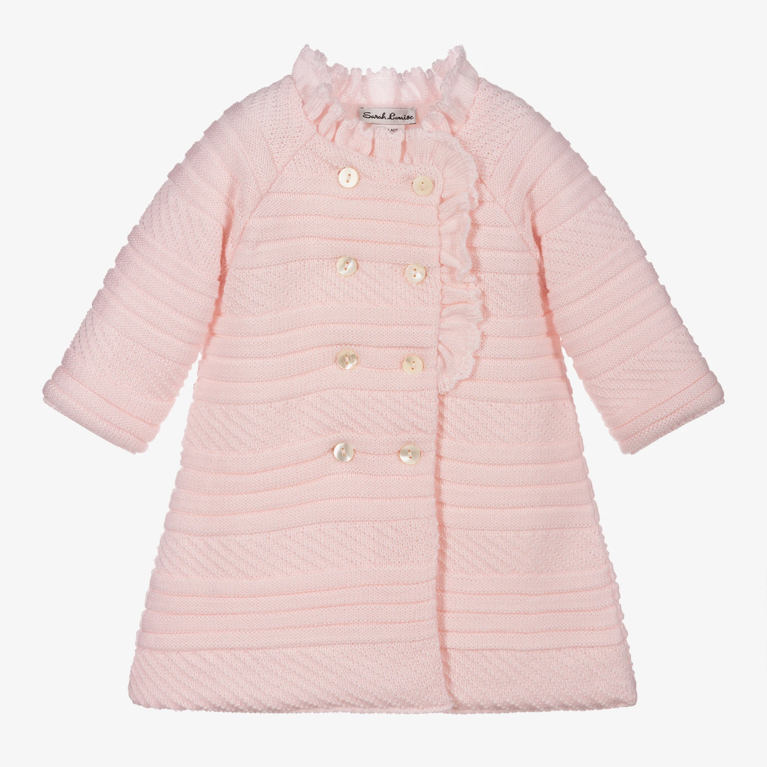 Pale pink coat for younger girls by Sarah Louise. Lightly padded and cosy, it is made with soft, midweight knitted acrylic. Frill-trimmed, it fastens with double-breasted pearlescent buttons on the front.