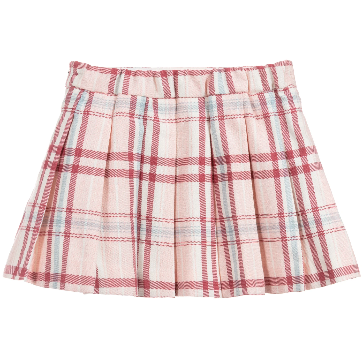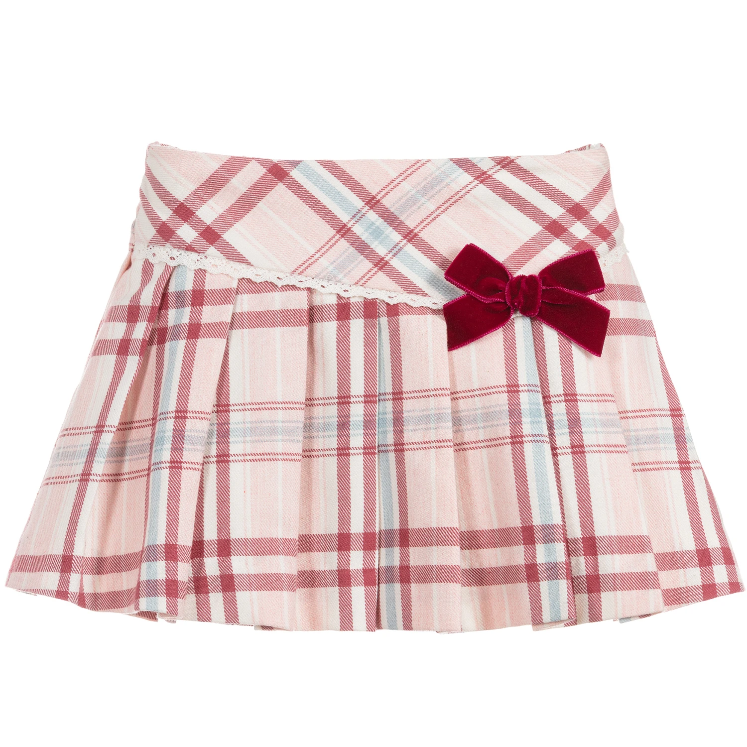 Girls pretty pink tartan check skirt by Sarah Louise, made in a pleated soft woven cotton blend with lace trim and a velvet bow on the front. The waist is partly elasticated with adjustable band and it has a concealed zip on the side.