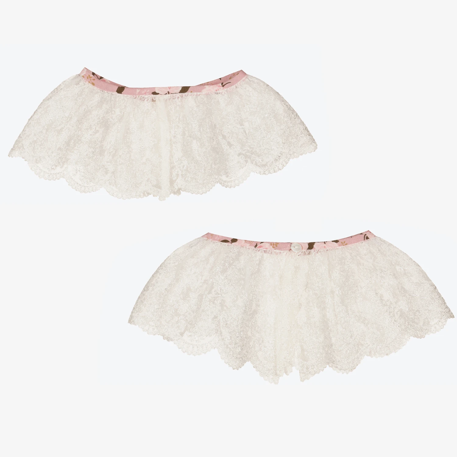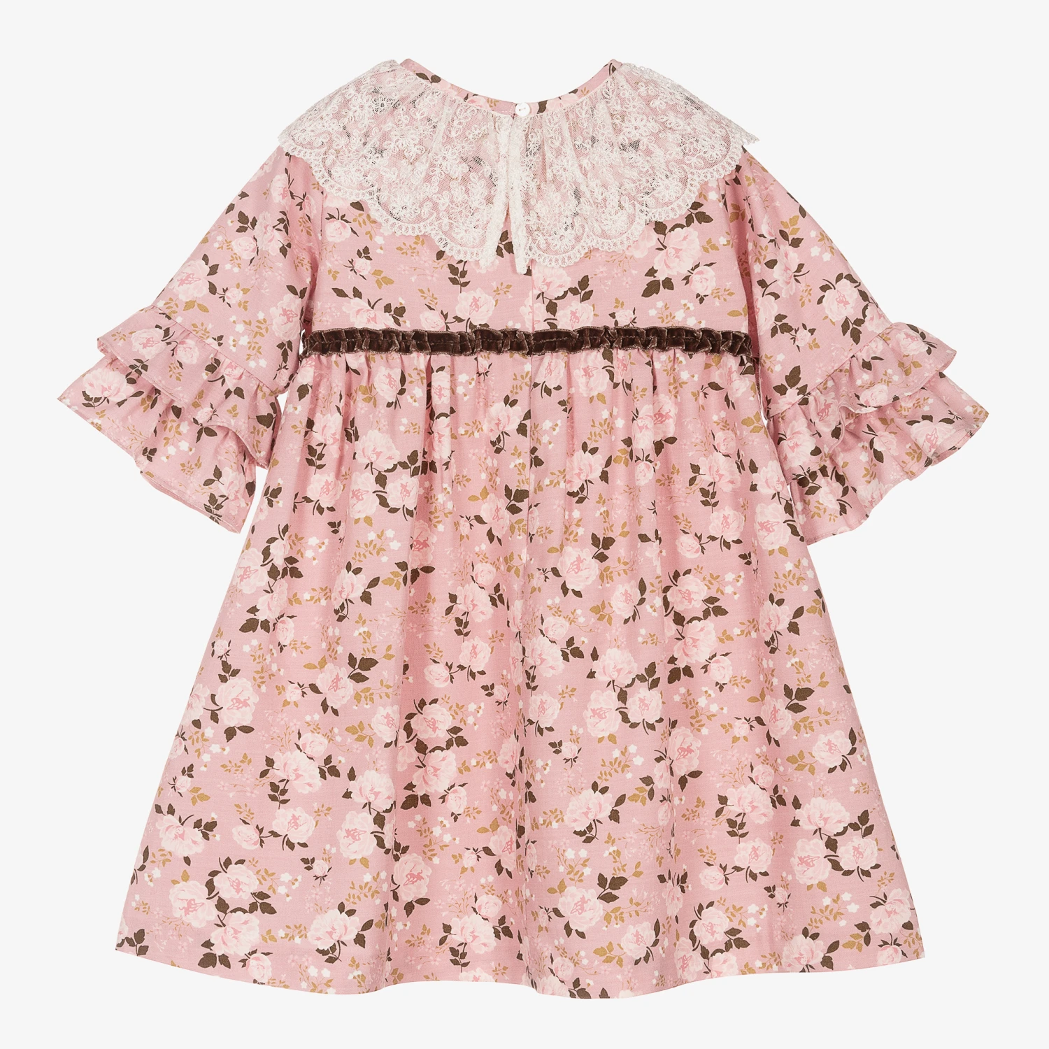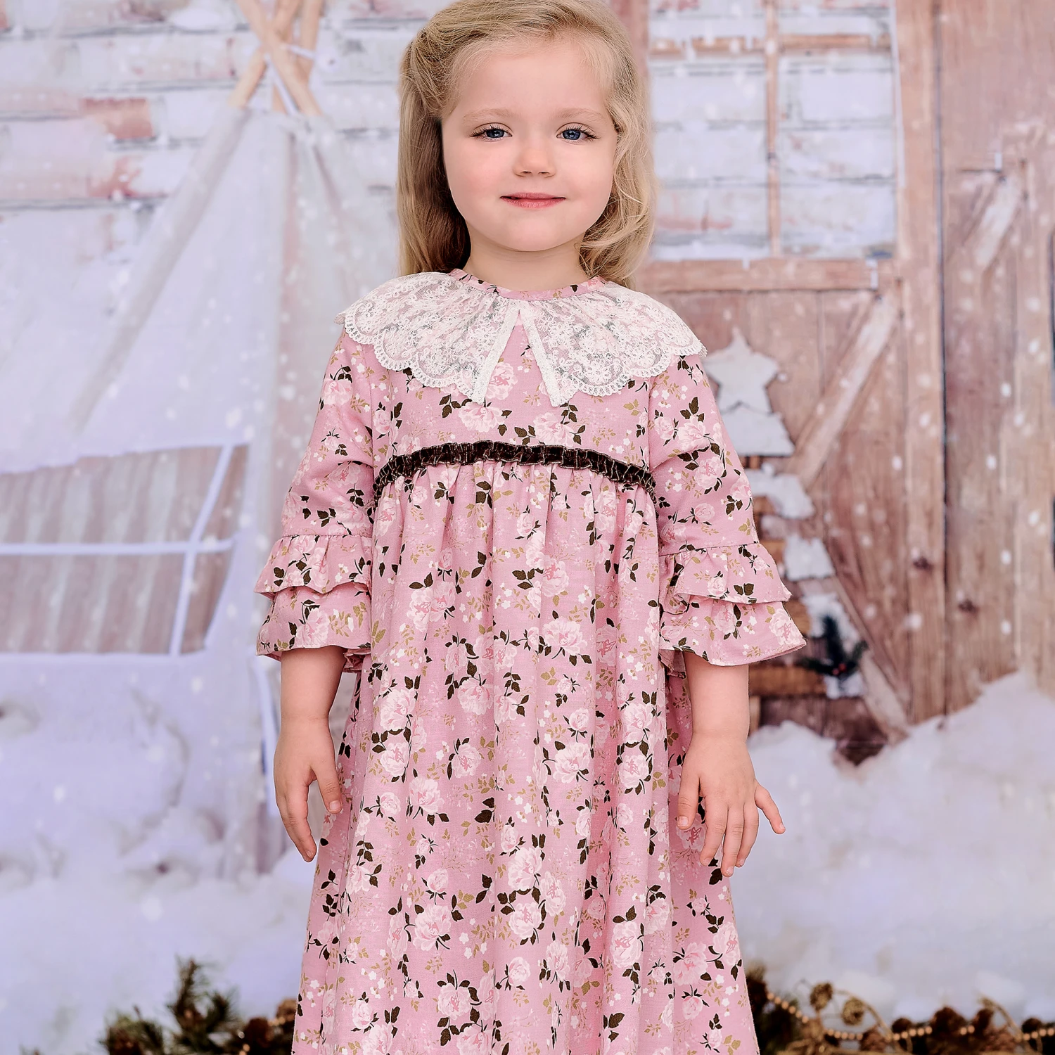 Pretty dusky pink cotton dress for girls by Sarah Louise, with a vintage floral print. Made in soft twill, it has a detachable, scalloped lace collar and mid-length sleeves with tiered frills. It has an empire line waistband in ruffled brown velvet and a satin lining for comfort. It fastens with a neat, concealed zip around the back.