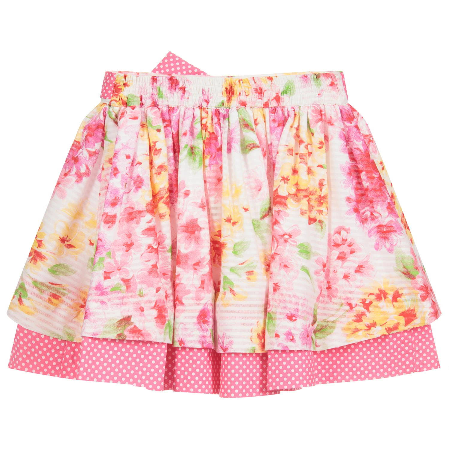 Designed for girls by Sarah Louise, a white and pink floral skirt with fun spotted trims. Soft and lightweight this casual skirt has a partially elasticated waistband and a fixed sash with large bow on the front.