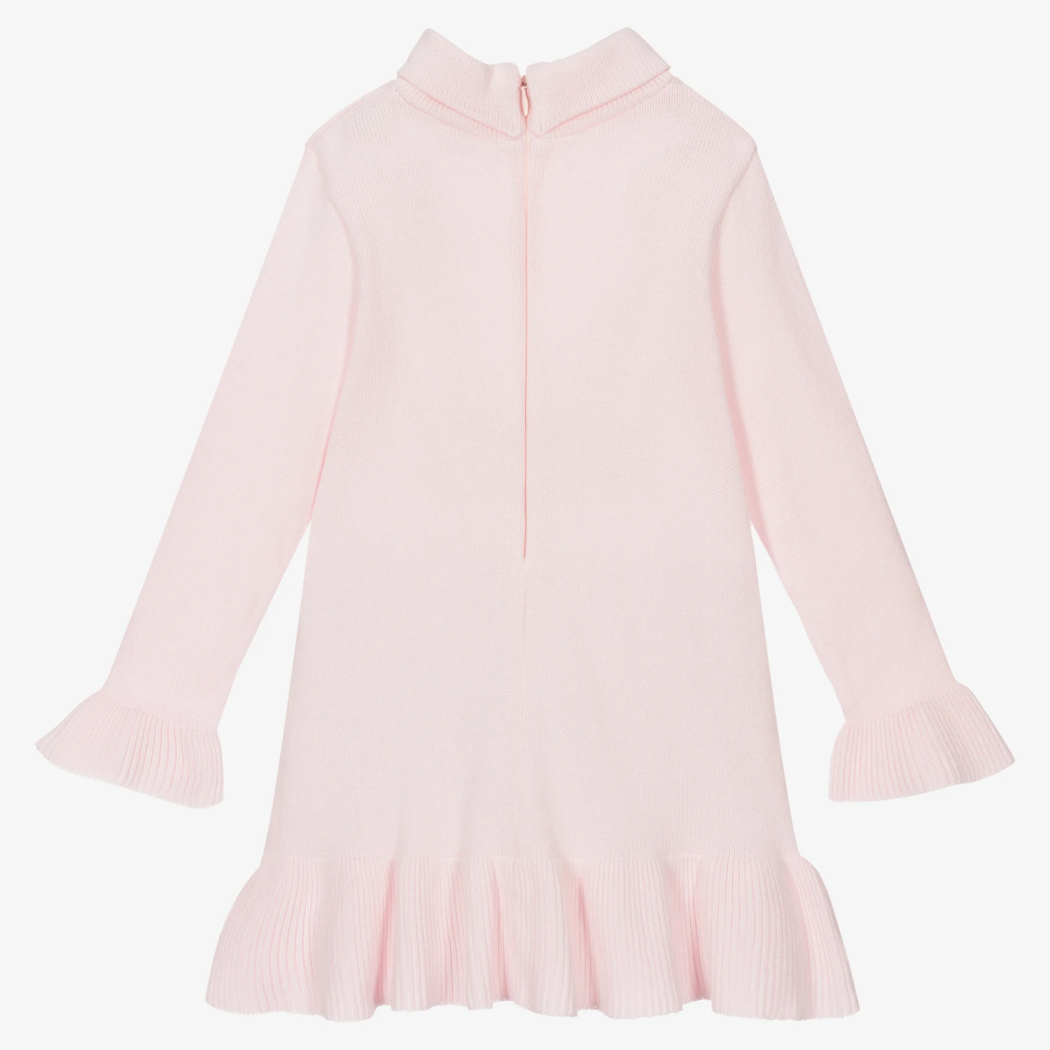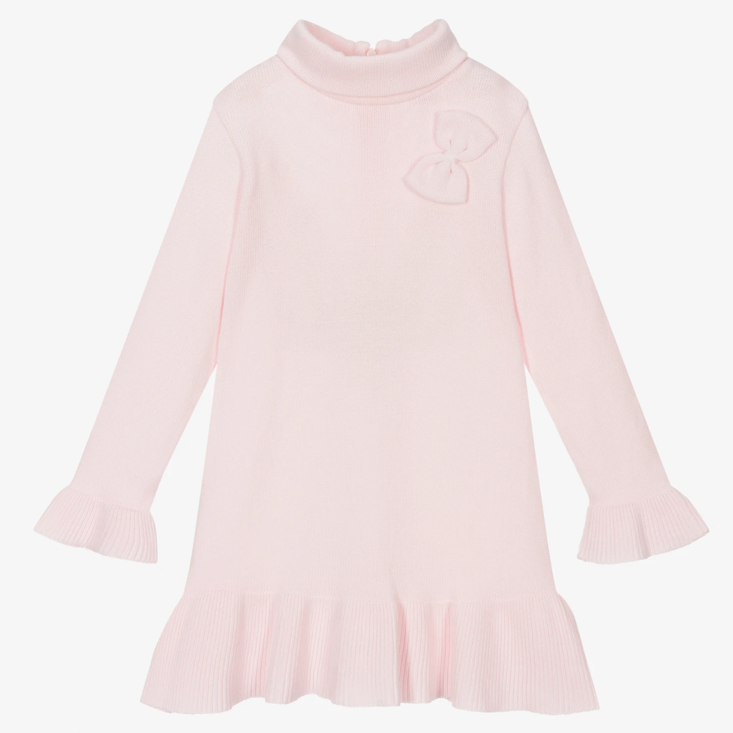 Pink knitted roll neck dress for girls, by Sarah Louise. Made with soft cotton, it has a pretty bow on the shoulder and a sweet ruffle hem with matching ruffle cuffs. There is a concealed zip fastening on the back for easy changing.