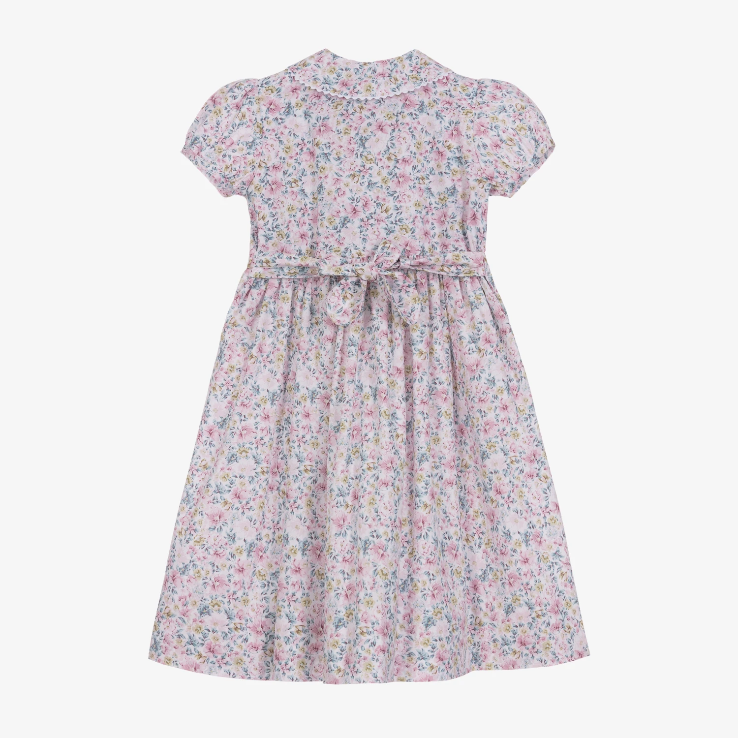 Exclusive to Childrensalon, this pretty pink floral print cotton blend dress for girls is by British brand Sarah Louise. Classically designed, it has a pretty rounded collar and puffed sleeves, with pin-tuck detailing on the bodice. Fully lined for comfort in a lightweight voile, it fastens at the front with decorative buttons and has an attached sash tie on the back.