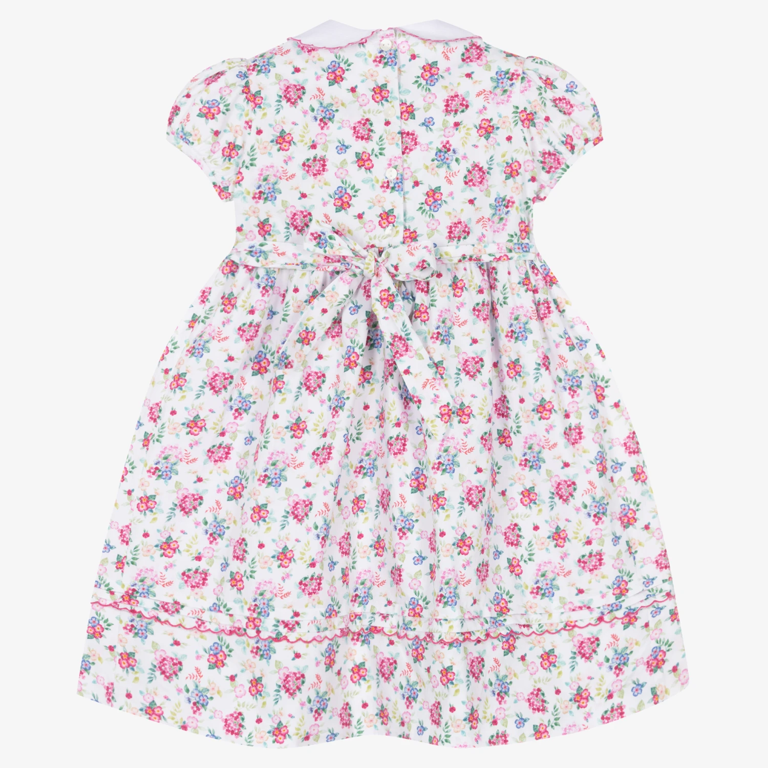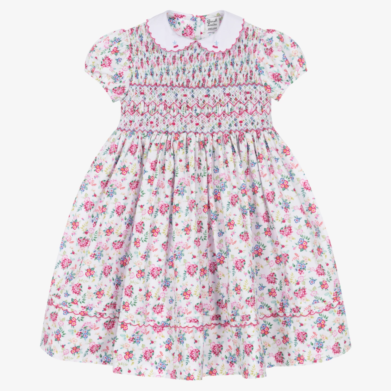 Exclusive to Childrensalon, a pretty dress for girls by Sarah Louise, in white with a lovely pink floral pattern. Made in a lightweight cotton blend and fully lined, it has a beautiful hand-smocked bodice with hand-embroidered detail. The sweet white collar has pink scalloped edging and delicate pink and blue floral embroidery. To complete the traditional look, the dress has puffed sleeves, a full gathered skirt and button fastenings on the back with a sash tie detail.