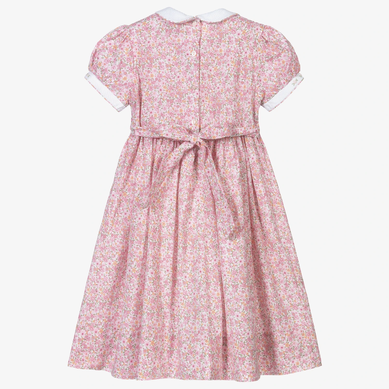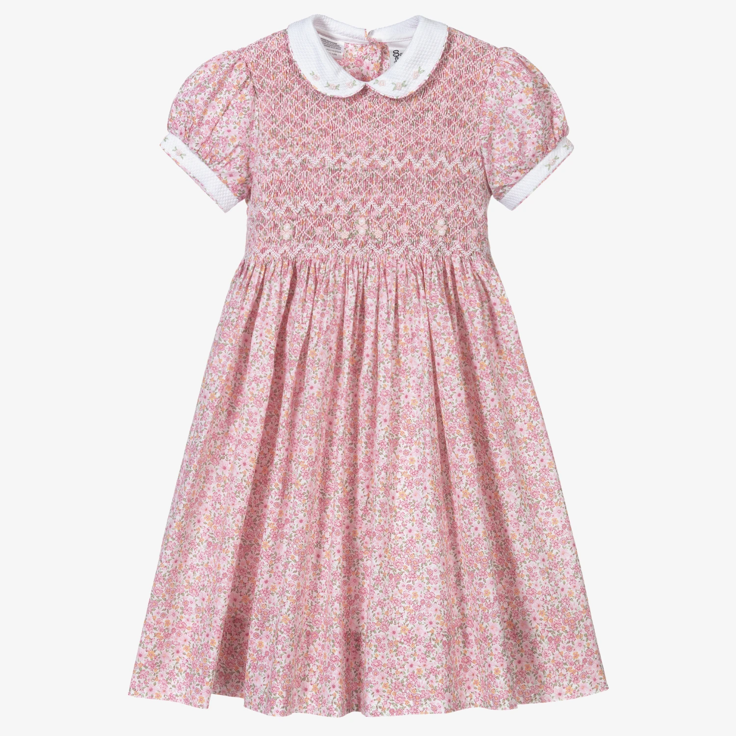 Girls traditional heritage style dress by Sarah Louise, with a pink and green floral pattern. It has a beautiful hand-smocked bodice, with hand-embroidered flowers. Fully lined, it is made in soft and lightweight cotton, with an attached sash belt. It is exclusive to Childrensalon.