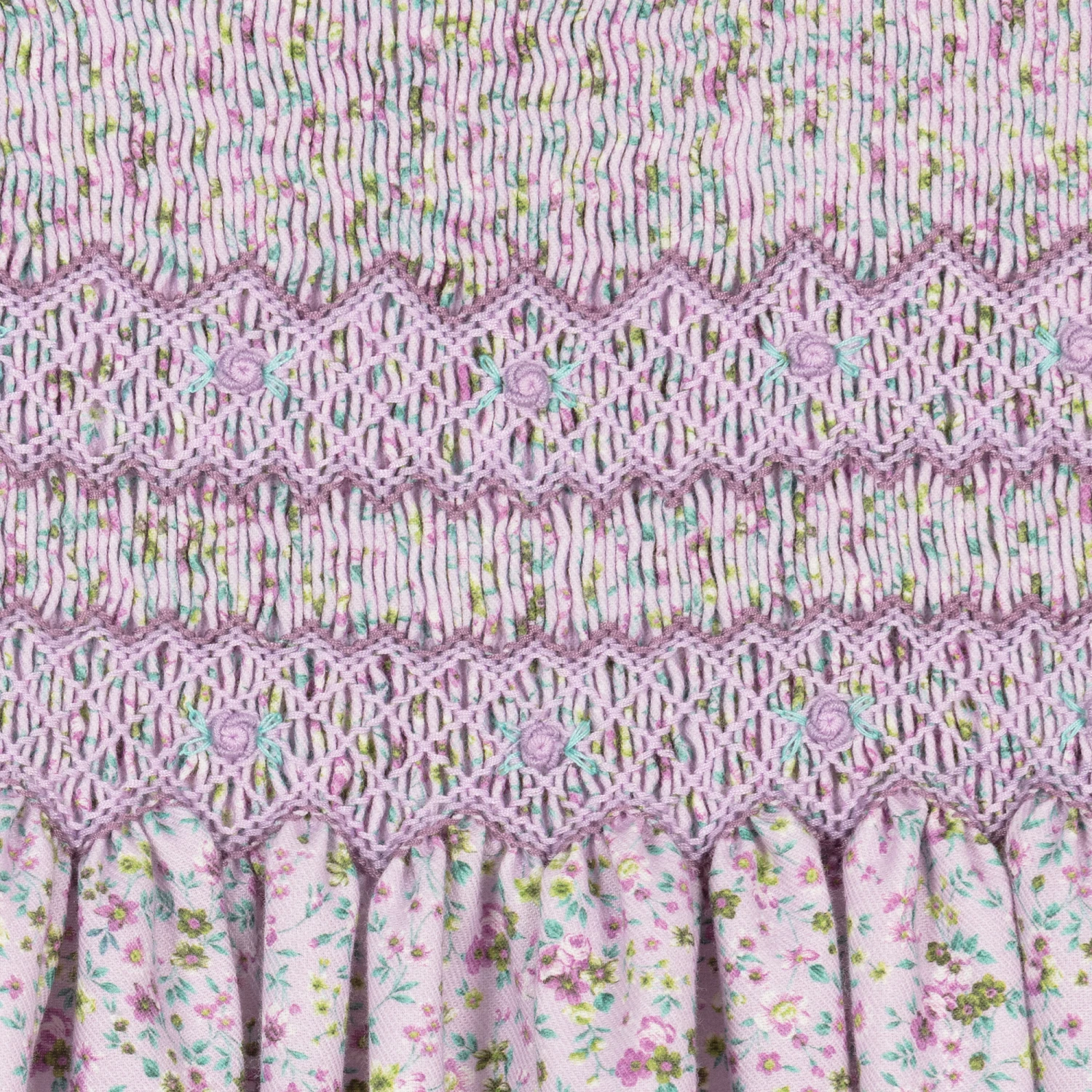 Pretty purple cotton dress for girls by Sarah Louise, fastening with buttons on the back. It has a gorgeous all-over ditsy floral print in shades of pink and green and a lightweight lining on the skirt. The bodice is beautifully hand-smocked, with hand-embroidered roses and diamond stitching.
