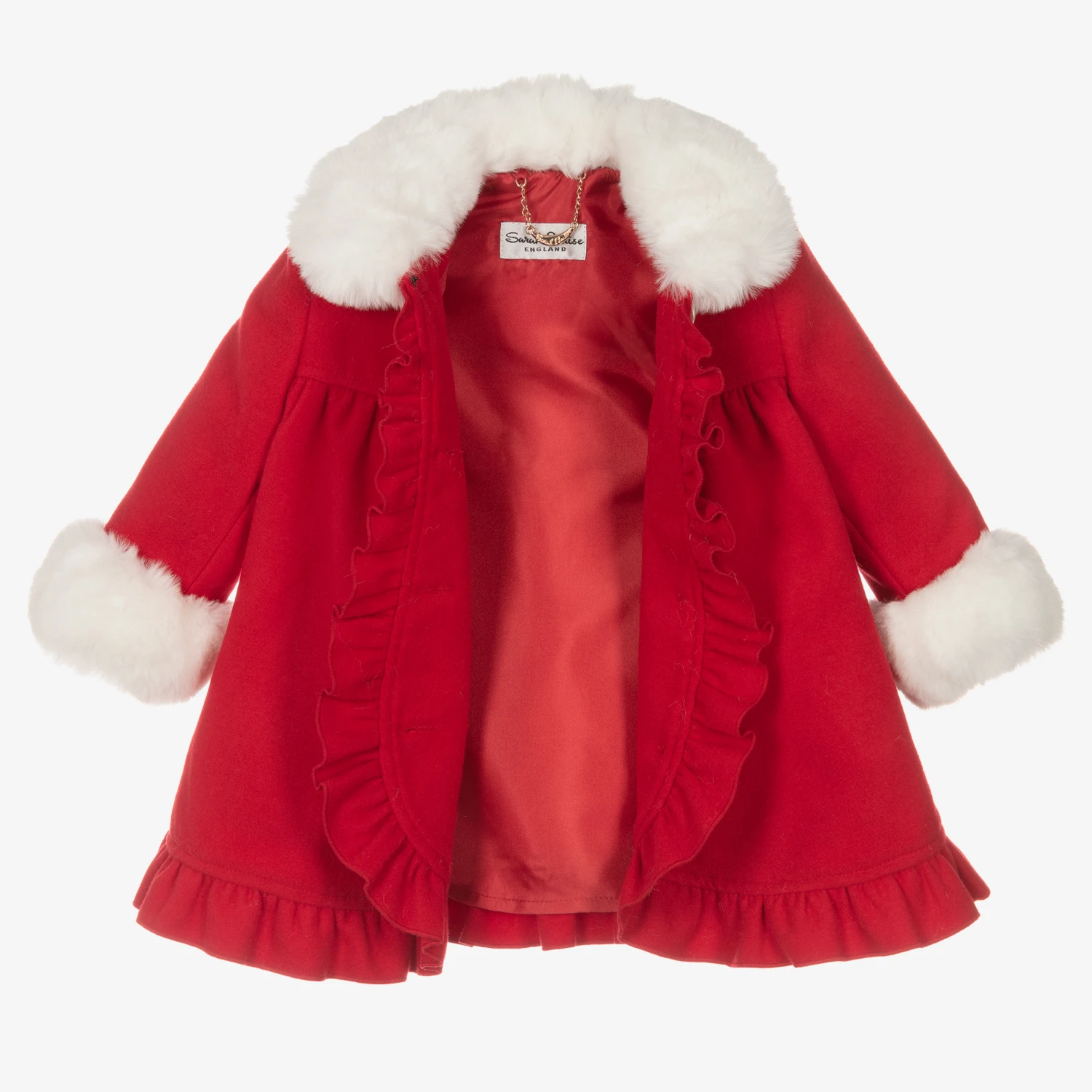Red coat and bonnet set for little girls, by Sarah Louise, made in a soft felted fabric. Both pieces are lined with silky, smooth satin and trimmed with white faux fur. The bonnet fastens with ribbon ties under the neck, which can be detached if needed. The coat has beautiful mother-of-pearl button fastenings.