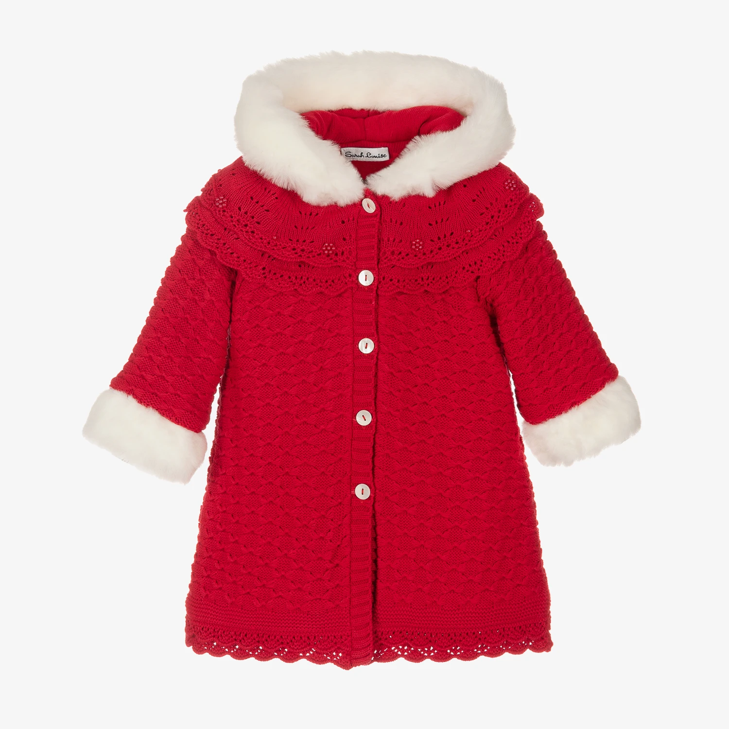 Younger girls red hooded coat from Sarah Louise, with ivory faux fur trim. Knitted in soft mid-weight acrylic with a pretty all-over pattern, it has a layered collar with pearl decorations and lovely scalloped lace knit edging. Lightly padded, it has a soft knitted lining for added warmth.