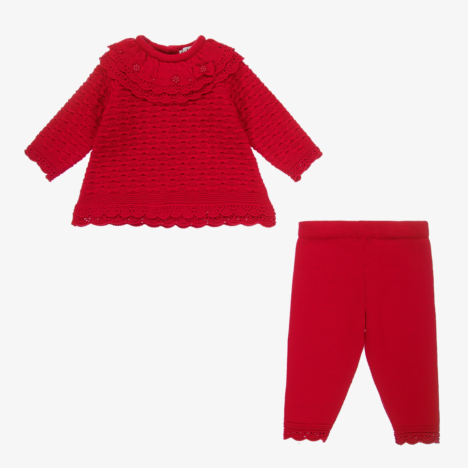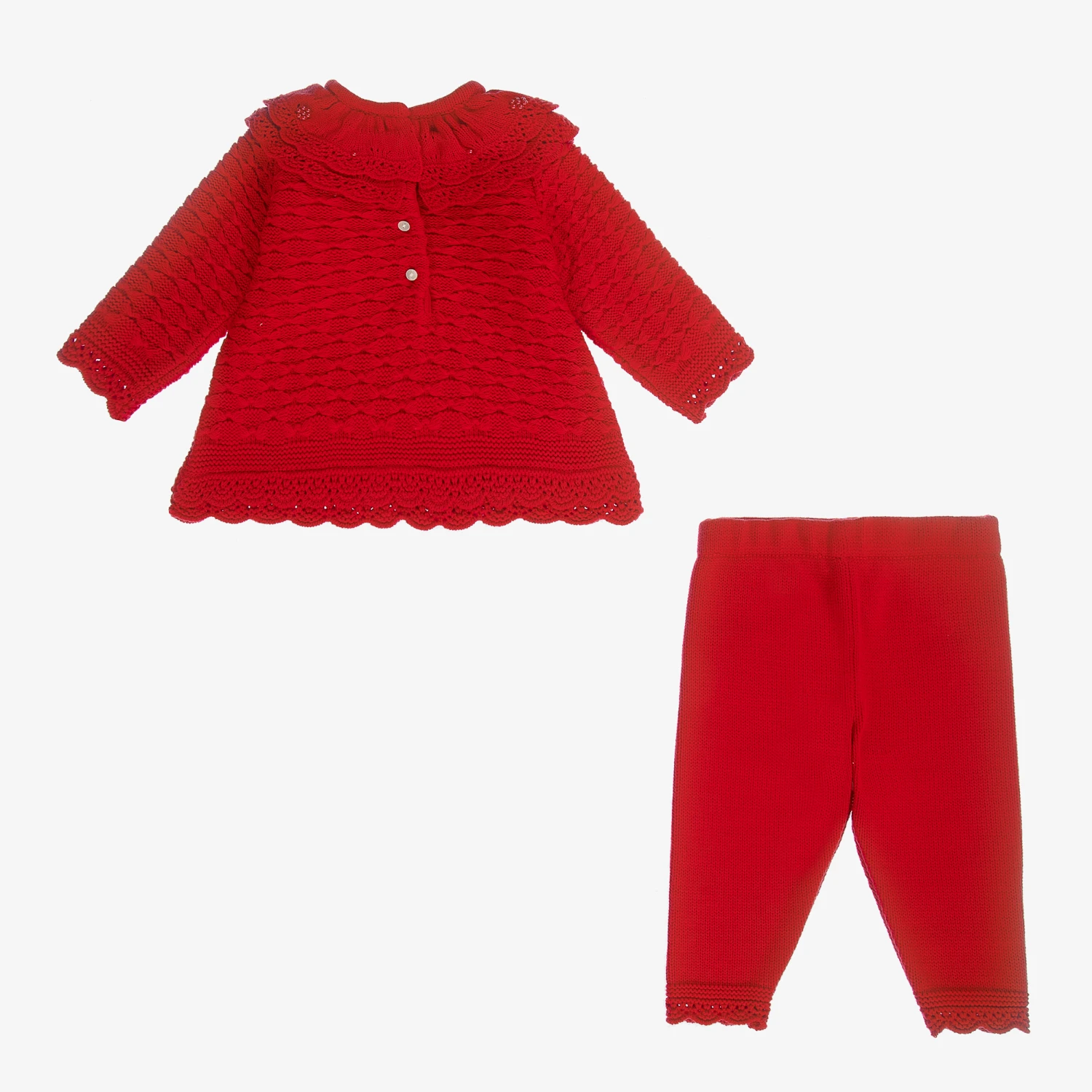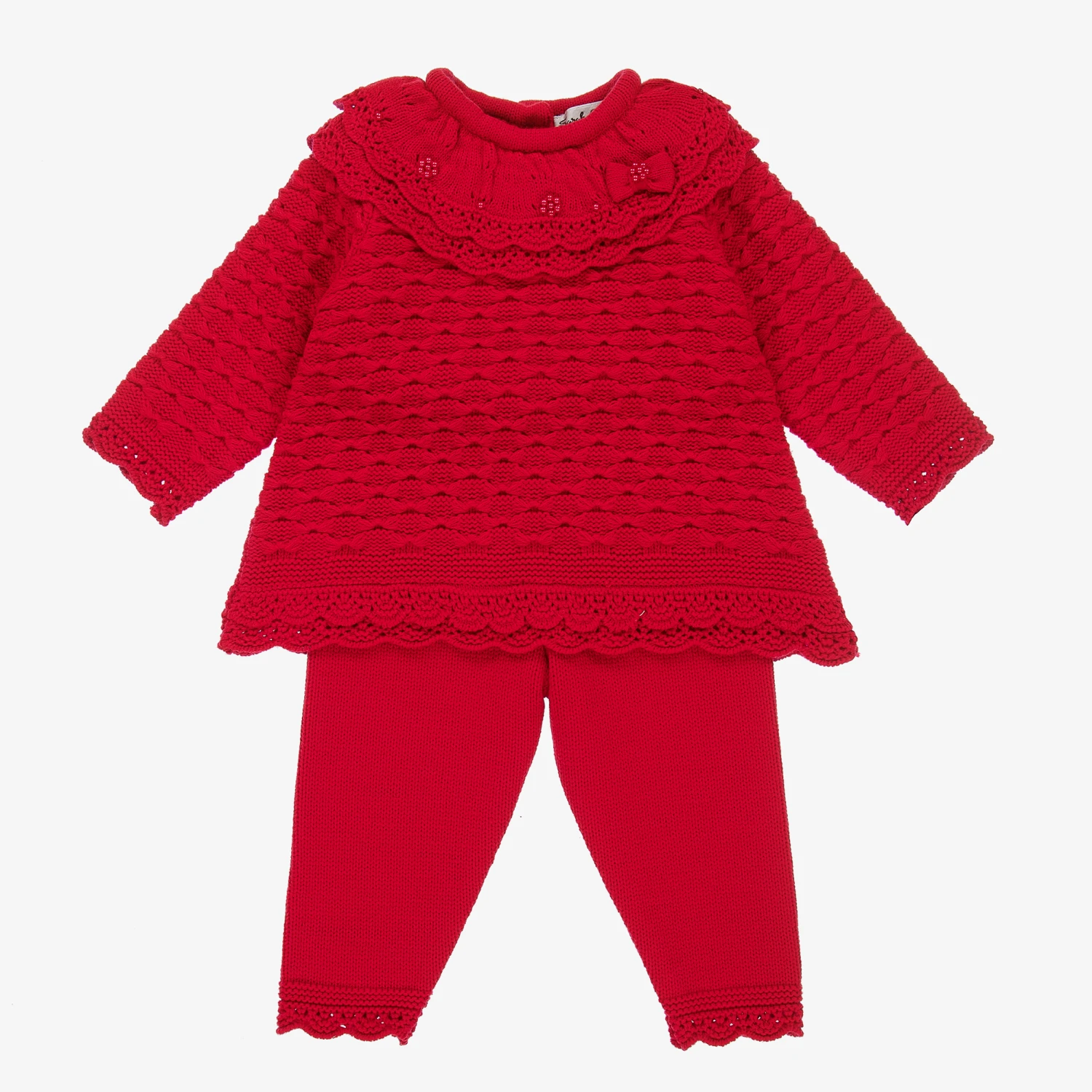 Younger girls pretty red trouser set by Sarah Louise, knitted in soft acrylic. The patterned top has scalloped lace knit trim and a lovely ruffle collar with little pearls and a sweet bow detail. The plain knit trousers have scalloped lace knit cuffs and a gently elasticated waistband.