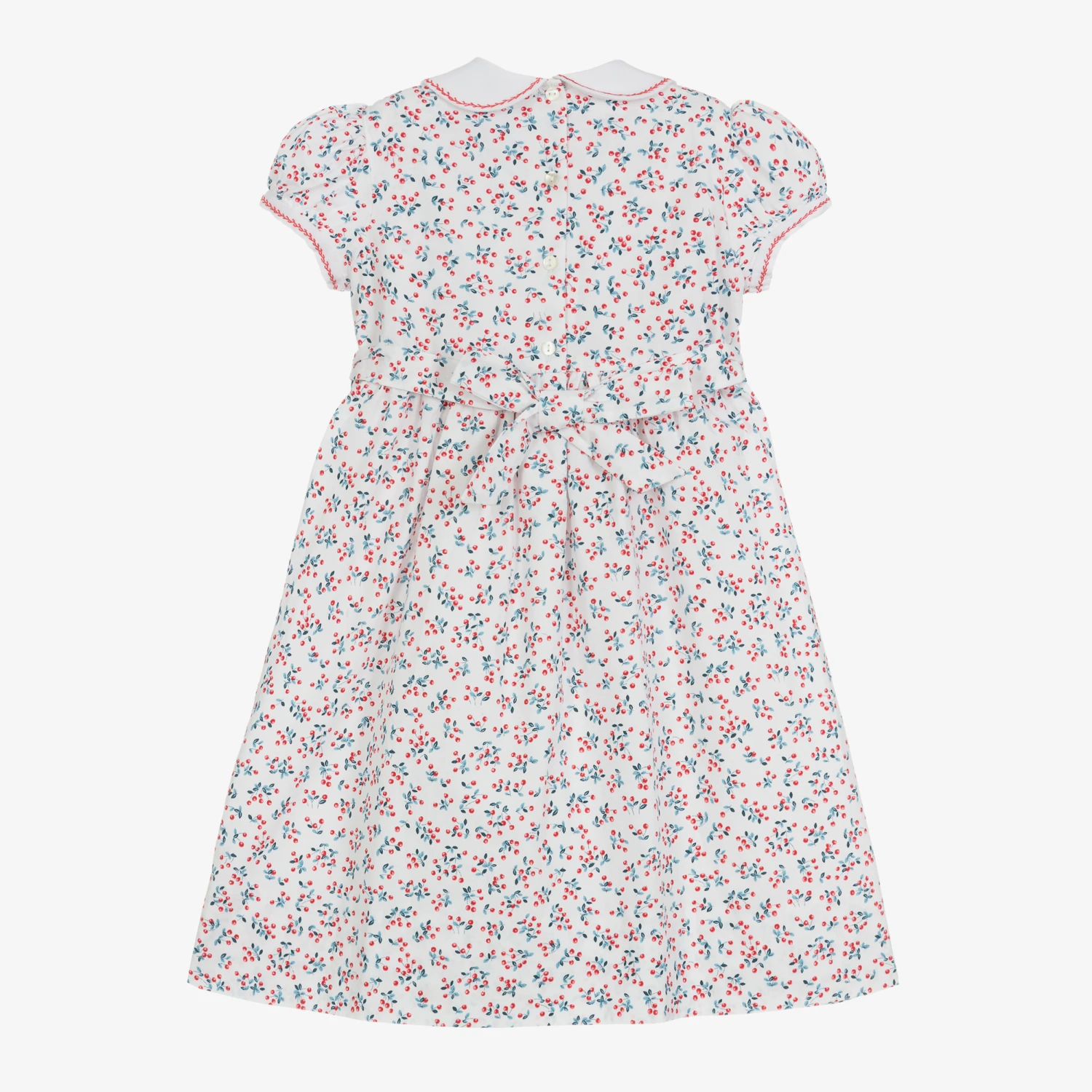 Exclusive to Childrensalon, this white cotton blend dress by British brand Sarah Louise has a pretty red berry print. This traditional style dress has a beautiful hand-smocked bodice and rounded collar with red and blue hand embroidery. Fully lined for comfort in a lightweight voile, it fastens at the back with buttons and an attached sash tie.