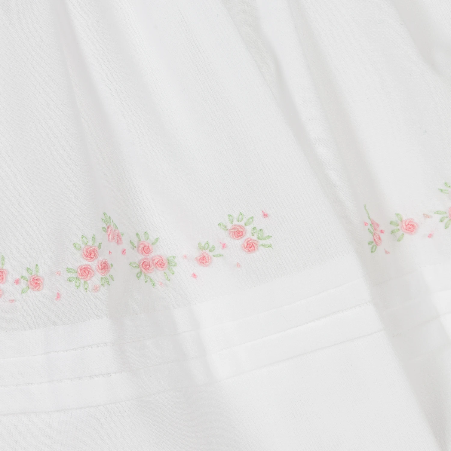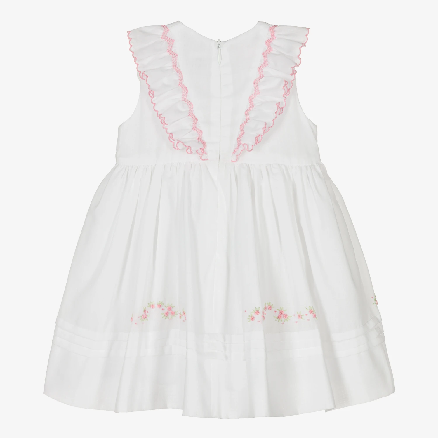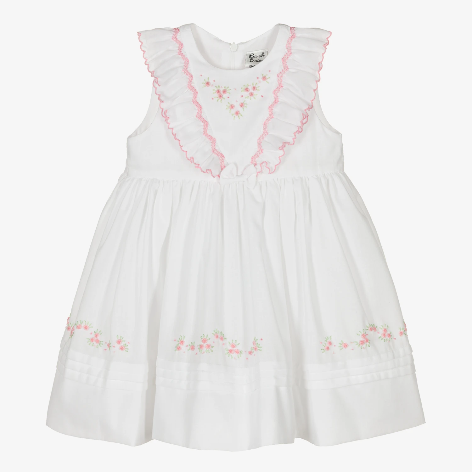 Sweet white dress for little girls by classic British brand Sarah Louise, made in a lightweight cotton blend. In a traditional style, it has pink hand smocking on the lovely V-shaped ruffle on the bodice, with hand-embroidered rosebuds and a little, fixed bow. There is matching floral embroidery on the hemline of the gathered skirt, with pretty pintucks all around. The dress is fully lined in voile for comfort and fastens with a concealed zip on the back for a neat finish.