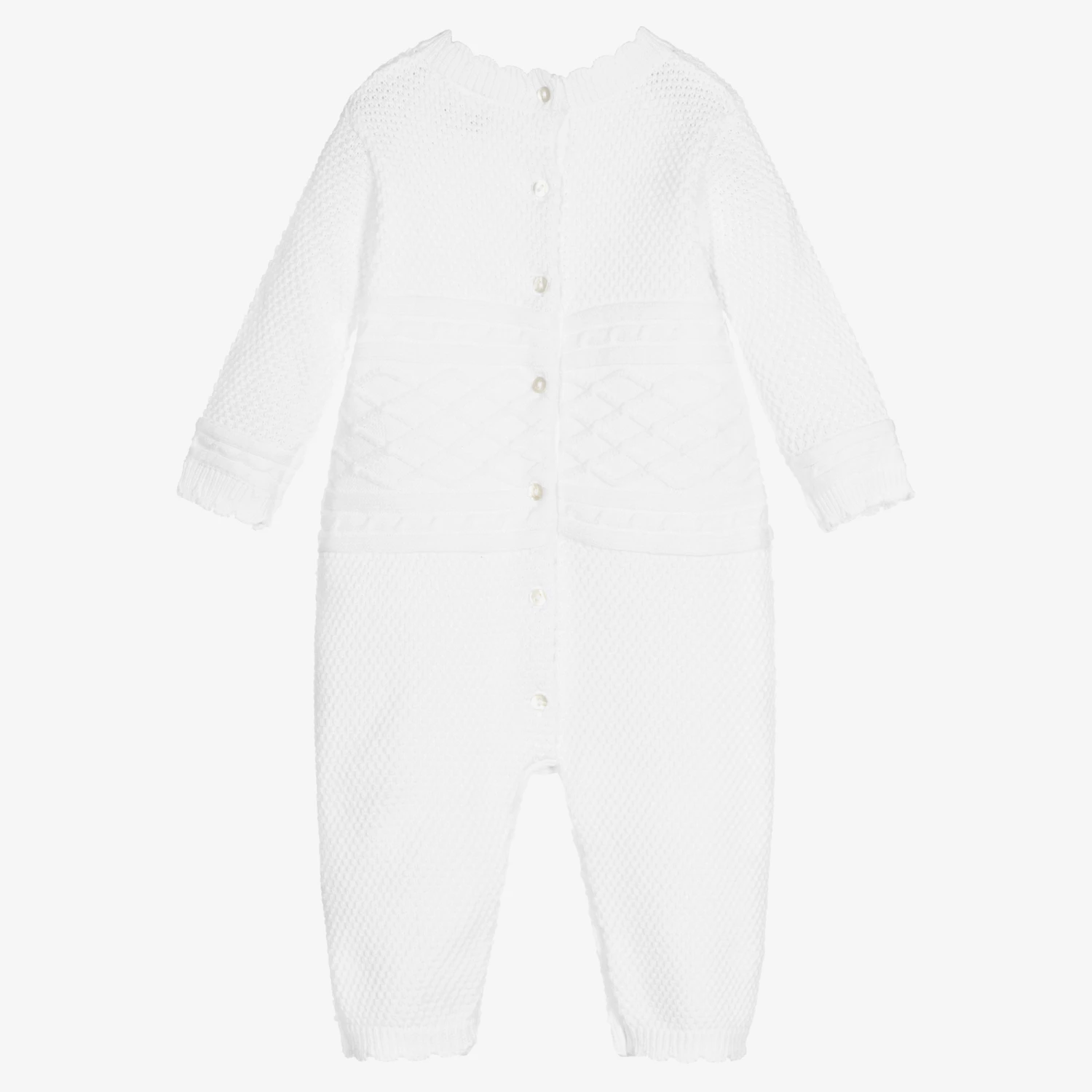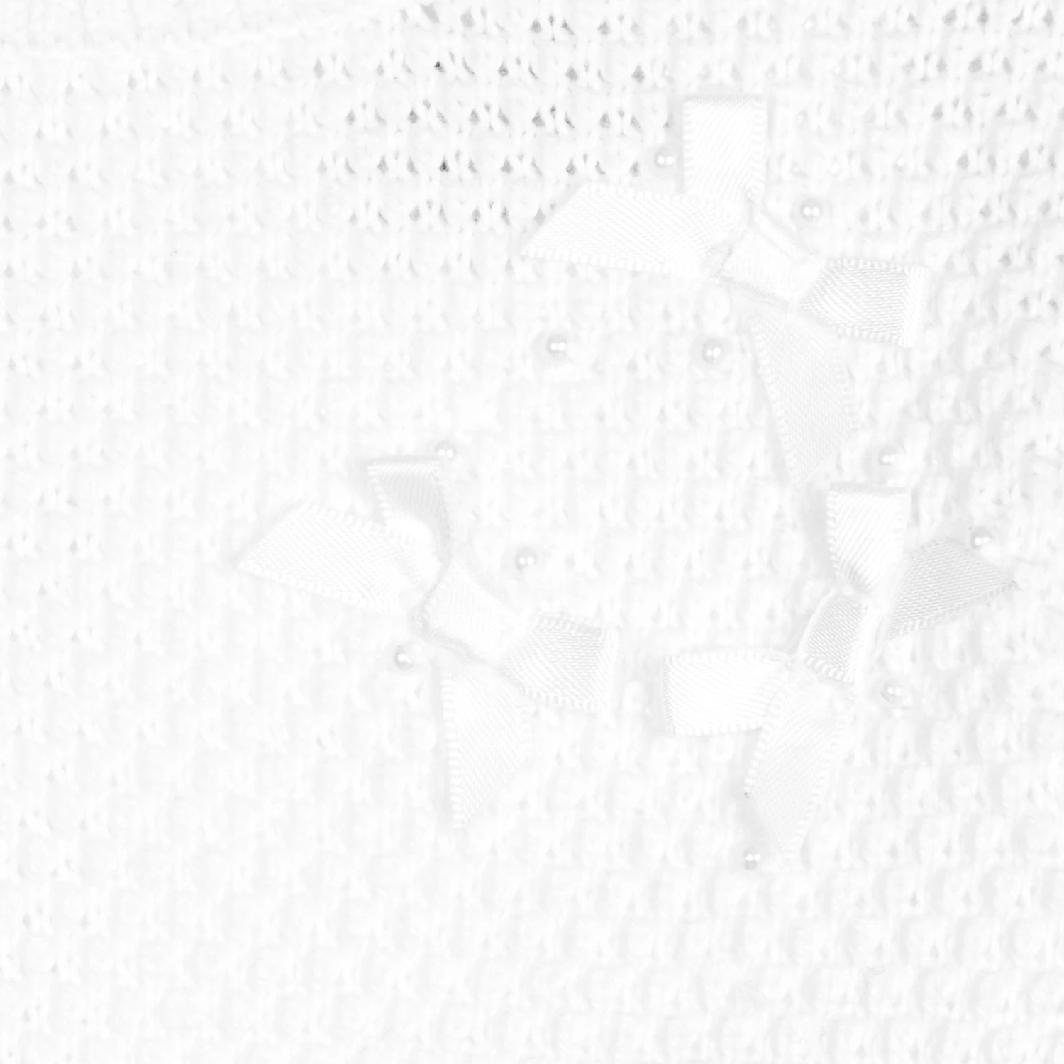 White romper for baby girls by Sarah Louise. Knitted in soft cotton moss stitch, it has a cable patterned panel and matching detail on the cuffs. There are pretty satin bows and pearls on the chest and the babysuit has scalloped trim.