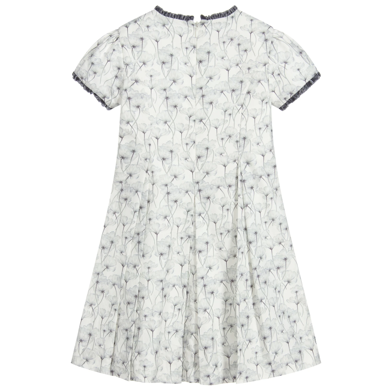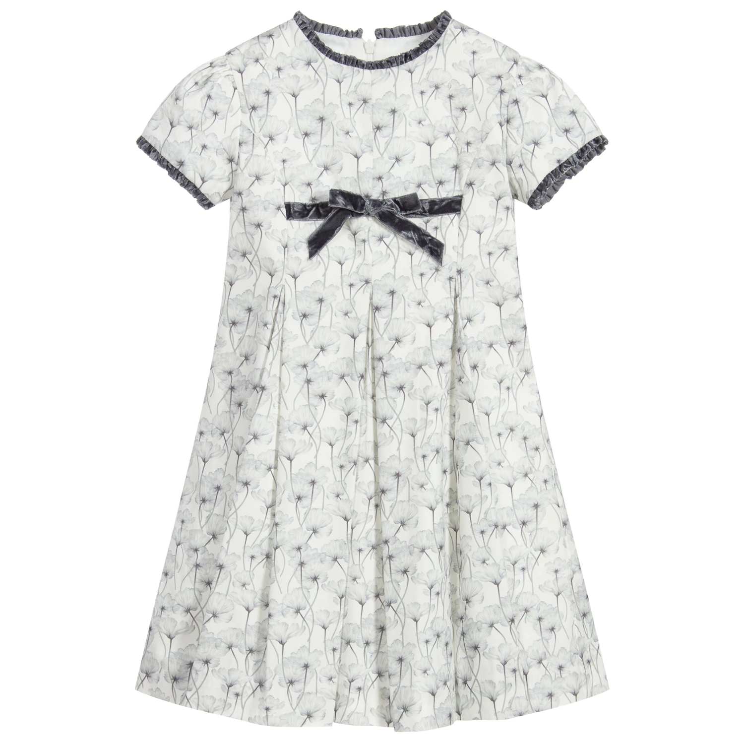 A gorgeous white and grey dress for girls by Sarah Louise, made in a soft, lightweight cotton blend. It has a pretty grey floral print, with dark grey crushed velvet ribbon details, and a zip fastening on the back.