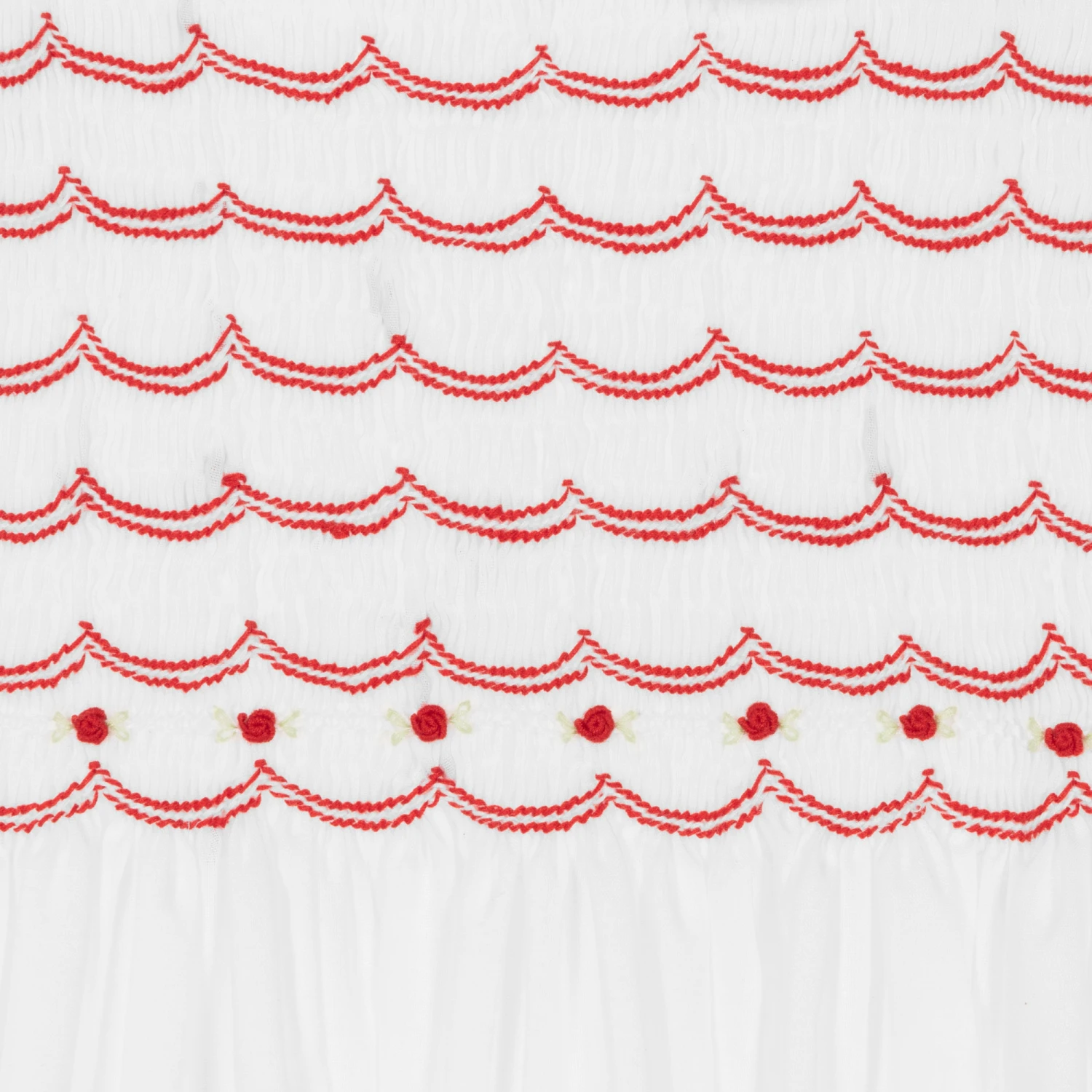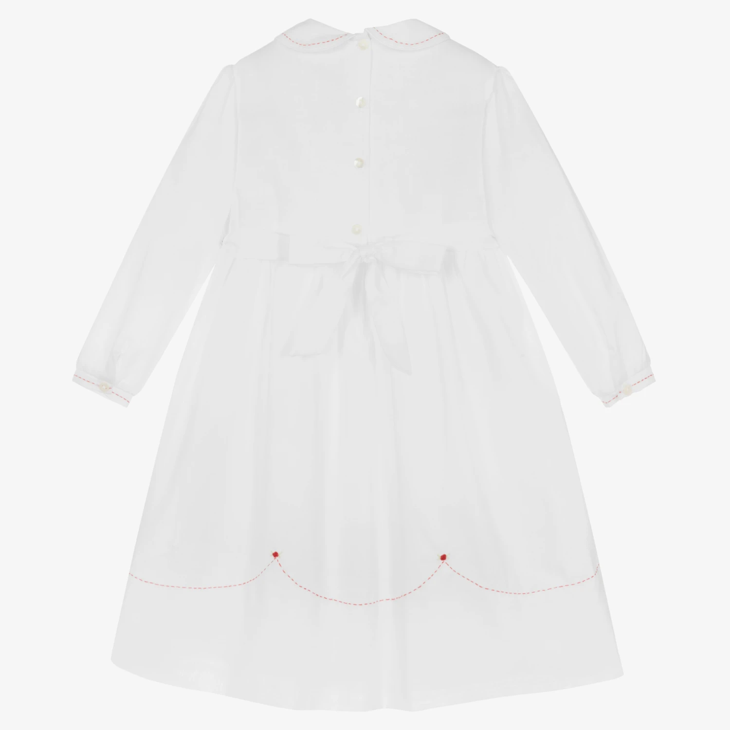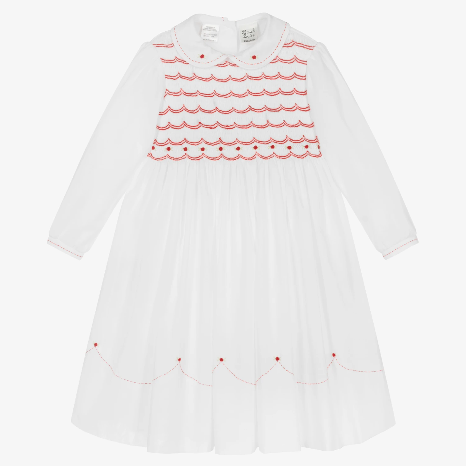 Lovely white dress for girls, by British brand Sarah Louise. Woven in soft cotton, it has a beautifully hand-smocked bodice with a traditional ruffle collar. The collar, hem and cuffs have delicately hand-embroidered red stitching and rose buds for a classic touch. Fastening with buttons on the back, the timeless dress has a lightweight lining for comfort and gently puffed sleeves for style.
