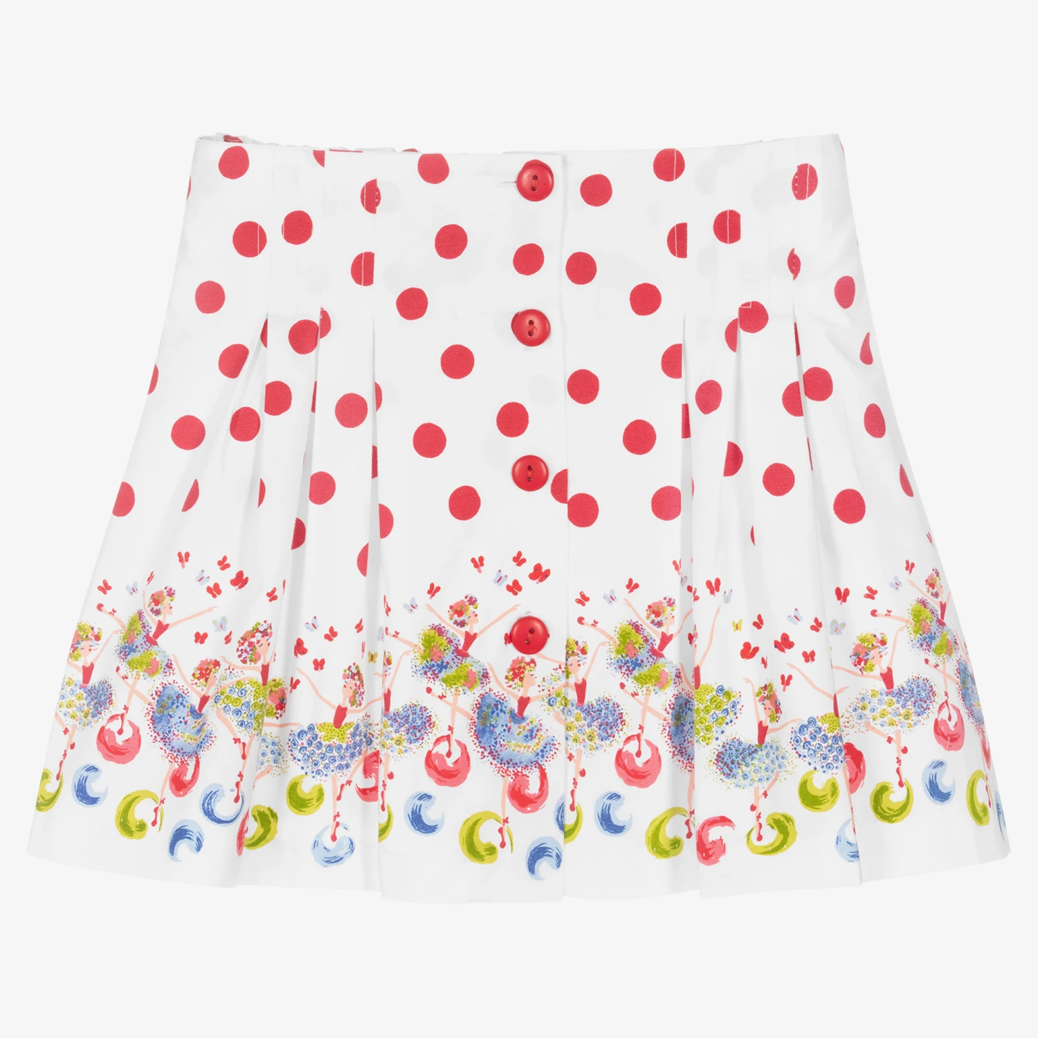 Sweet white skirt for girls from Sarah Louise, prettily patterned with dots and ballerinas in red, blue and green. Pleated at the front and gathered at the back, it has a lovely flared shape and fastens with red buttons down the front. It is made in cotton-rich poplin with a lightweight lining for comfort, and the waistband is adjustable for a good fit.