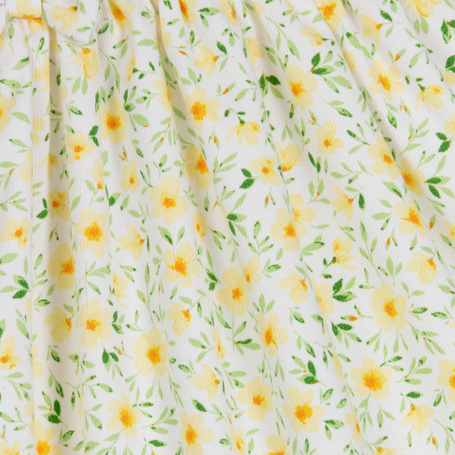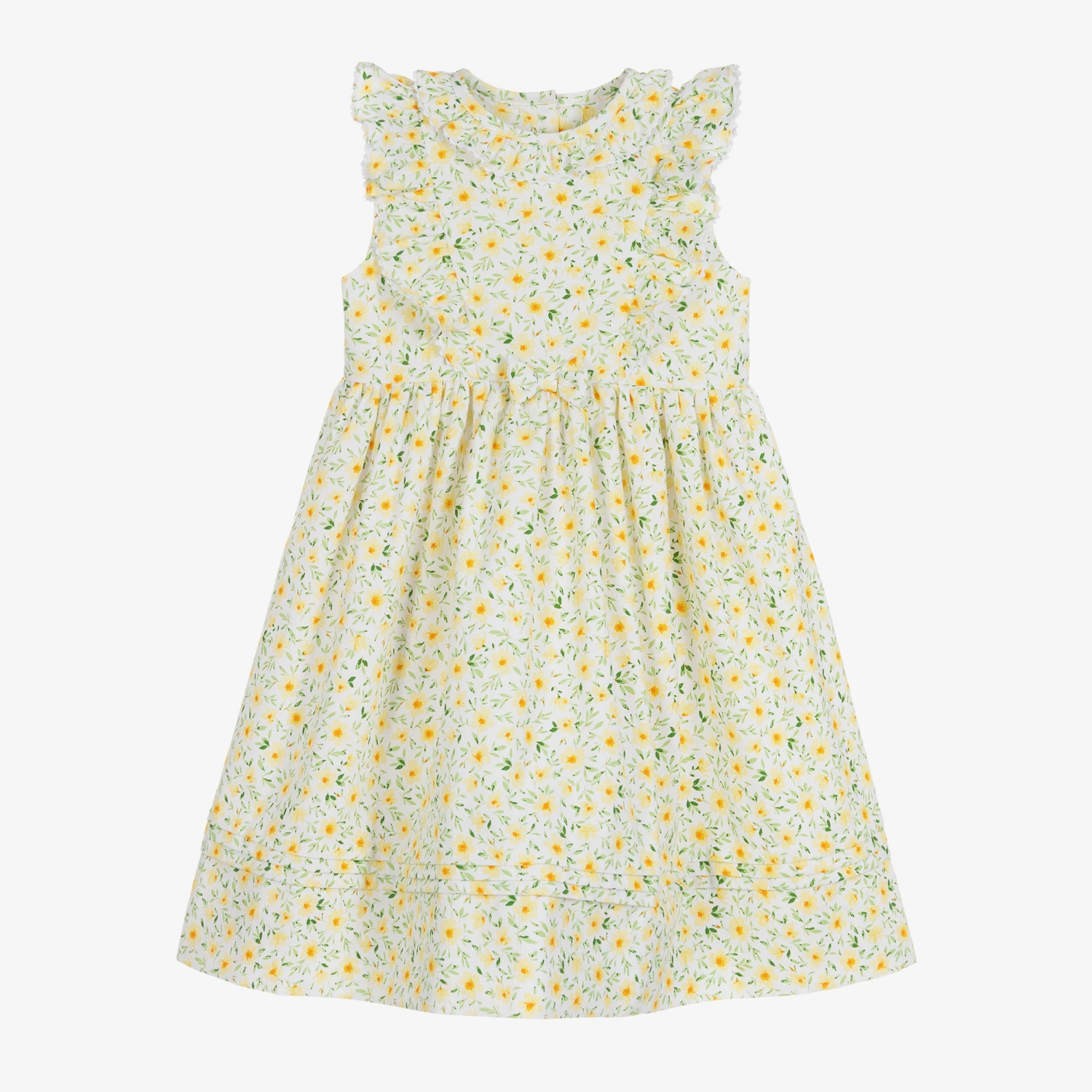 A traditional yellow floral dress for little girls by British brand Sarah Louise, made in a soft cotton blend fabric. Fully lined for added comfort, it has pretty ruffles over the shoulders and a rounded collar. There is a sweet bow attached to the girly gathered skirt and it fastens with buttons on the back.