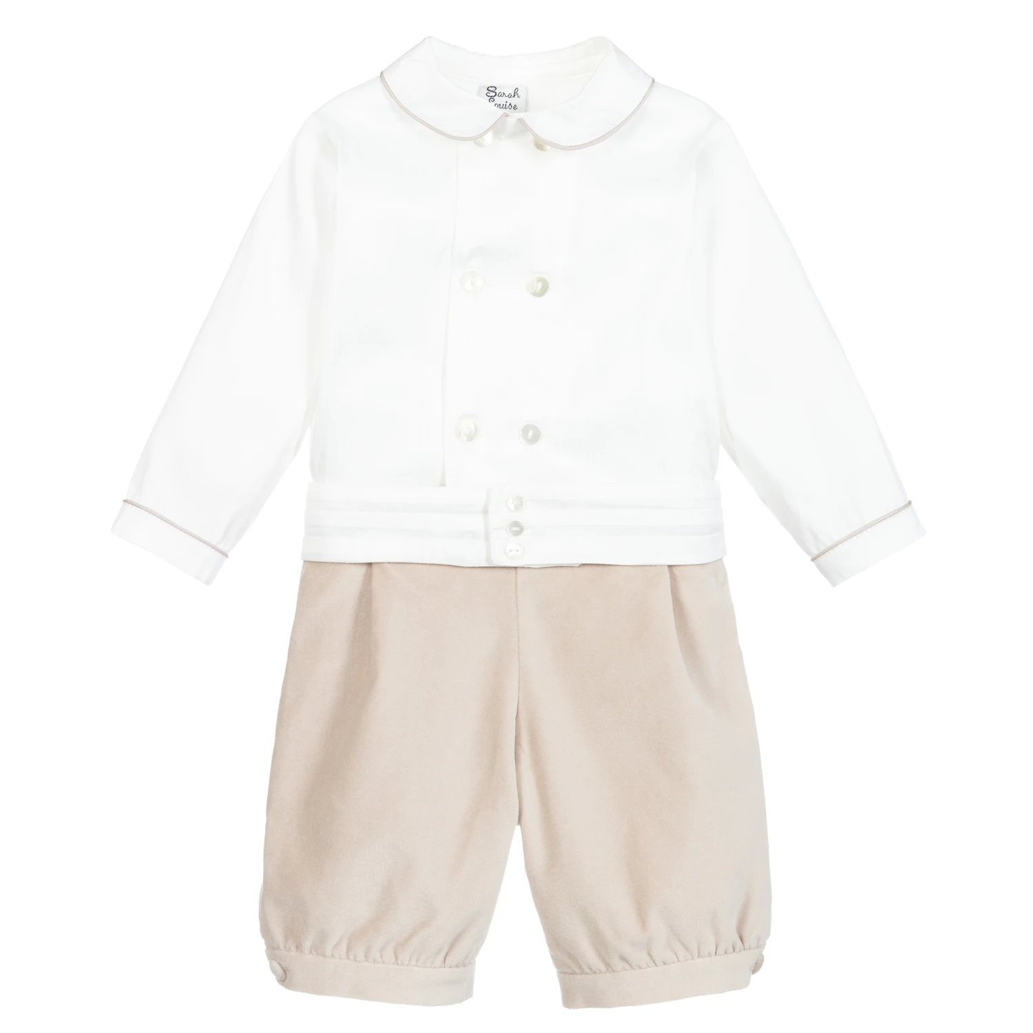 Little boys smart ivory and beige shorts set by Sarah Louise. The ivory double breasted shirt has a slight sheen and beige trims on the collar and cuffs. The knickerbocker style beige cotton velvet shorts are part elasticated for easy pull-on and has a silky lining. A pleated ivory cummerbund adds a lovely finish to the outfit.